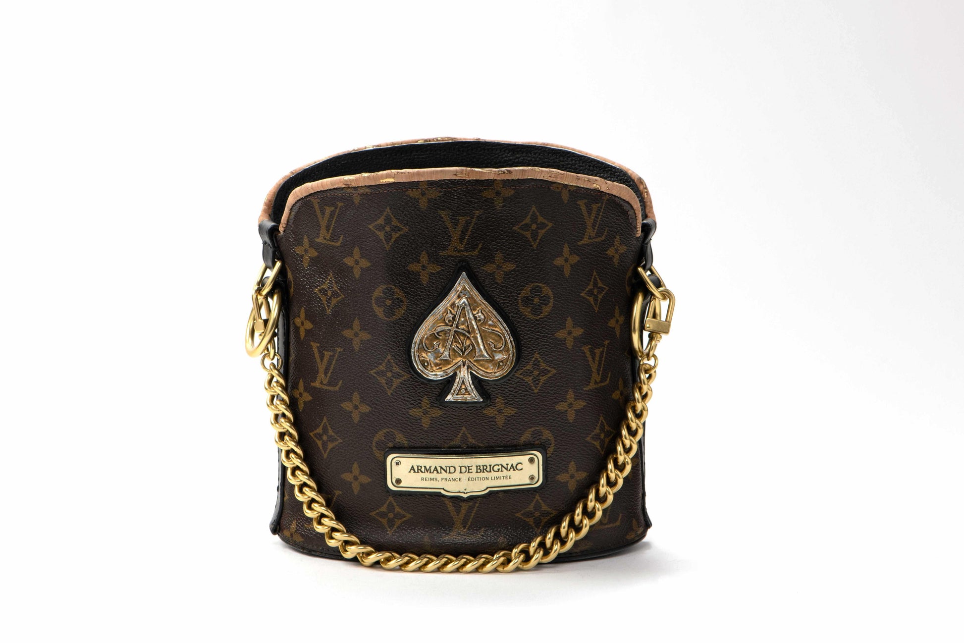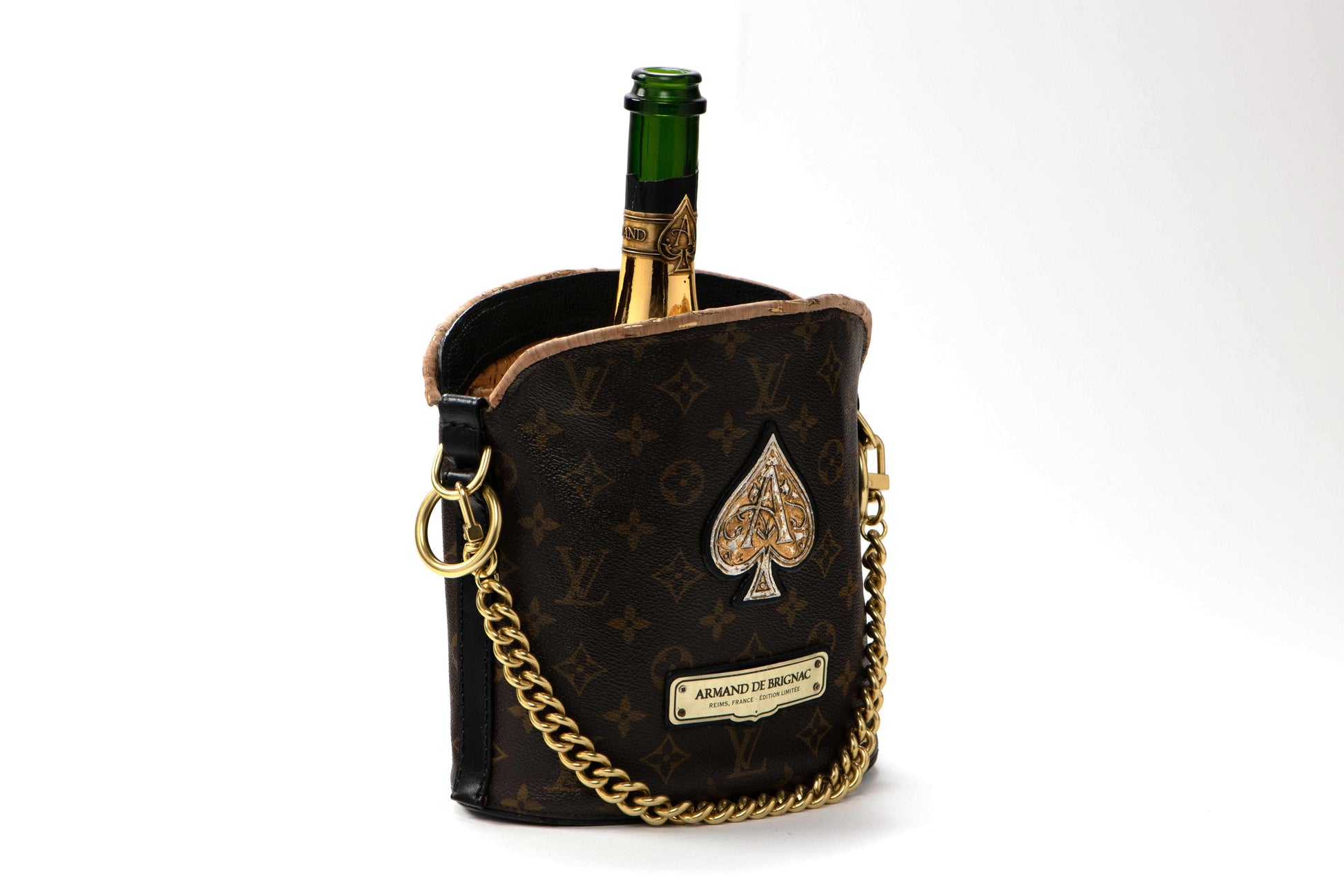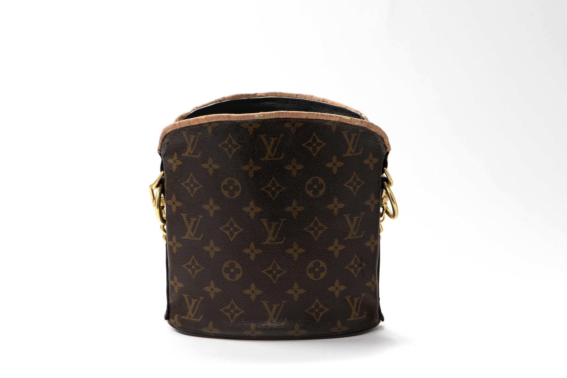 The original bag used to create this piece was an authentic LV "drouot" made in france in the late 1990s. Reimagined in the spirit of a champagne bucket, the alterations include a custom cork interior lining, new leather trim and new brass hardware.