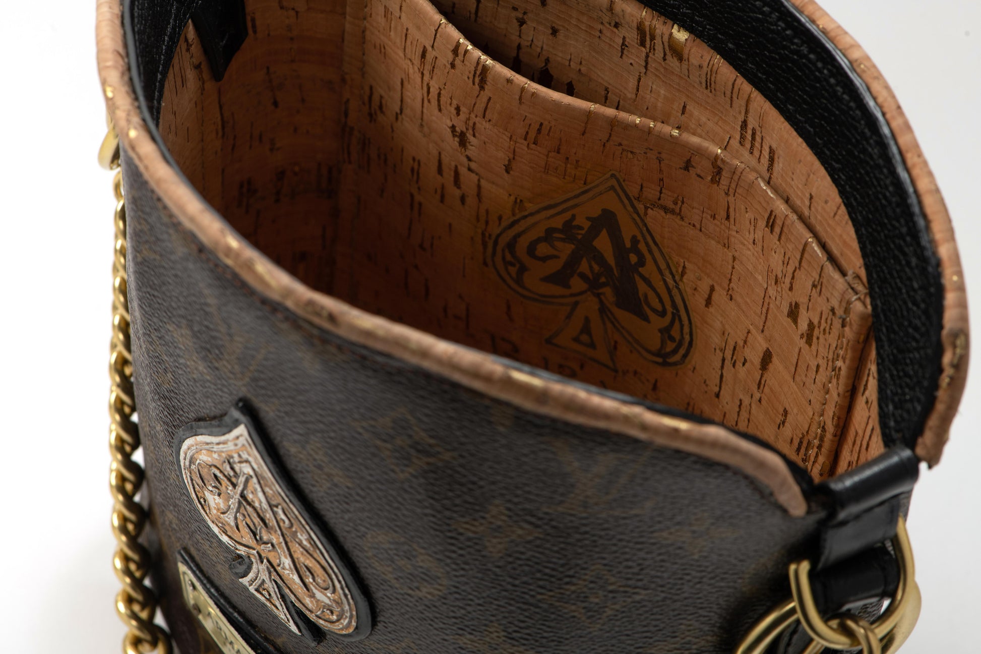 A stunning reimagined handbag featuring iconic monogram canvas with an elegant ace of spades embellishment. This unique piece combines classic luxury with contemporary flair, showcasing beautiful gold-tone hardware and a sophisticated chain strap. The interior features exquisite cork lining with custom branding details.