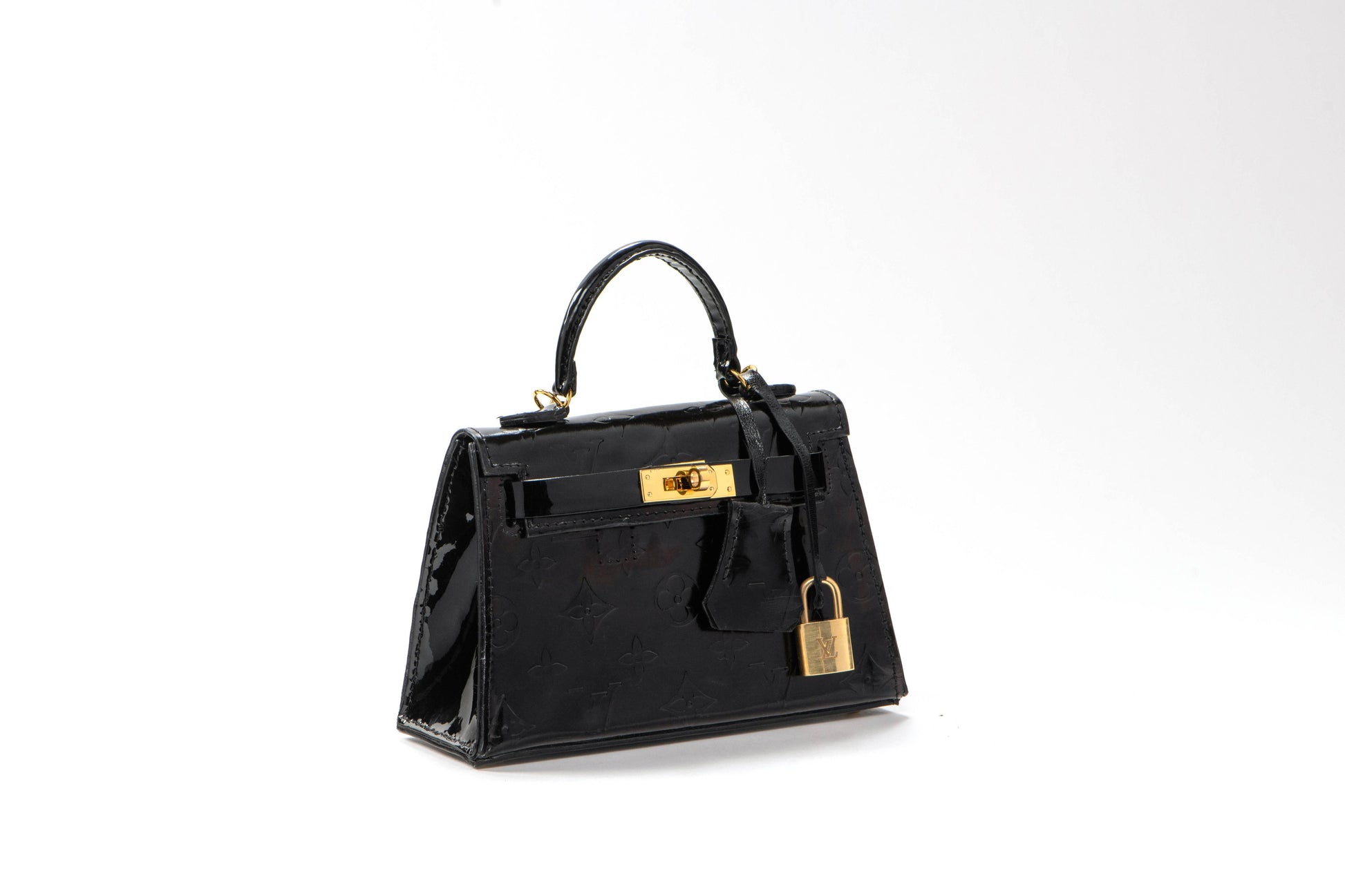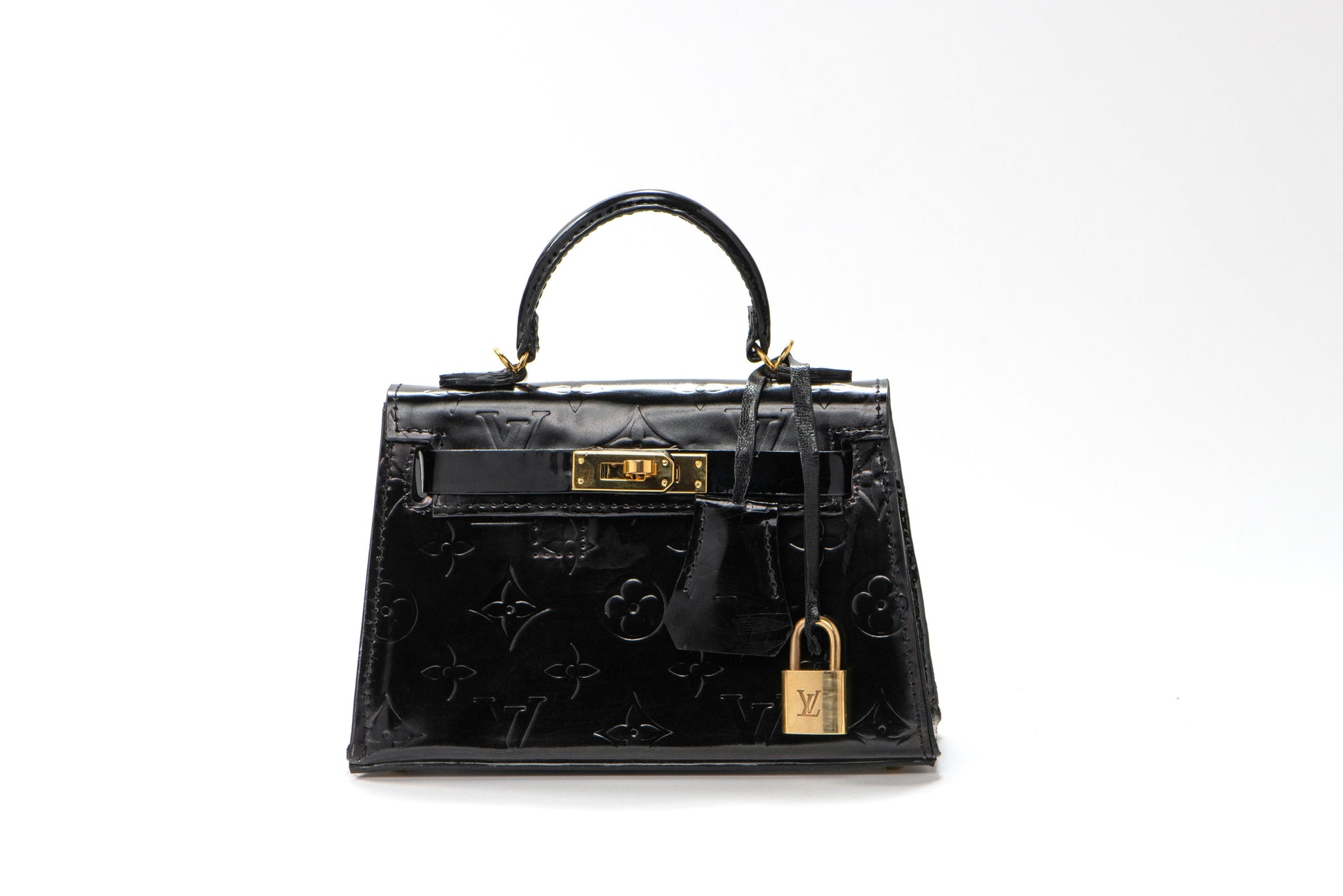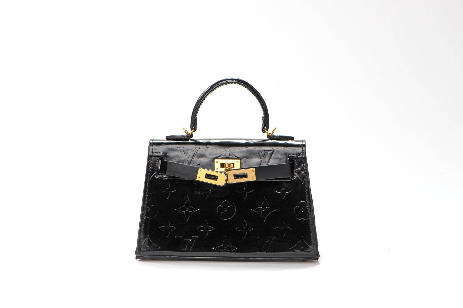 A sleek and sophisticated handbag crafted in lustrous black patent leather with distinctive monogram detailing. This contemporary piece features premium gold hardware and classic structured silhouette, perfectly balancing modern elegance with timeless luxury design. The glossy finish and meticulous craftsmanship make this an exceptional statement piece for the modern connoisseur.