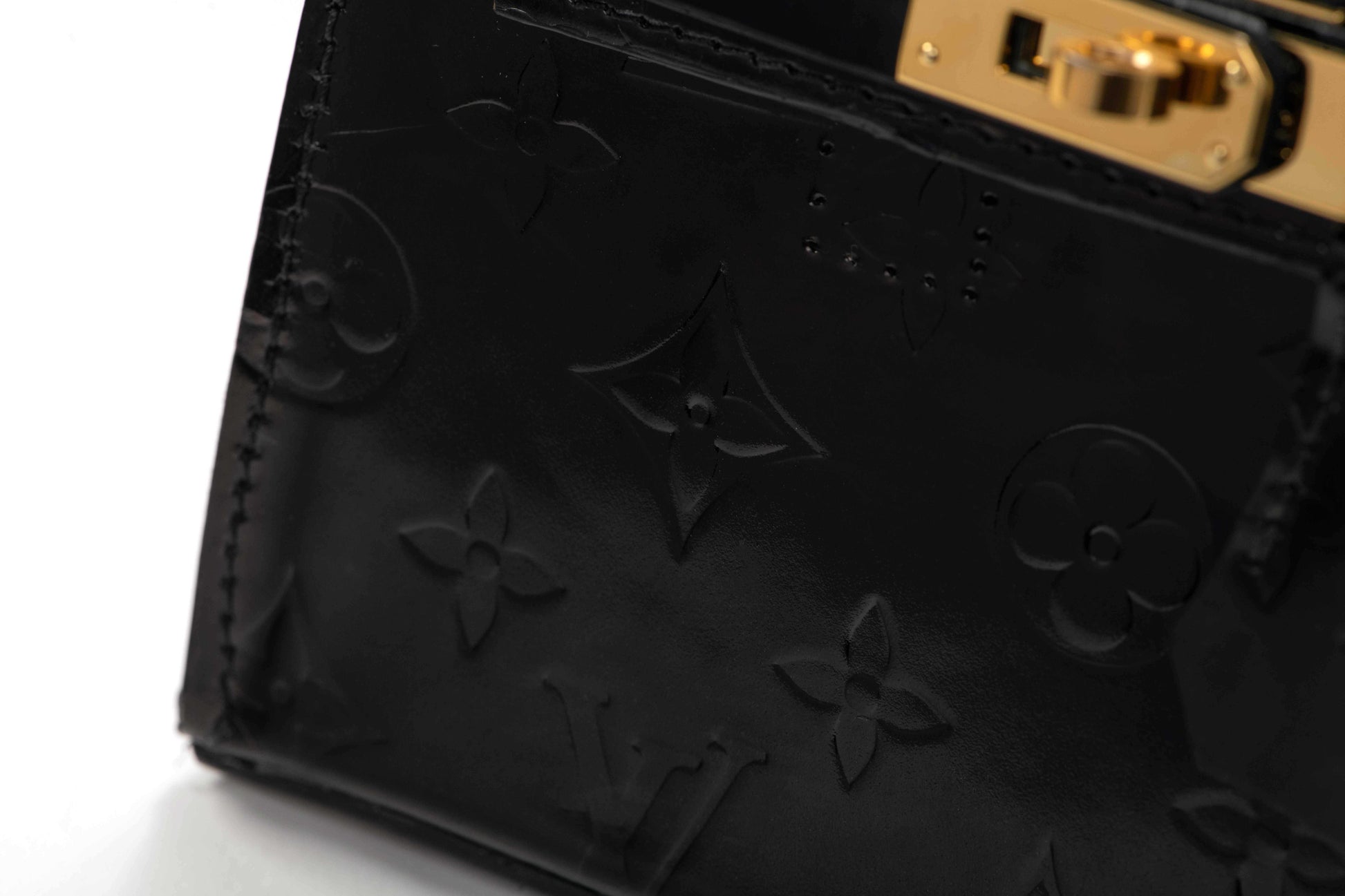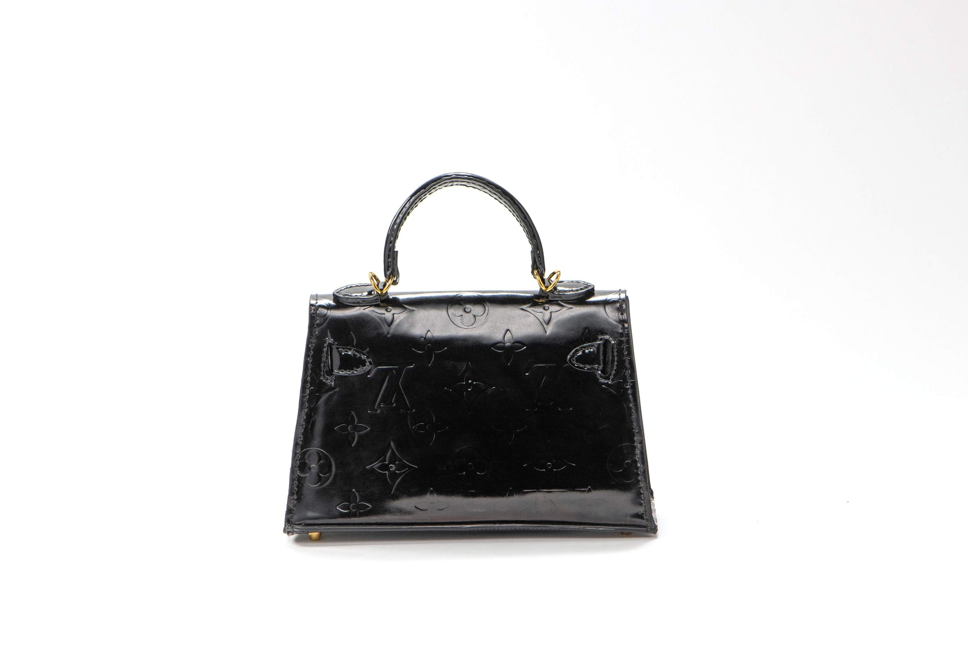 This piece was handcrafted using monogram vernis from the early 2000s, black patent leather and gold ton hardware.