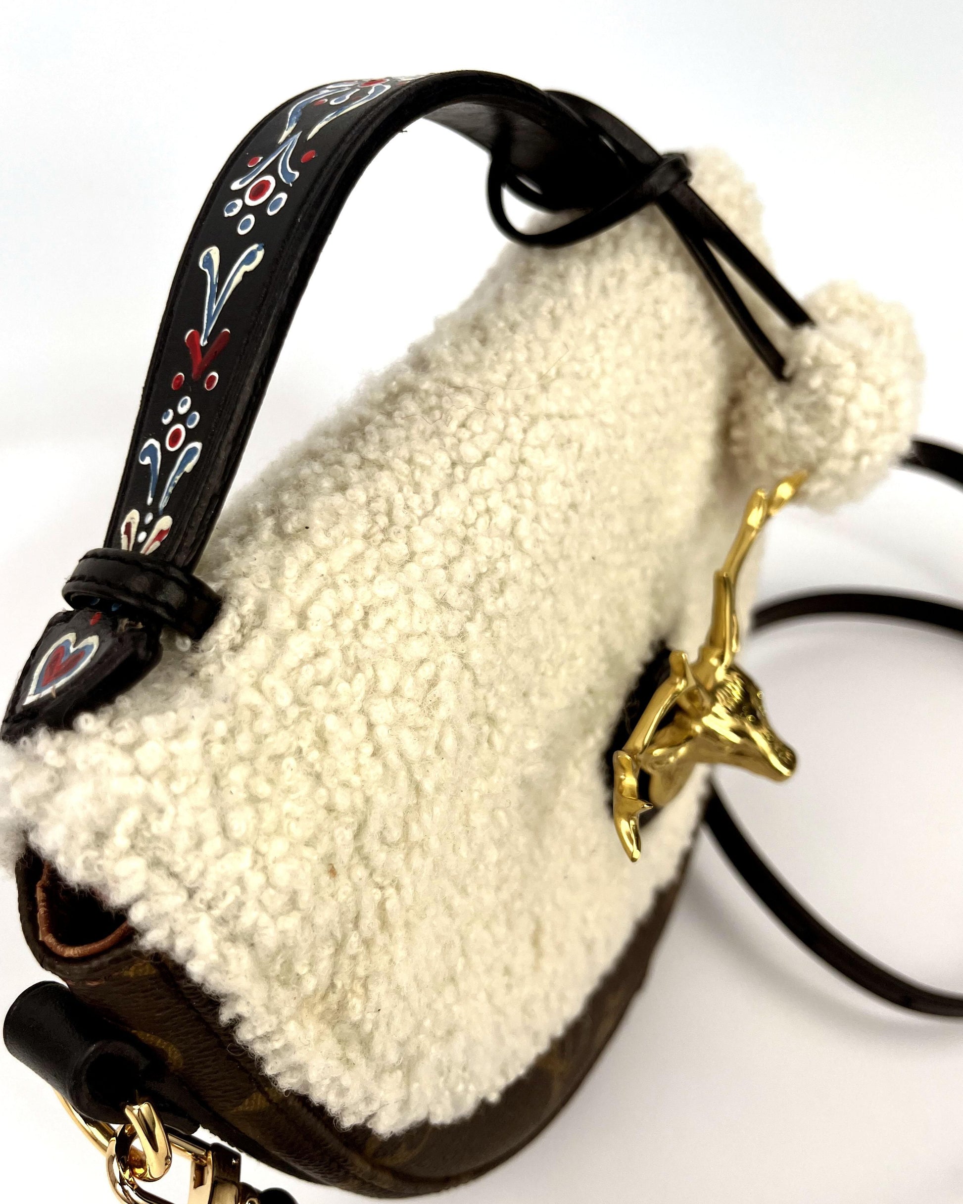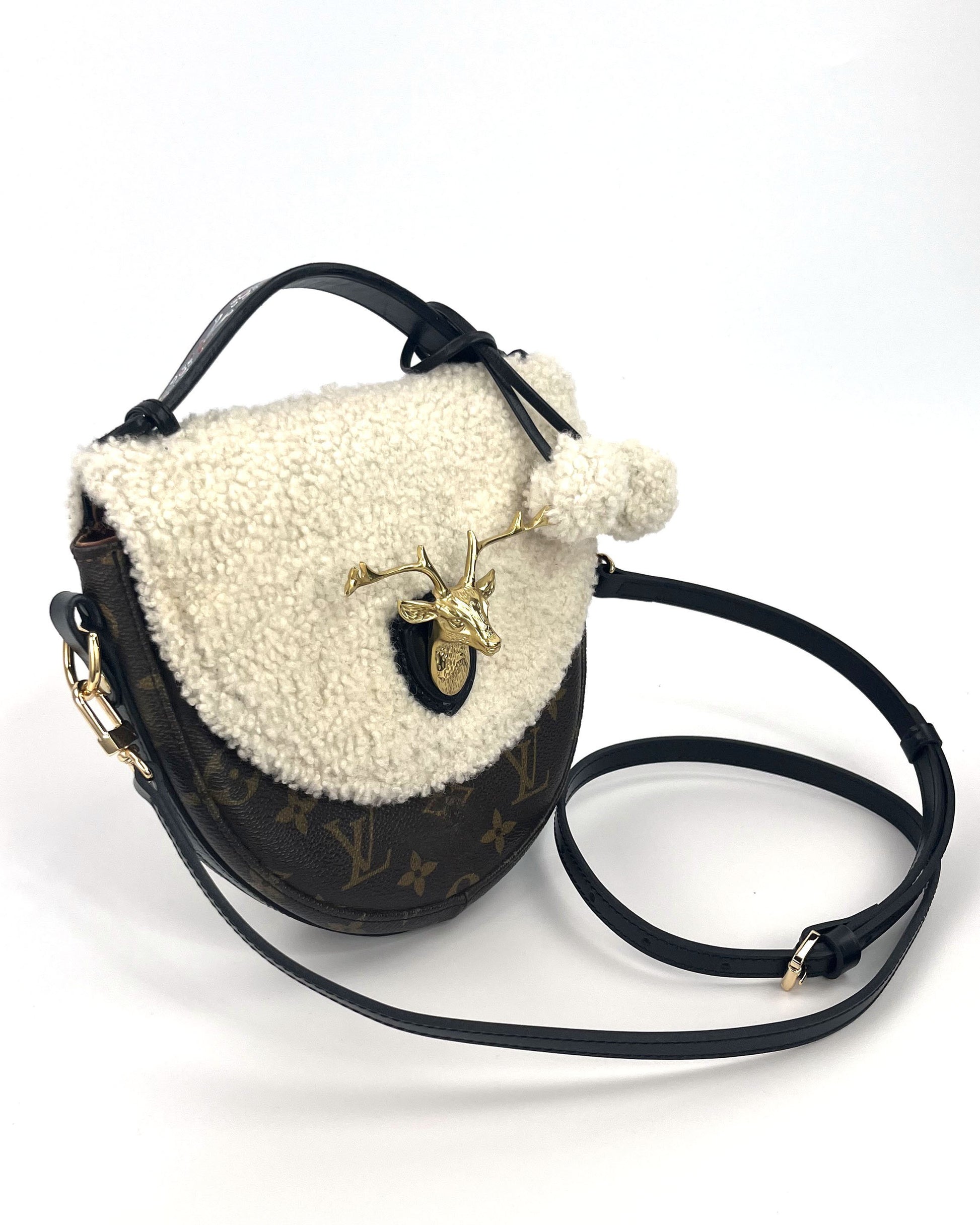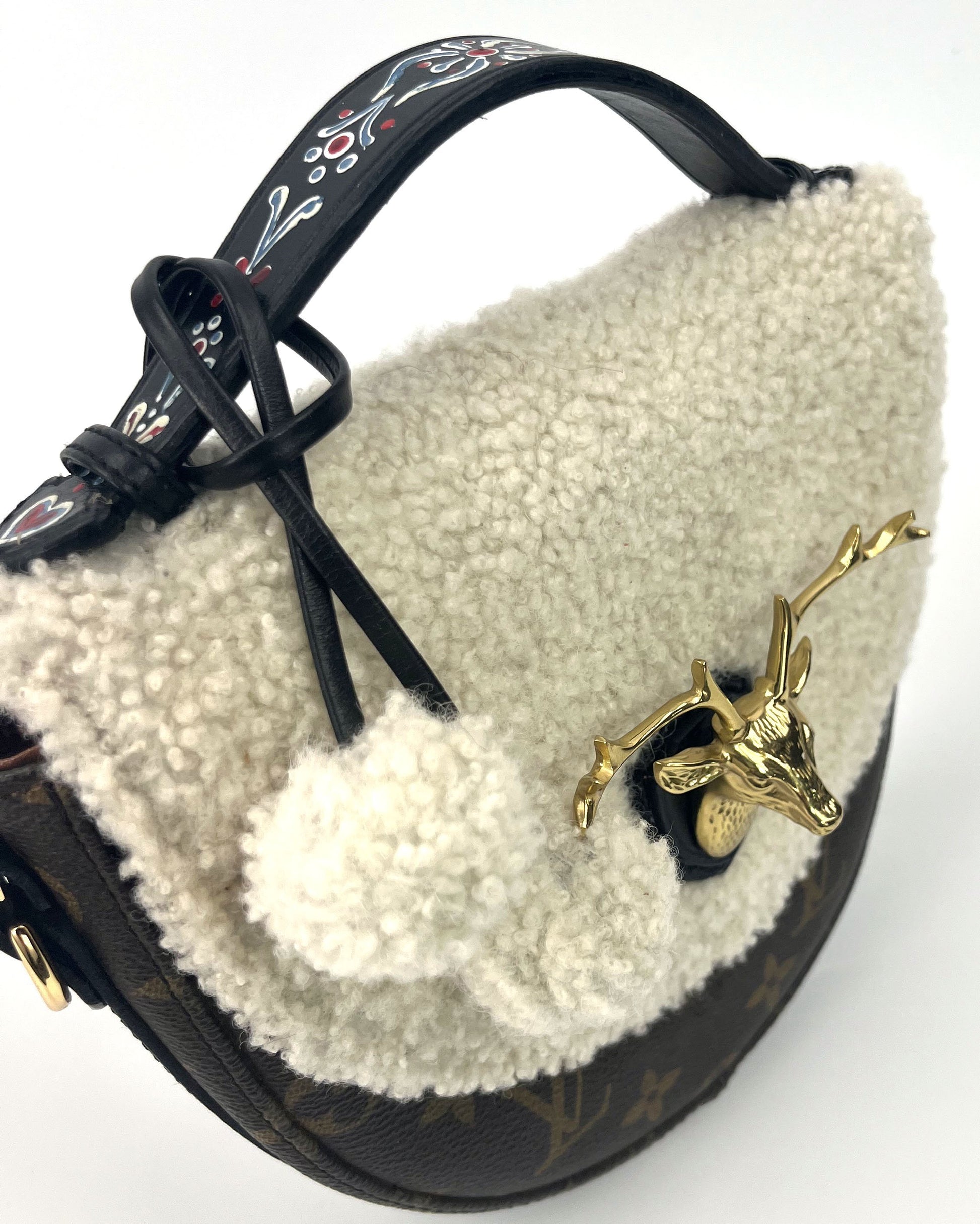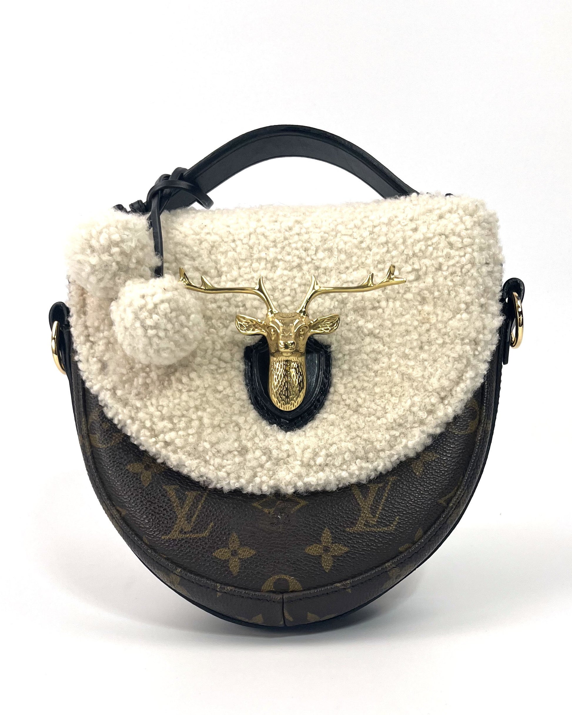 A reimagined LV elevated with plush teddy shearling, hand-painted alpine motifs, and a striking brass deer emblem. Every detail—from the textured warmth of the shearling to the intricacy of the artwork—captures the spirit of winter elegance. A bold interplay of texture, heritage, and story-driven luxury.