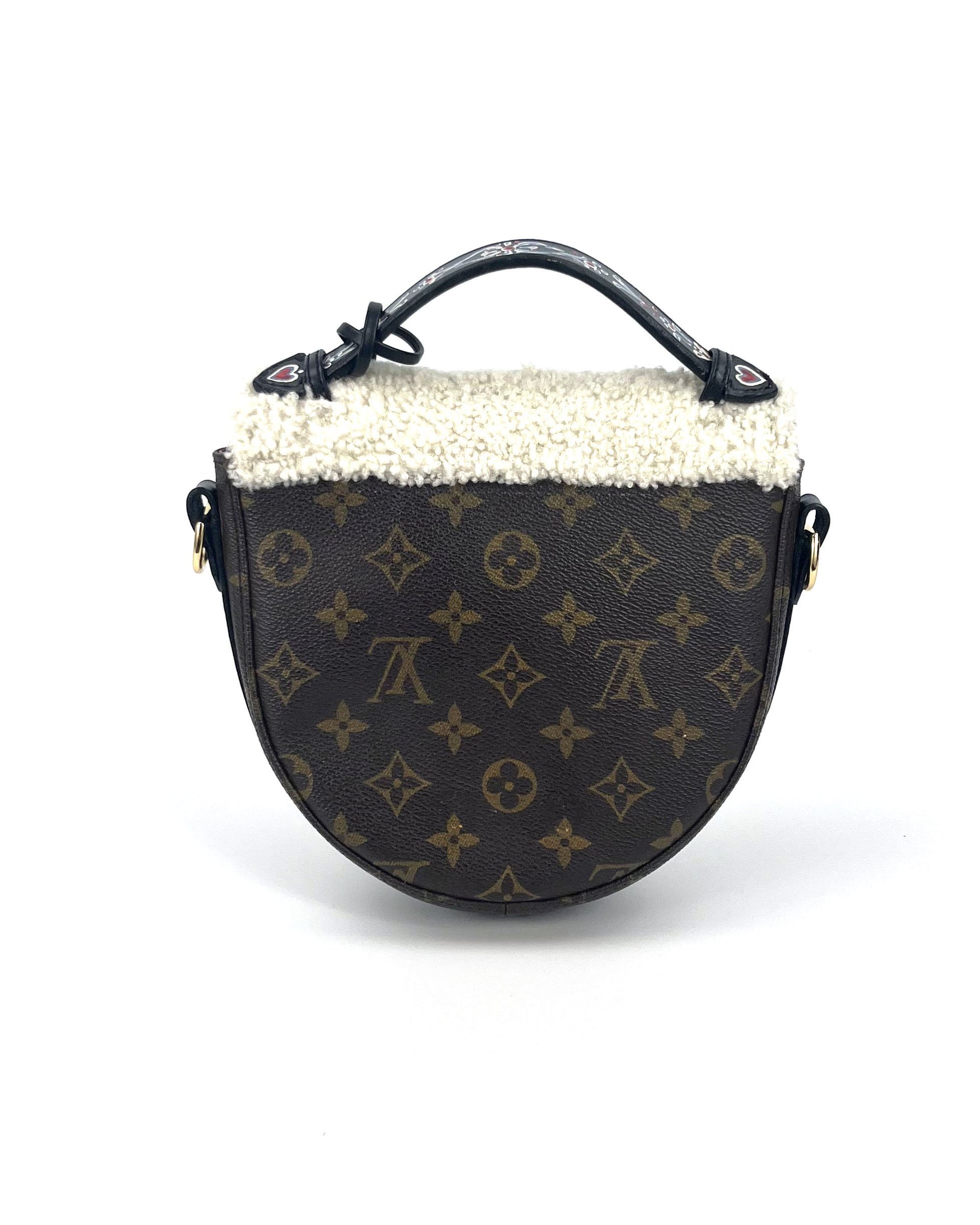 The original bag used to create this piece was an authentic LV "chantilly" from the late 1980s. New gold tone hardware, top handle and closure were added to update fashion and functionality. Accented with a hand painted alpine motif and shearling pom poms.