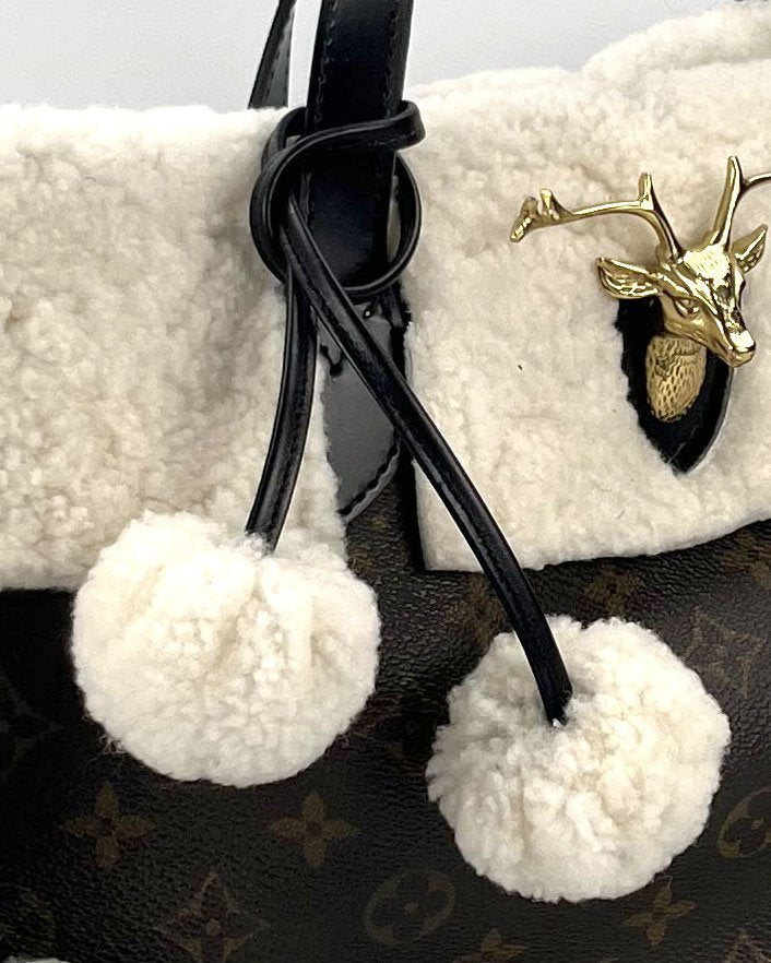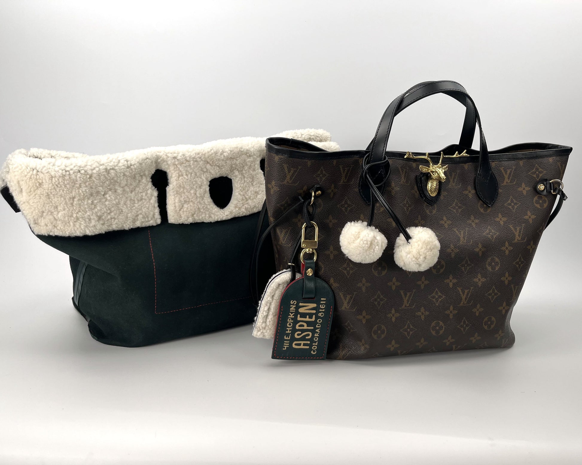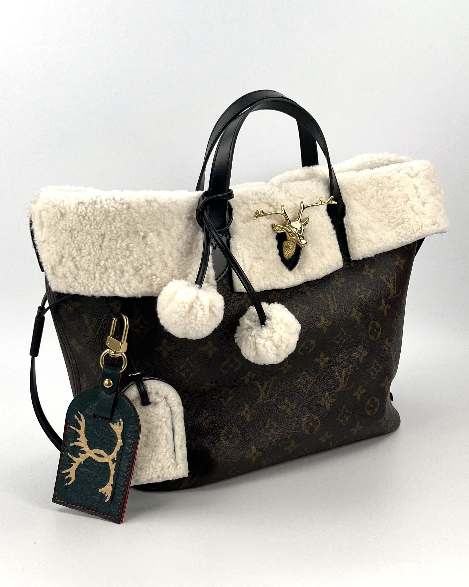 From the lift line to the lounge, this is the ultimate winter accessory. Built from an authentic LV neverfull, she features a plush removable shearling liner, black leather details, and a bold brass deer to lead the way.