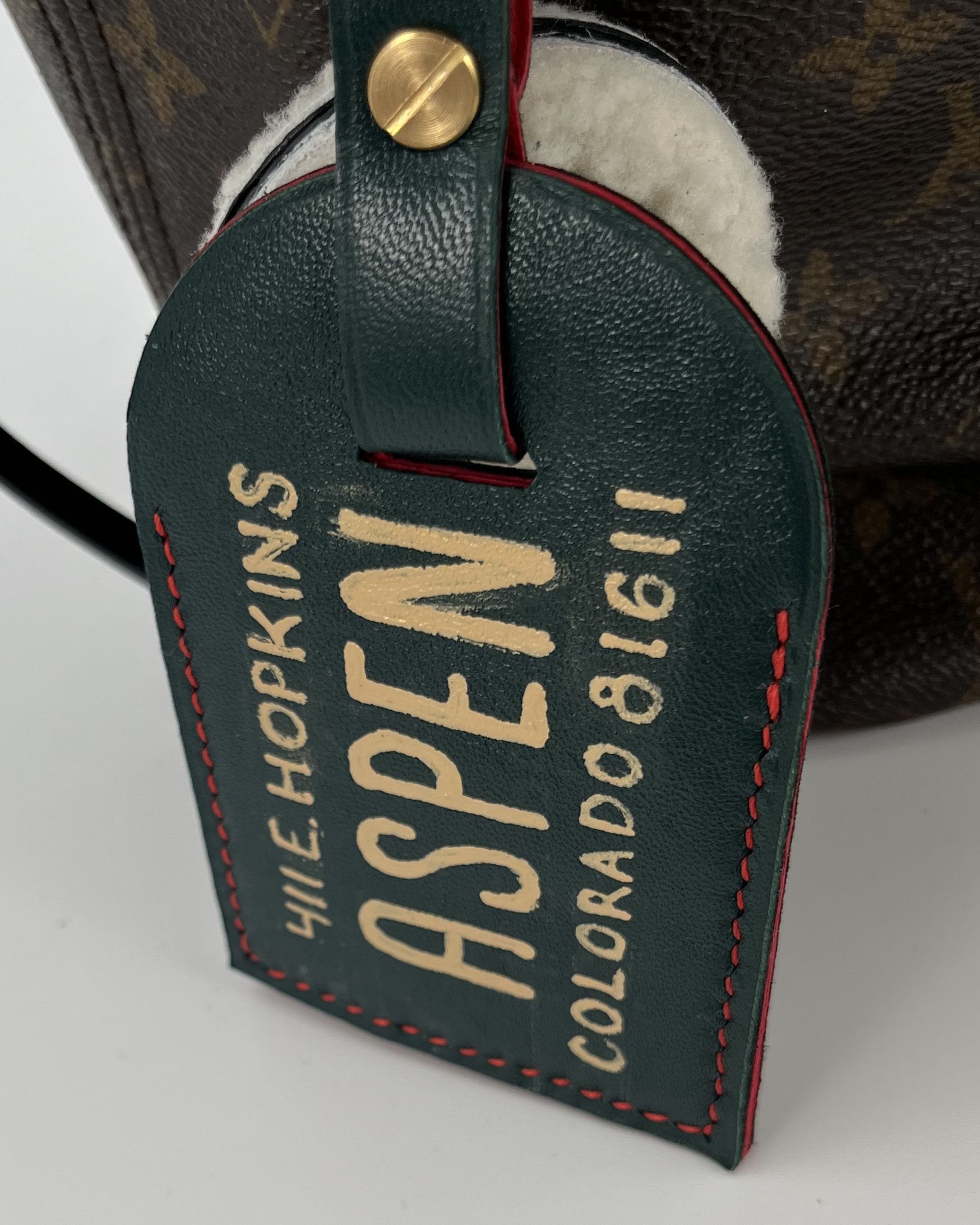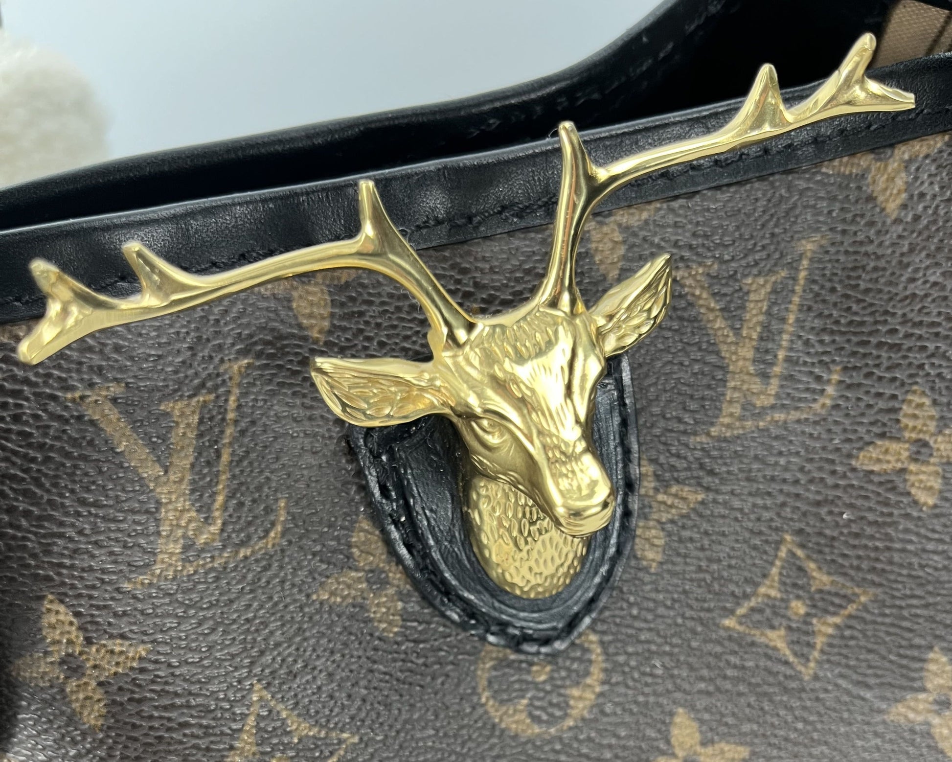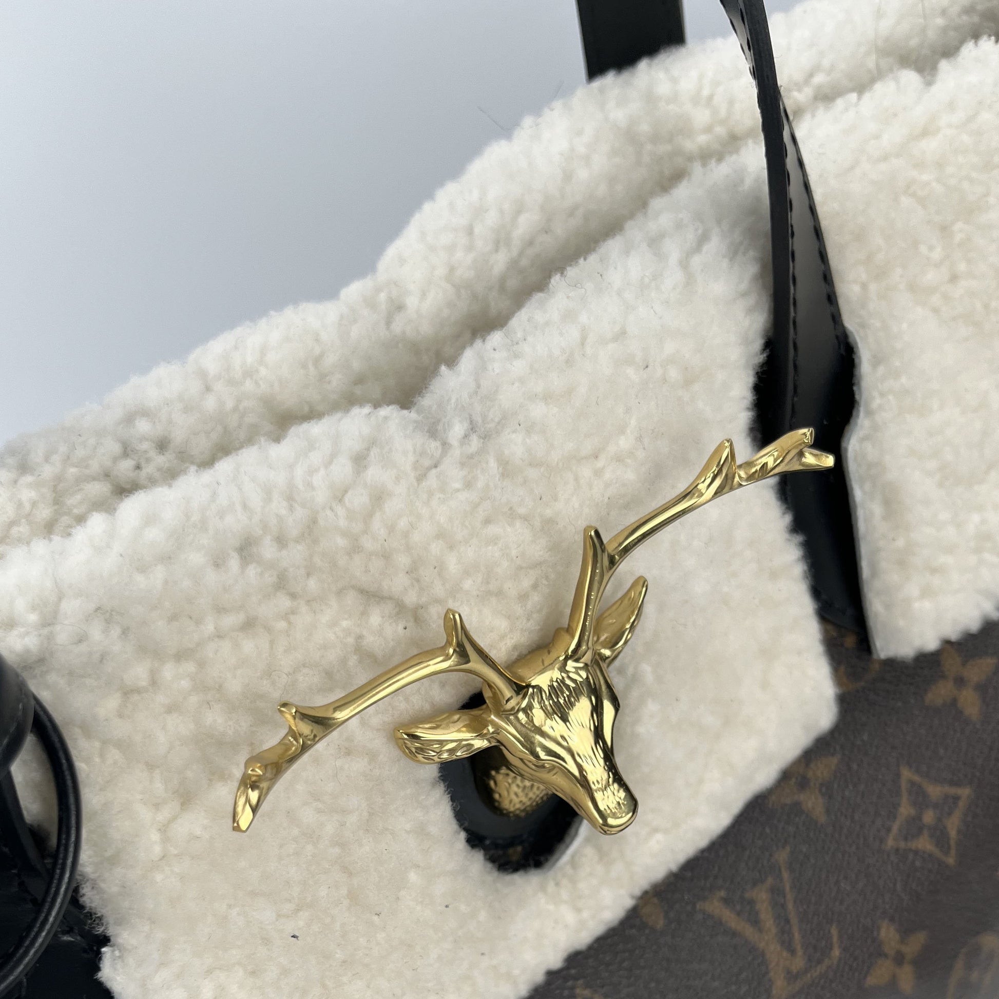 From the lift line to the lounge, this is the ultimate winter accessory. Built from an authentic LV neverfull, she features a plush removable shearling liner, black leather details, and a bold brass deer to lead the way.