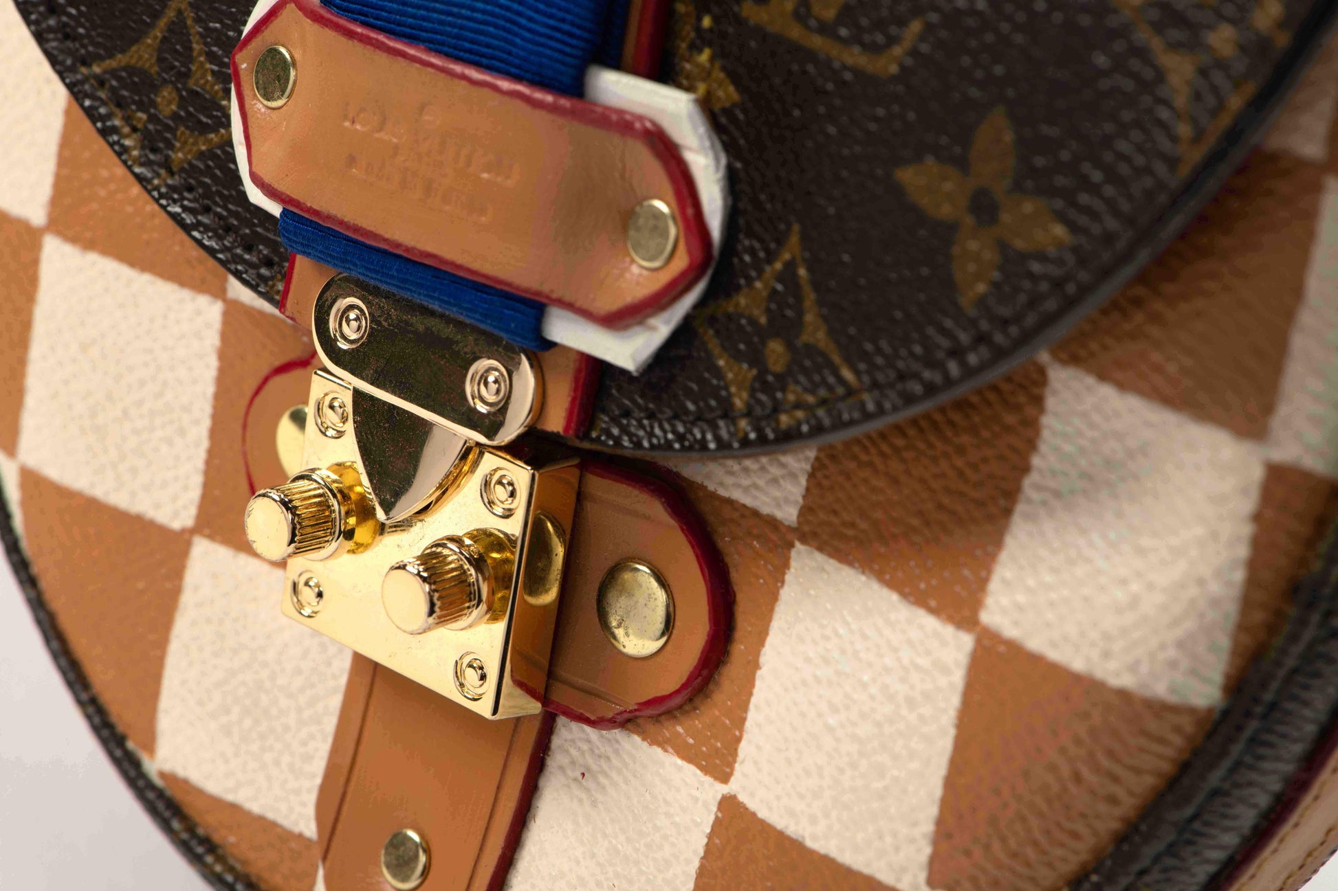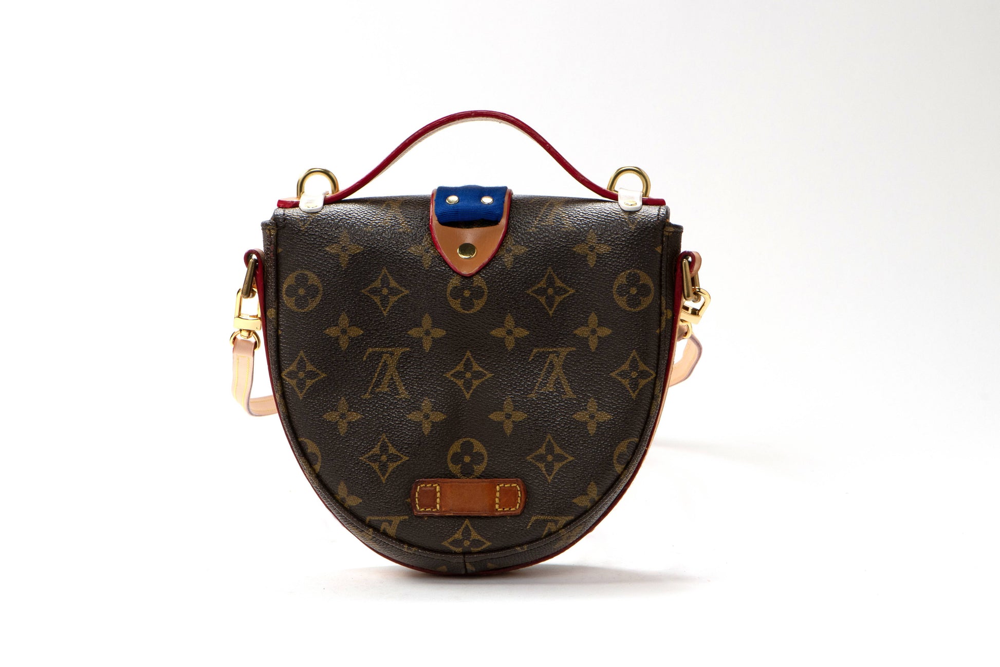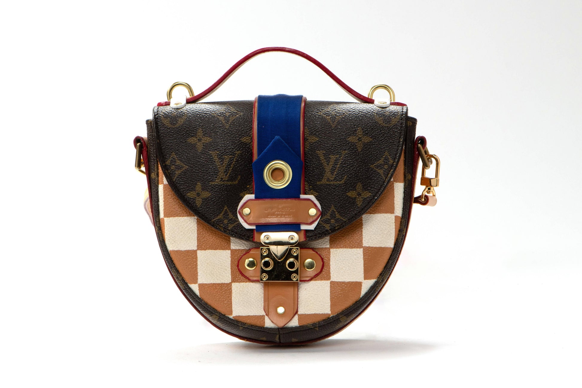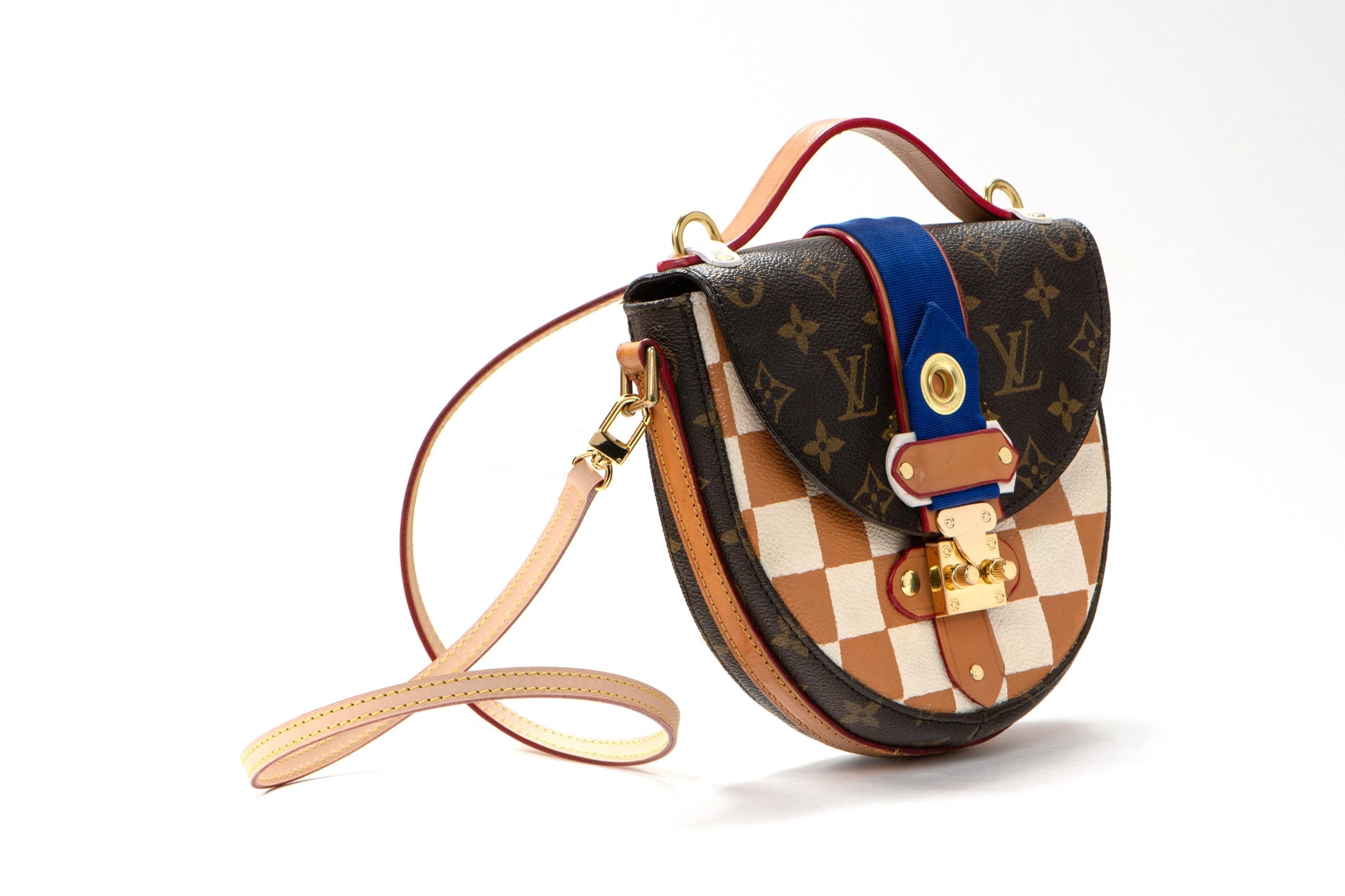 The original bag used to create this piece was an authentic LV "chantilly" from the late 1980s. New gold tone hardware, top handle and closure were added to update fashion and functionality. Accented with a hand painted damier pattern and a touch of stunning cobalt blue petersham ribbon.