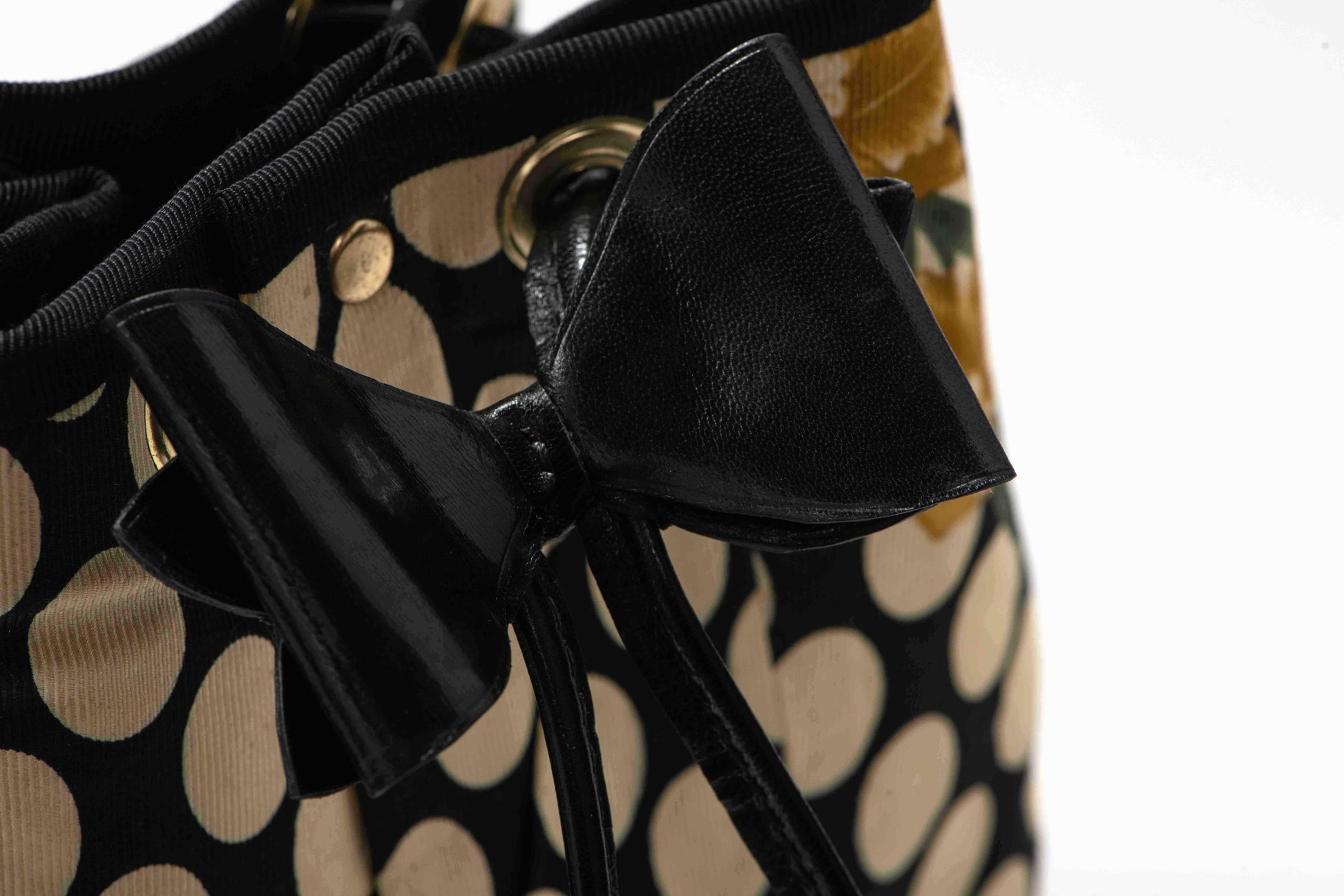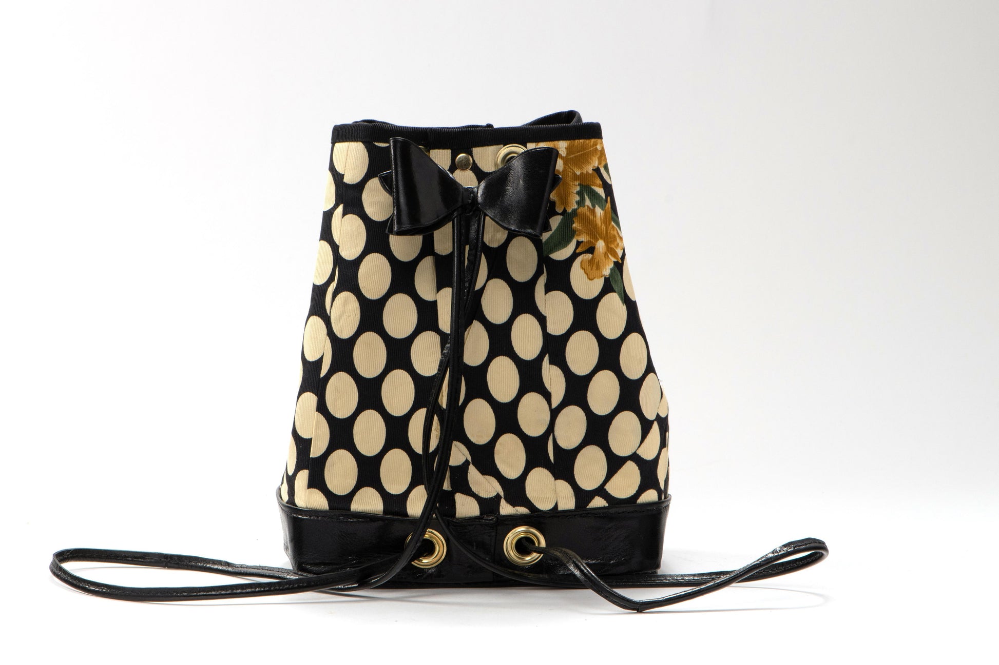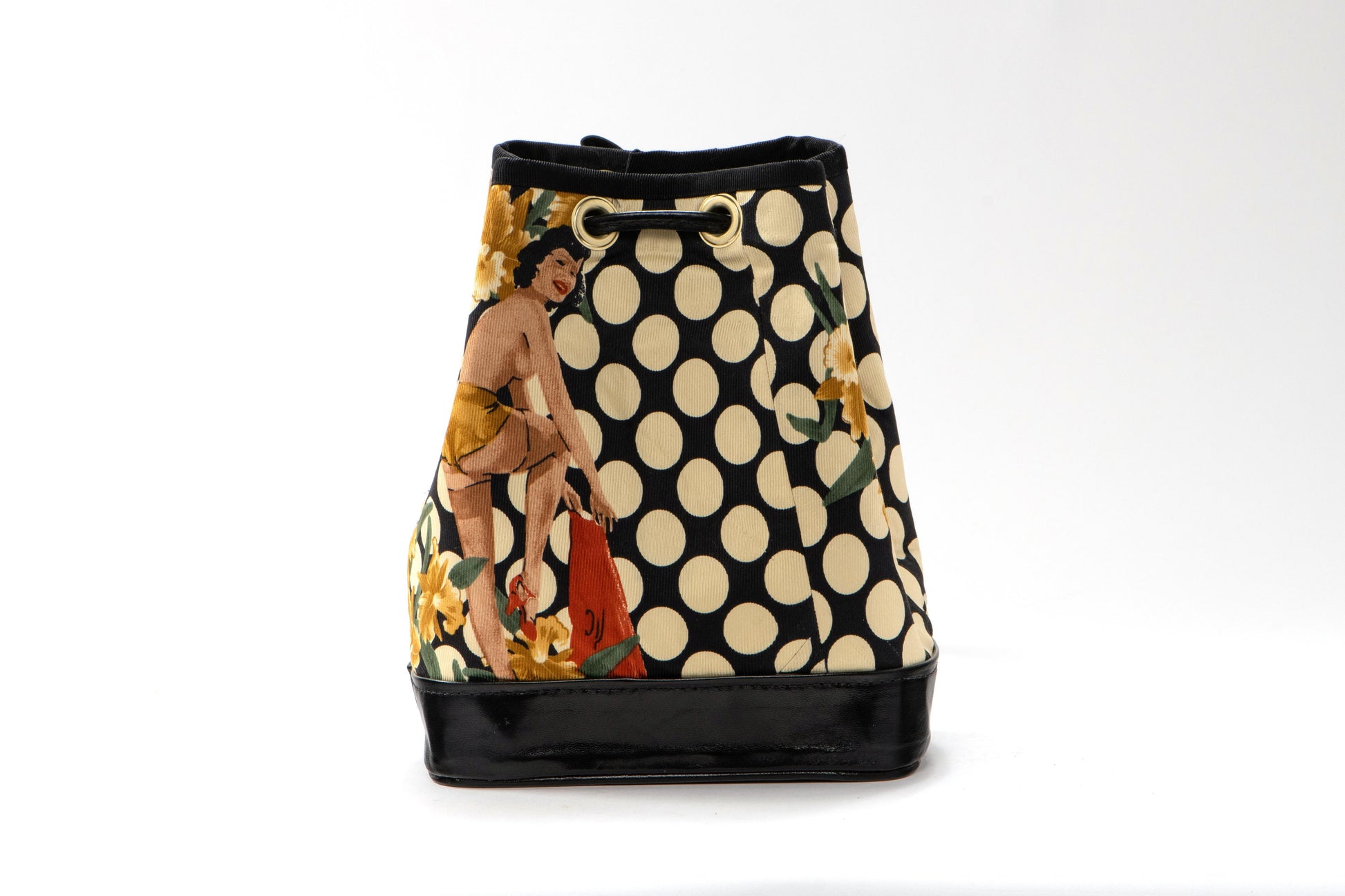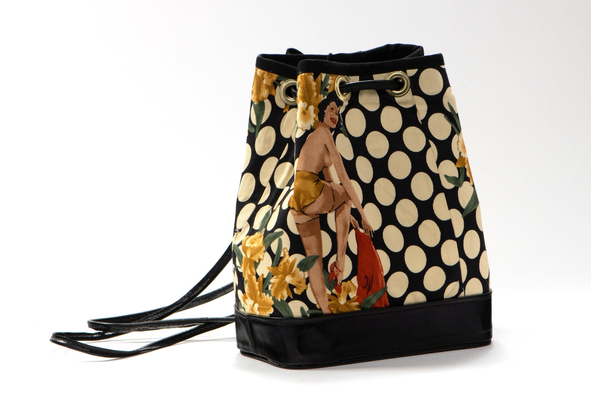 A playful and artistic bucket bag featuring a retro polka dot pattern with vintage pin-up girl imagery and vibrant yellow floral accents. This whimsical piece combines black leather trim with gold hardware, creating a perfect balance between retro charm and contemporary luxury. The drawstring closure and unique leather "bow" detail make this truly a one-of-a-kind collector's piece.