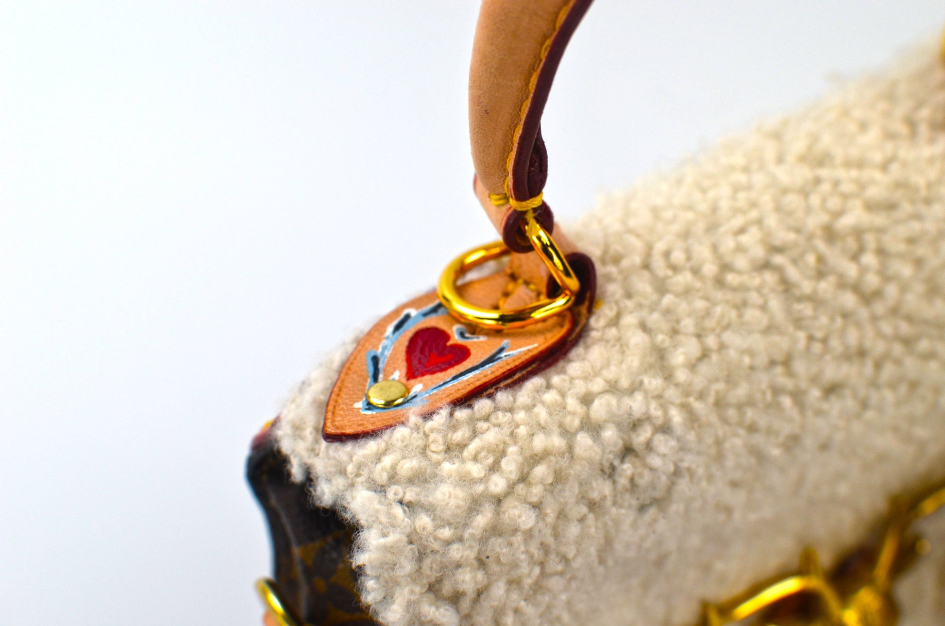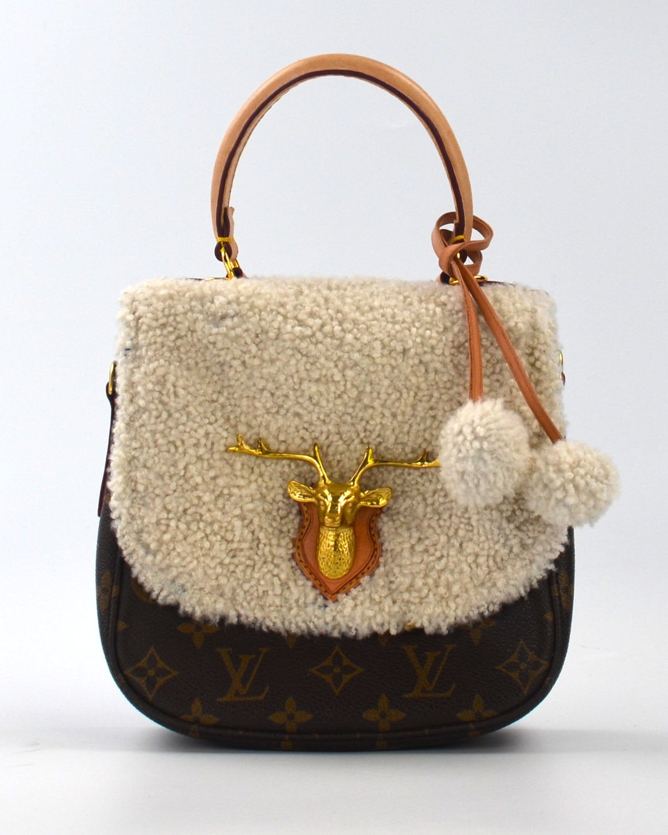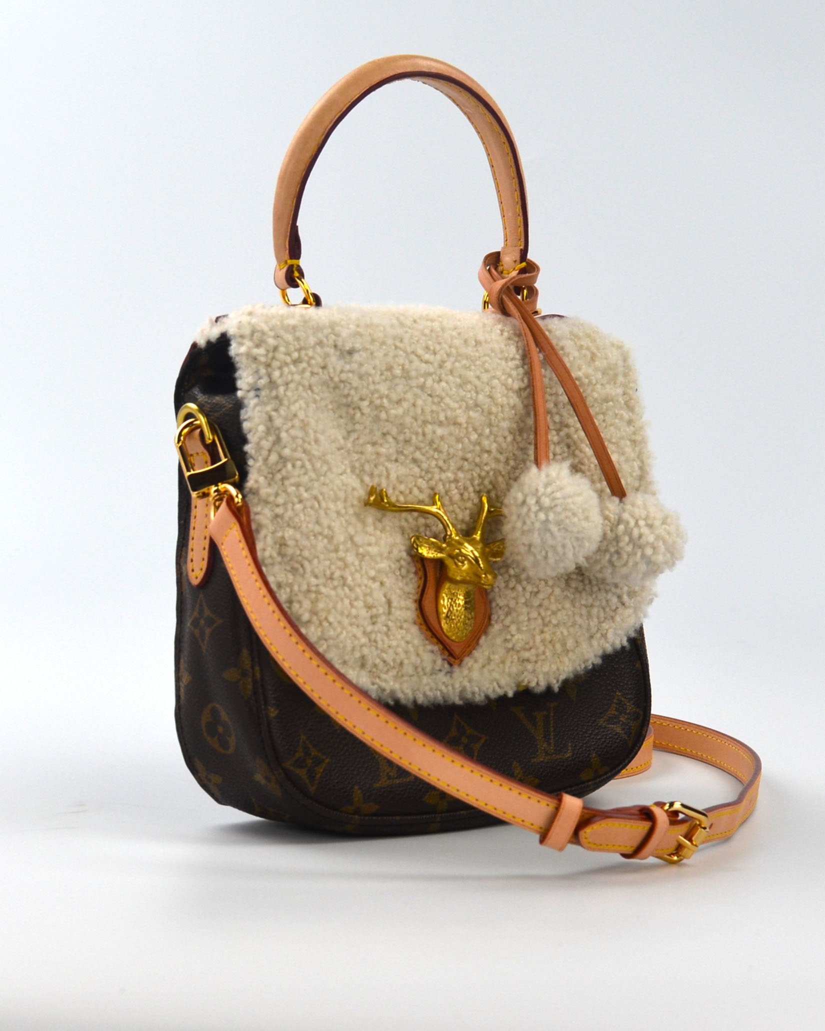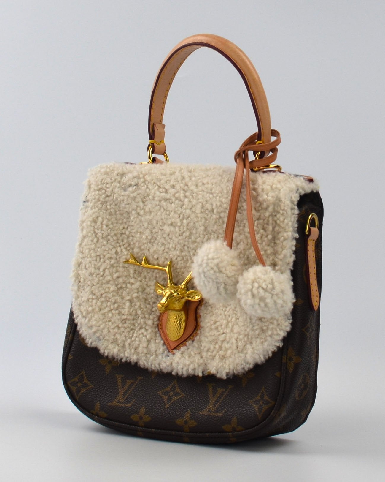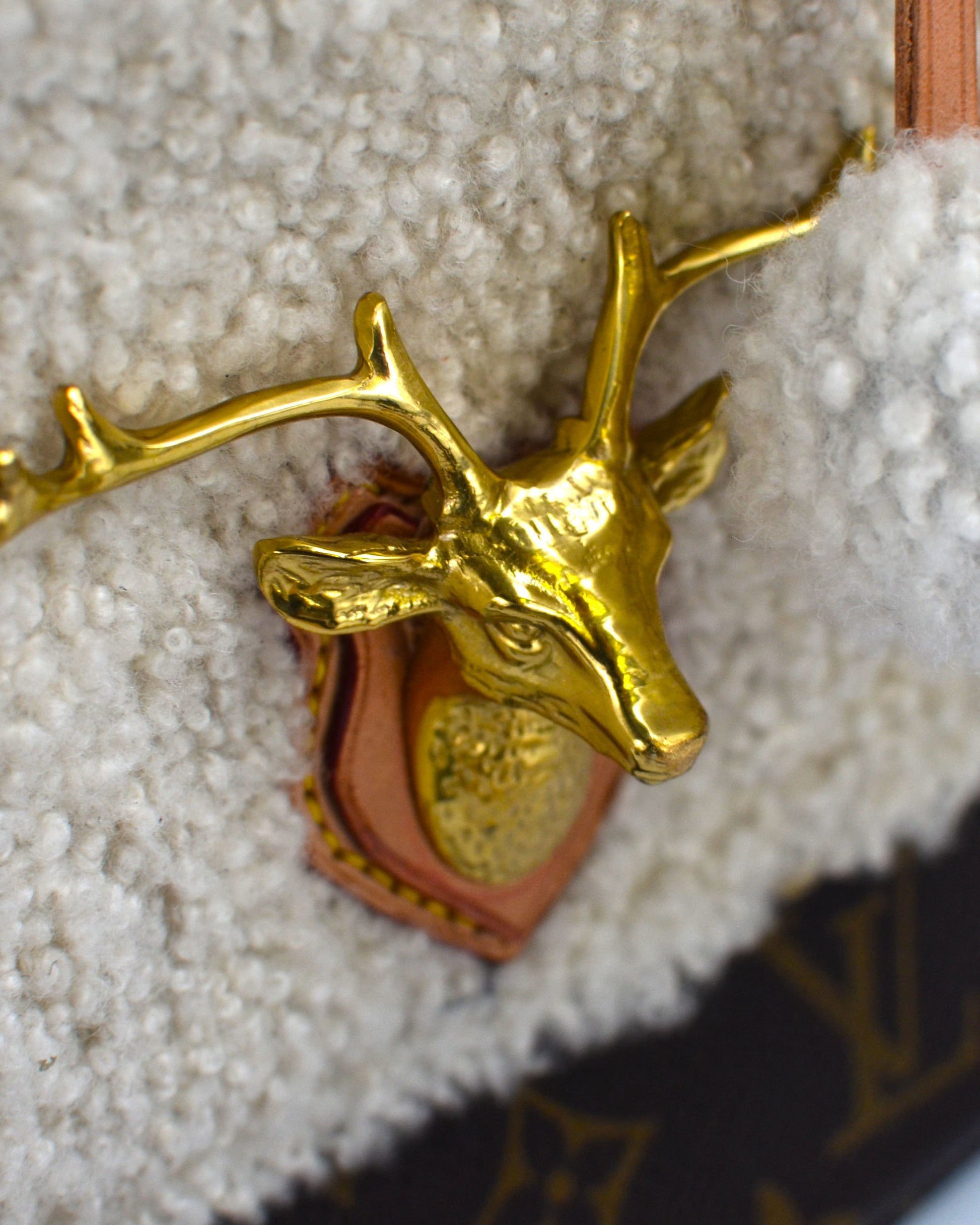 A reimagined LV, elevated with teddy shearling, a polished gold-tone brass deer head, and natural vachetta leather accents. The structured monogram body contrasts beautifully with soft alpine textures, while dual pom poms add a playful winter charm. Finished with a matching leather top handle and adjustable crossbody strap, this piece is both functionally cozy and unapologetically bold.
