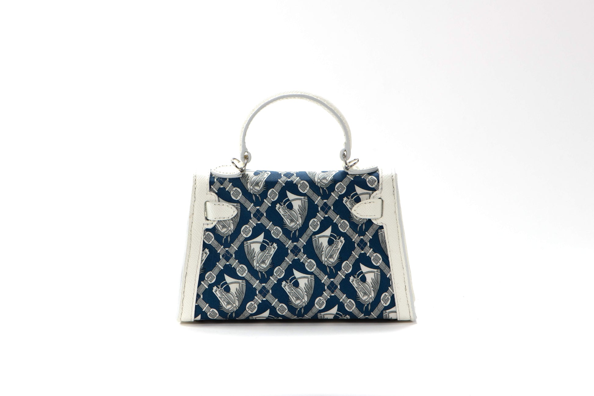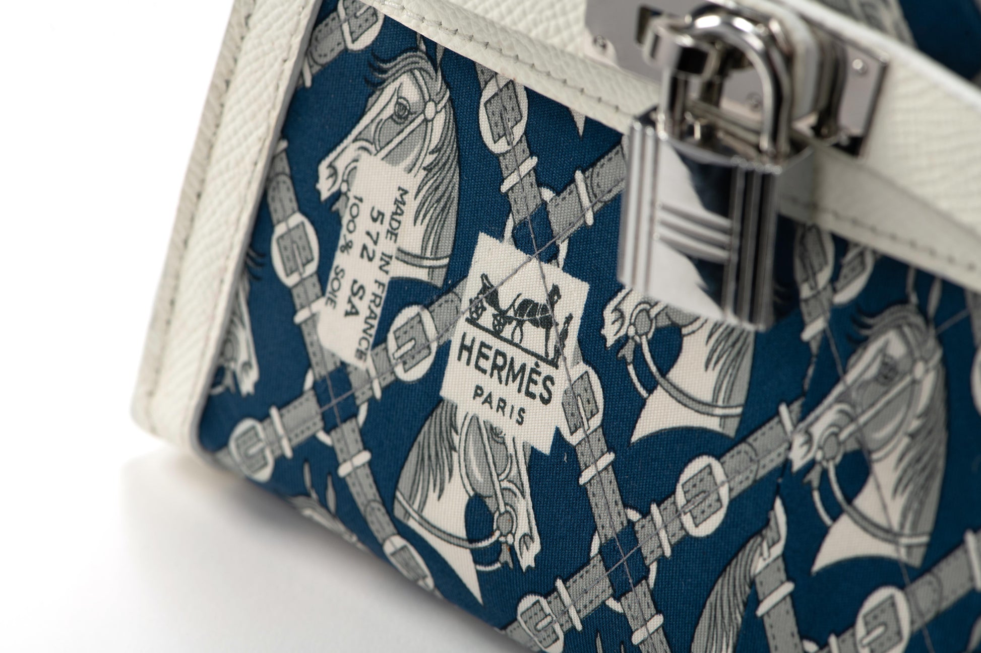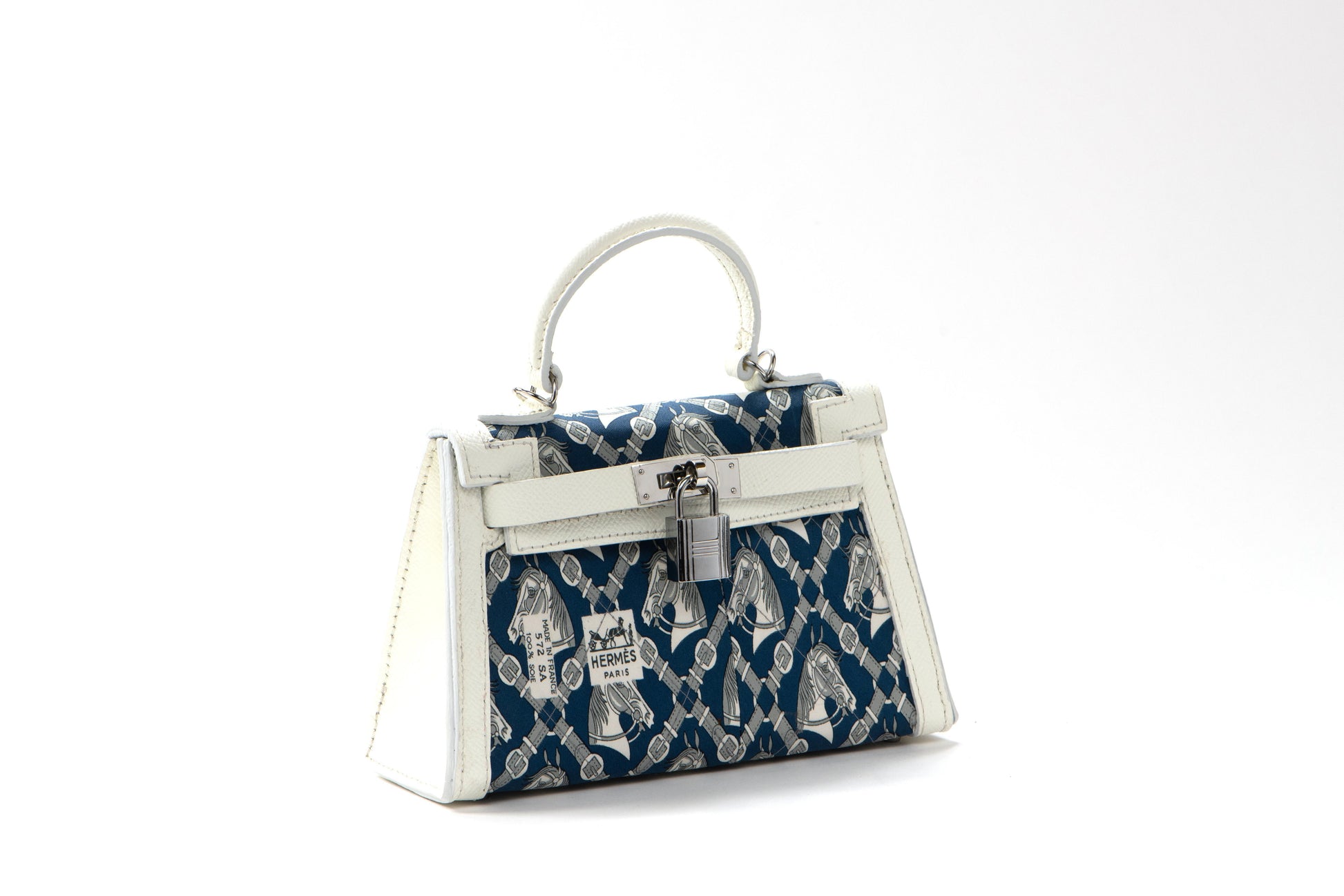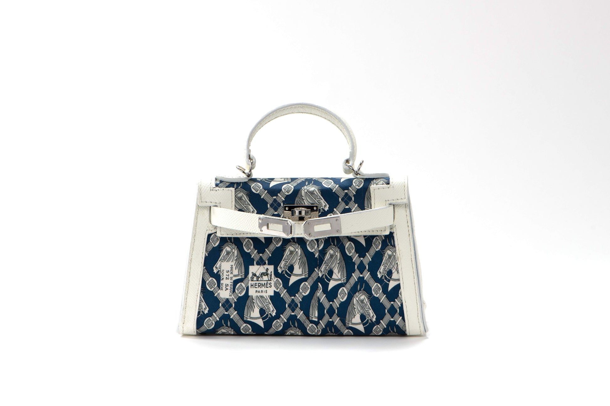A statement of refined equestrian elegance, this piece is meticulously handcrafted from pristine white epsom leather and panels of an authentic vintage Hermès silk twill necktie. The design is elevated by silver-tone hardware and a sleek silhouette, creating a rare, one-of-a-kind accessory that captures timeless luxury.