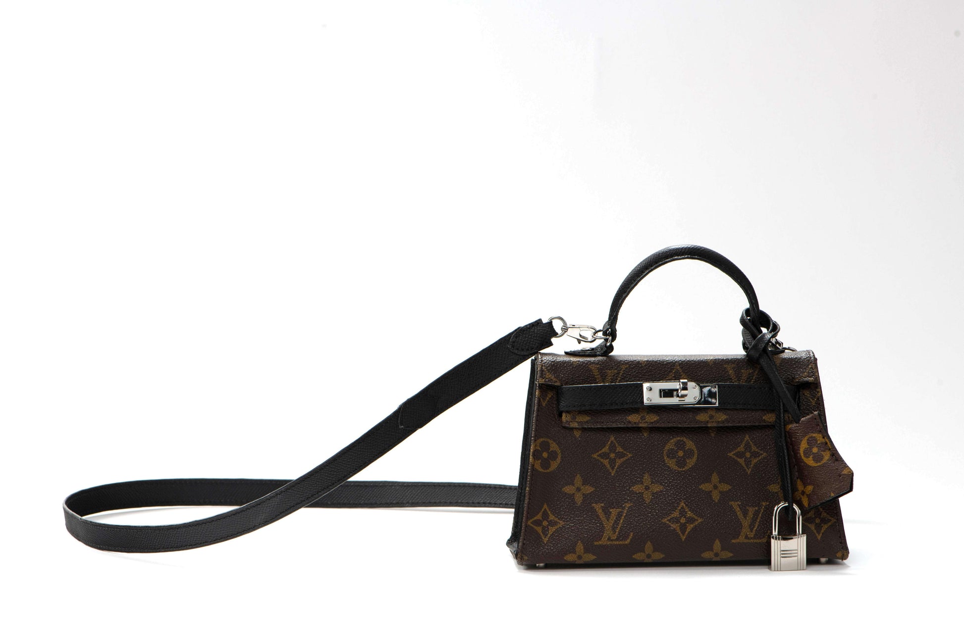 This "mini" bag was handcrafted from an authentic LV monogram canvas "keepall", premium black epsom leather, and stainless silver tone hardware. The structured silhouette with crossbody strap offers versatility while maintaining the timeless appeal of reimagined luxury craftsmanship.