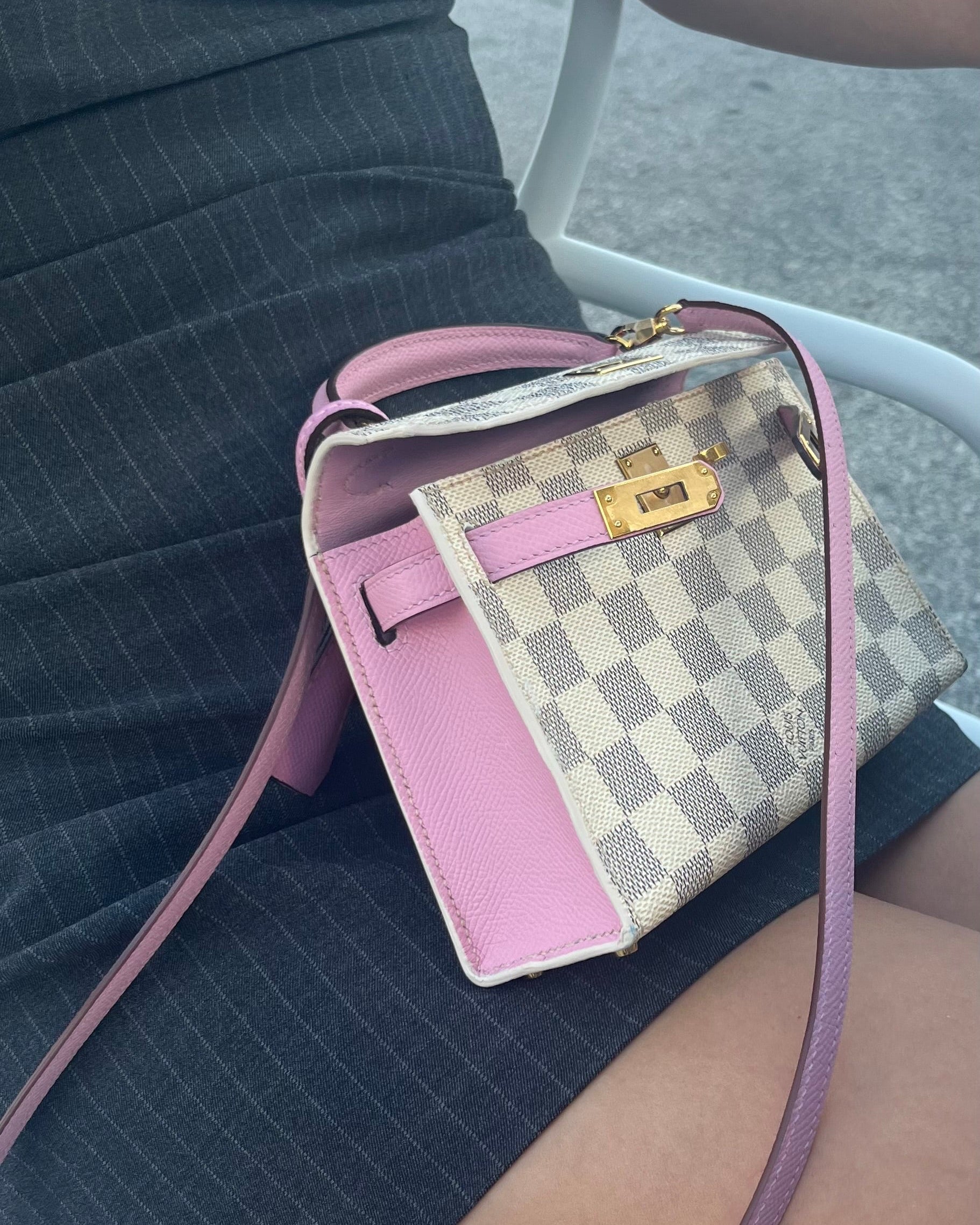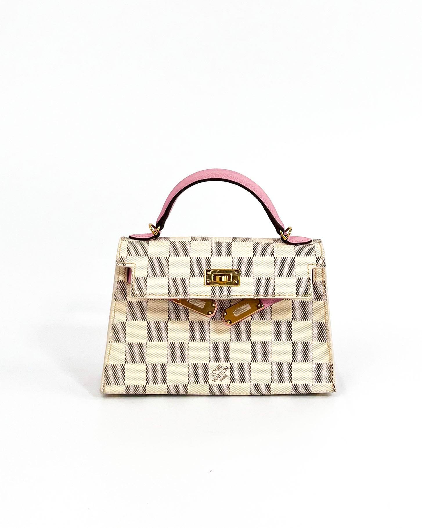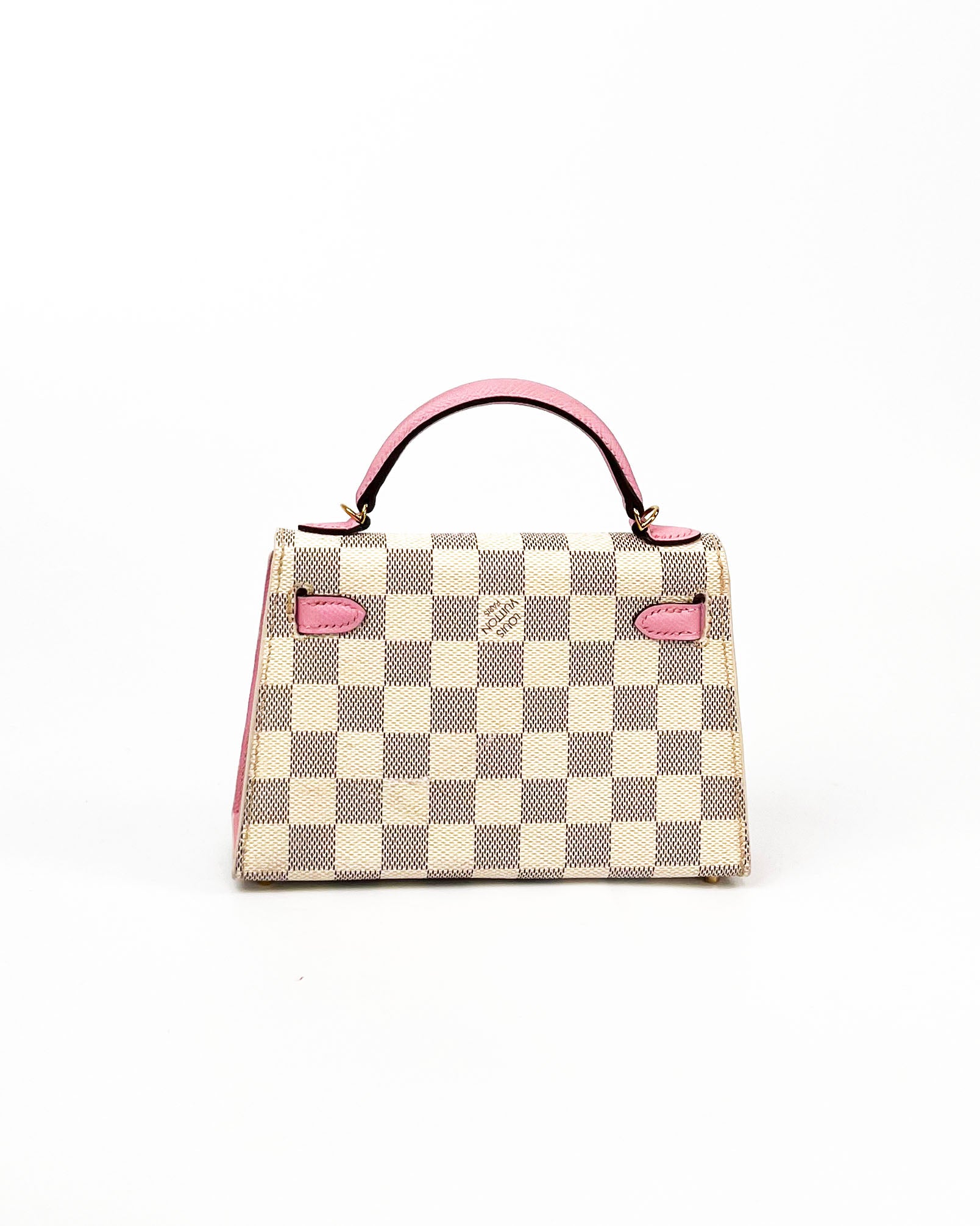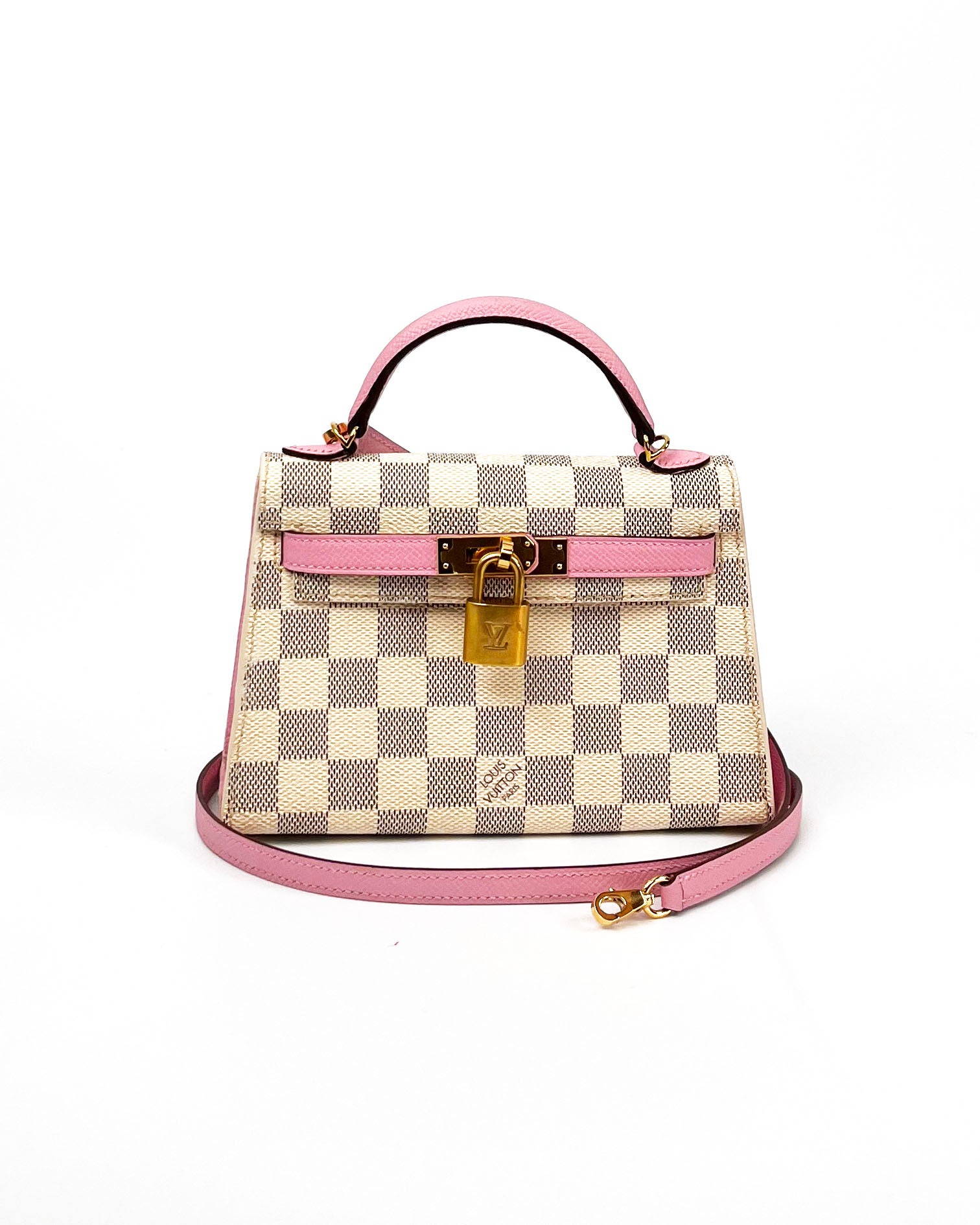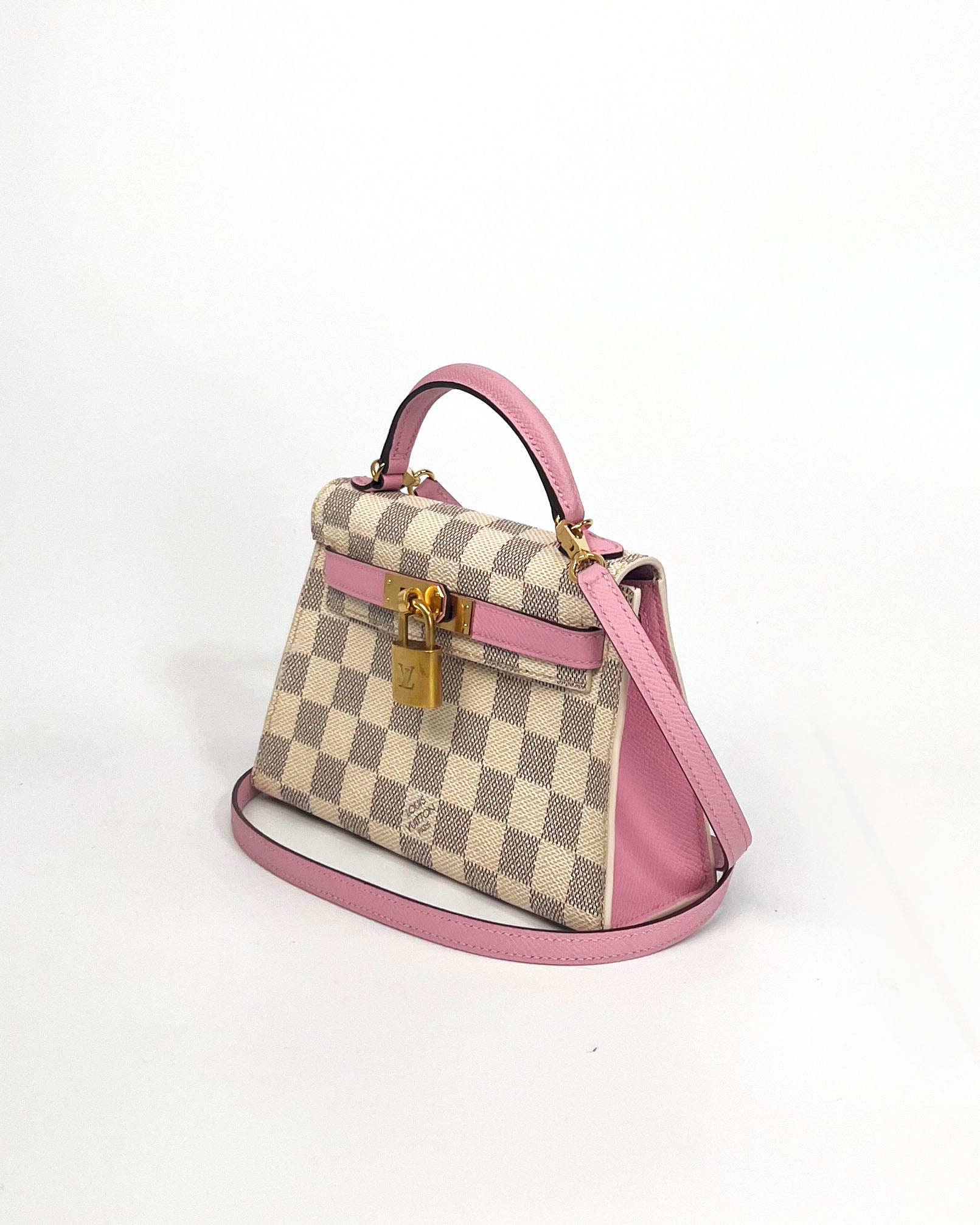 This "mini" bag was handcrafted from authentic LV Damier Azure canvas, pink epsom leather, and gold tone hardware including an authentic vintage LV brass padlock. The structured silhouette with crossbody strap offers versatility while maintaining the timeless appeal of reimagined luxury craftsmanship.
