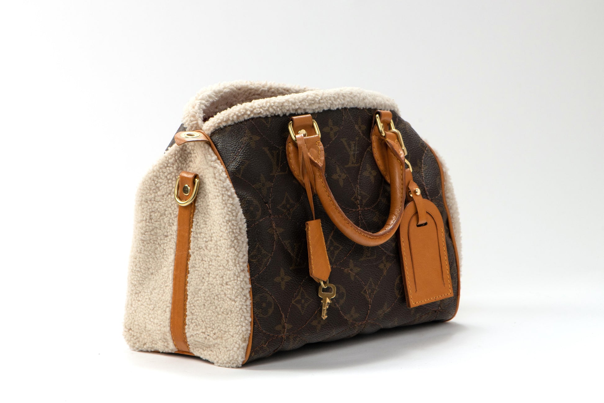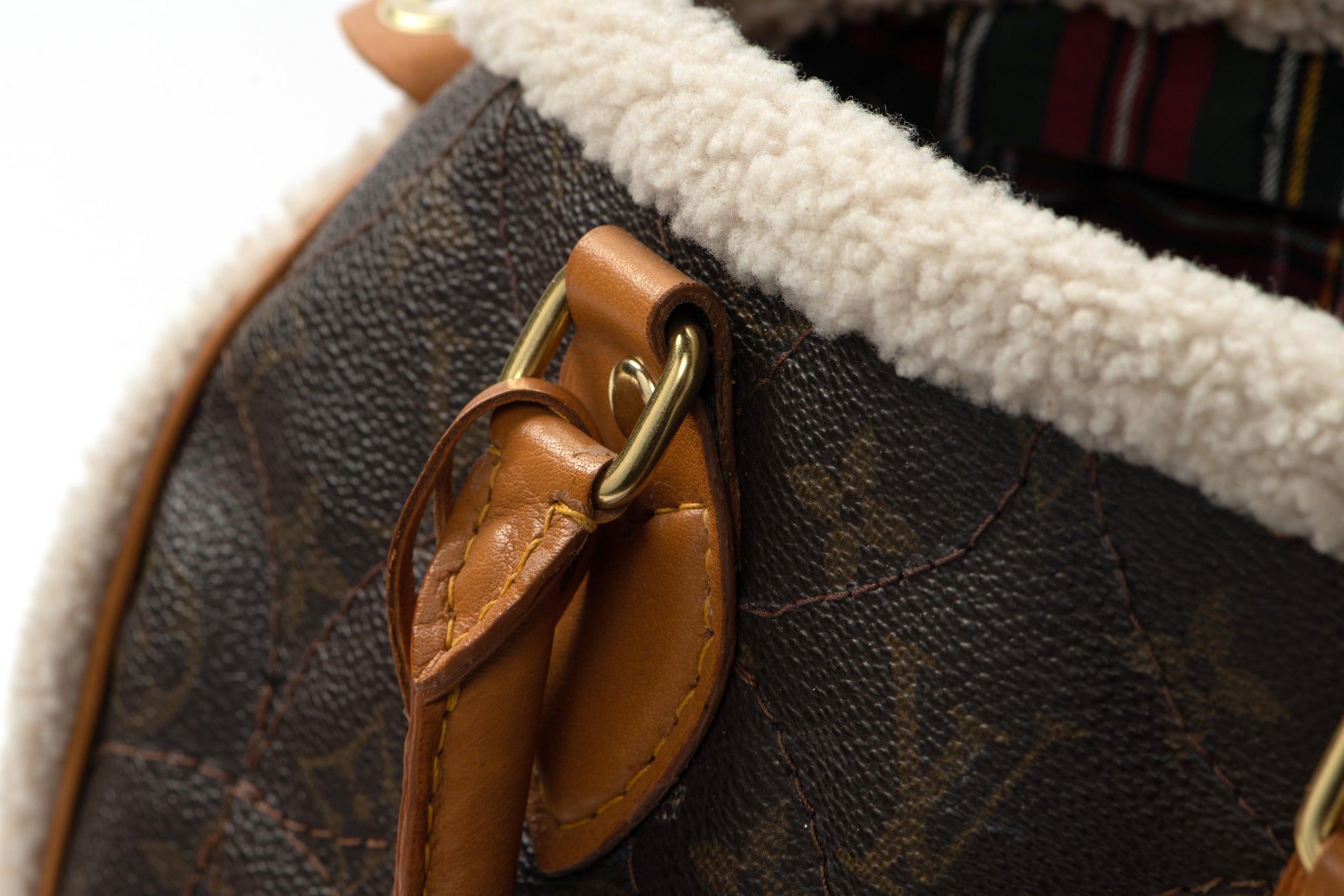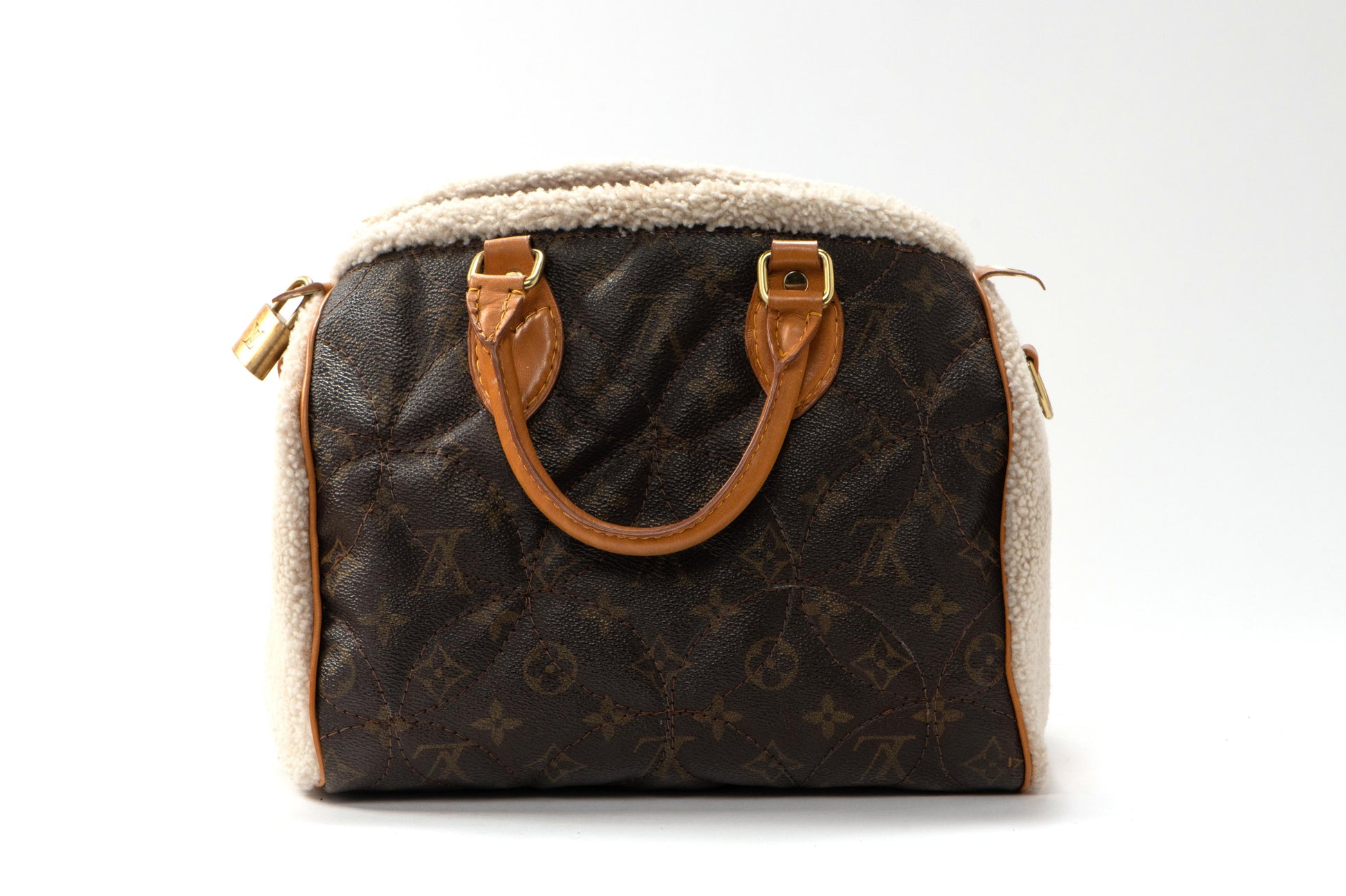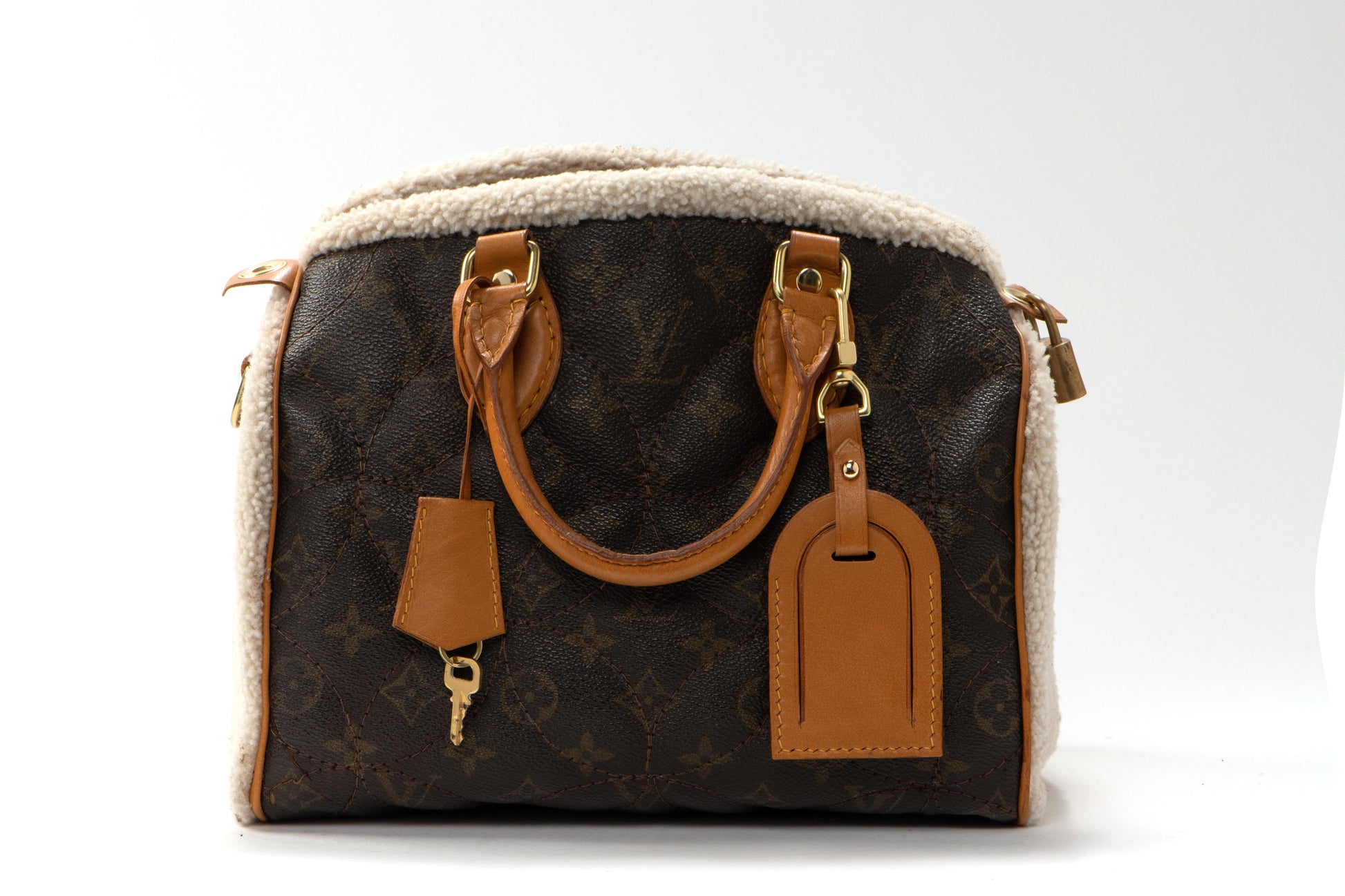 A reimagined LV speedy that brings together classic design and alpine warmth. Crafted from iconic monogram canvas and softened with genuine shearling, this piece is trimmed in natural vachetta leather and finished with gold-tone hardware. An authentic lock and key, along with a handmade luggage tag, add refined detail. A timeless silhouette made distinctive through luxurious texture and thoughtful craftsmanship.