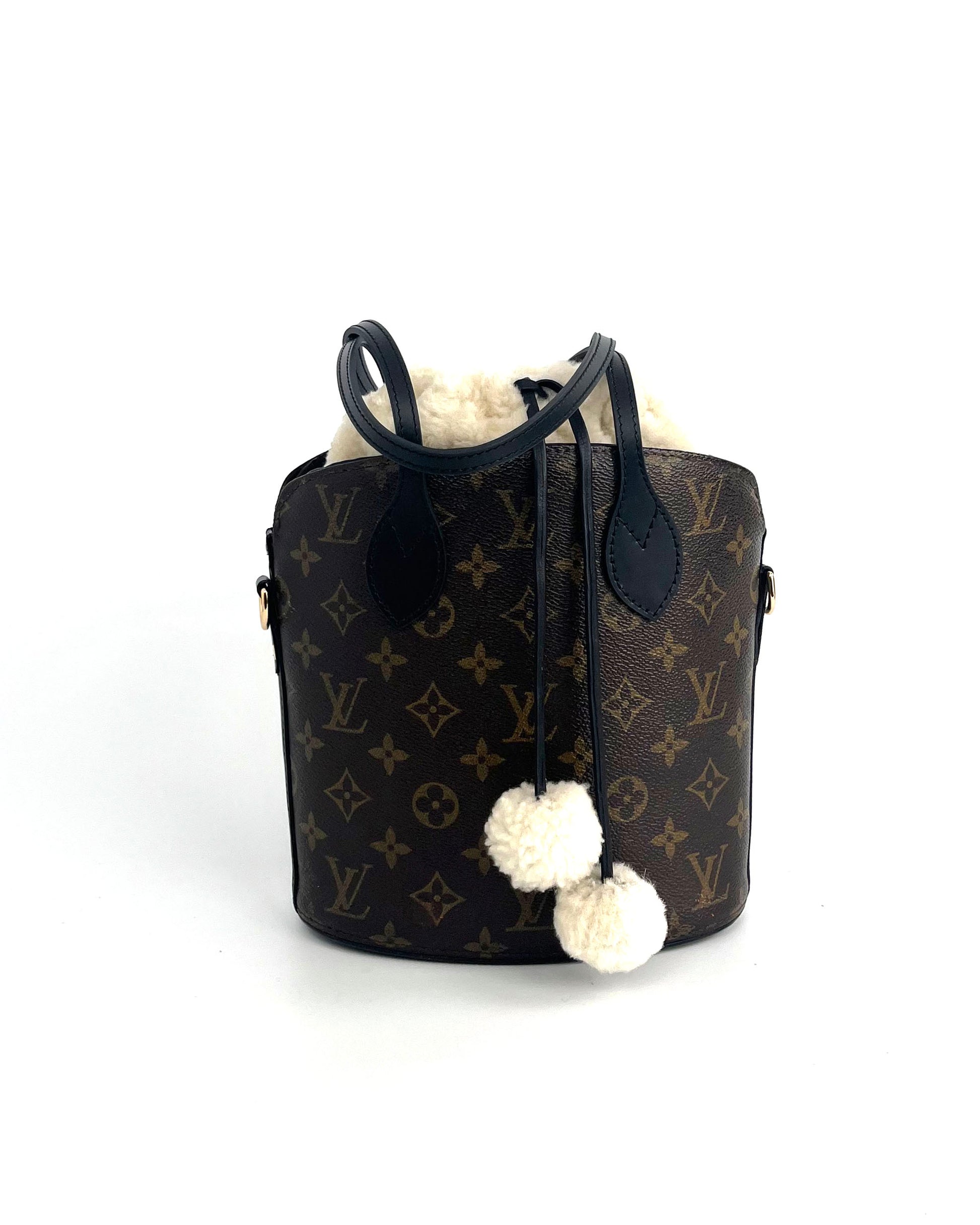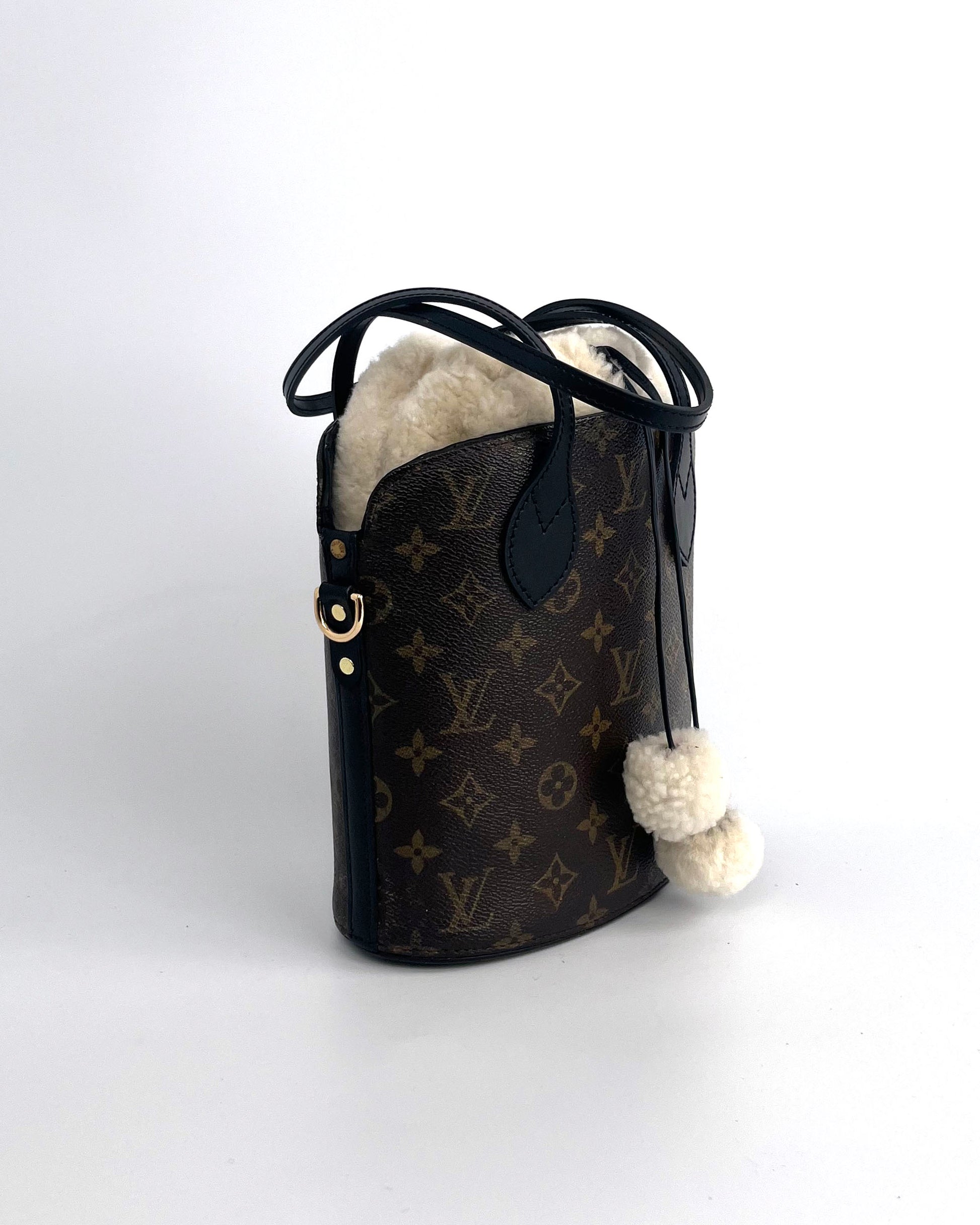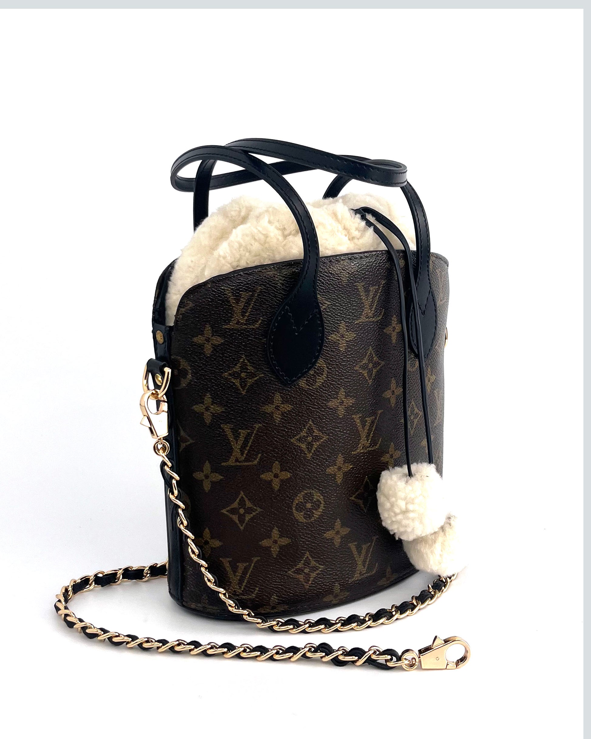 The original bag used to create this piece was an authentic vintage LV "Drouot" from the late 90's. New handles and gold tone, hardware, and black lambskin lining were added. It features a handmade, removable shearling insert and removable crossbody strap
