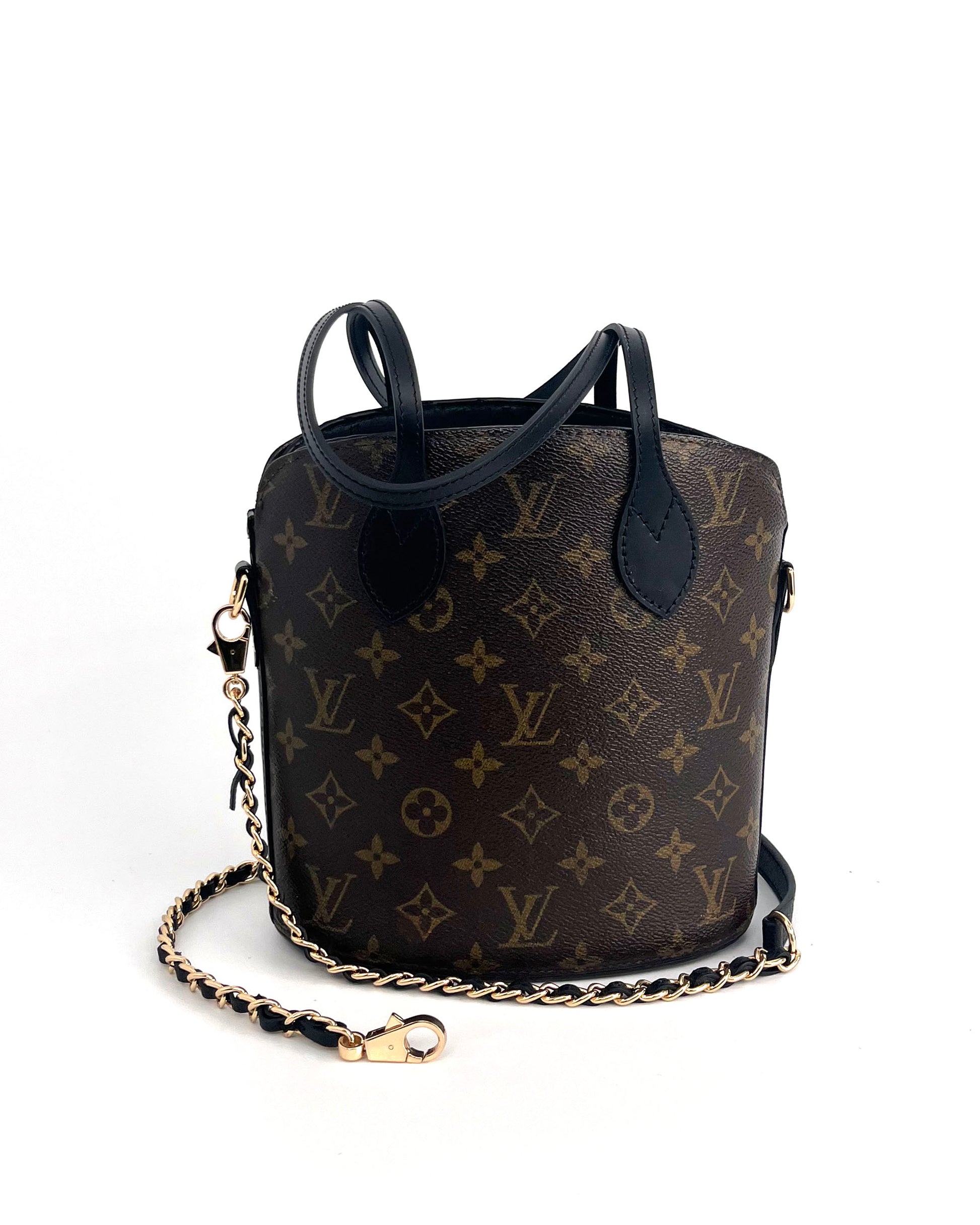 Original monogram canvas has been reworked with new black leather trim and structured black leather handles. Gold-tone hardware provides contrast and emphasizes the bag’s architectural proportions. The interior is fully lined in black lambskin.
