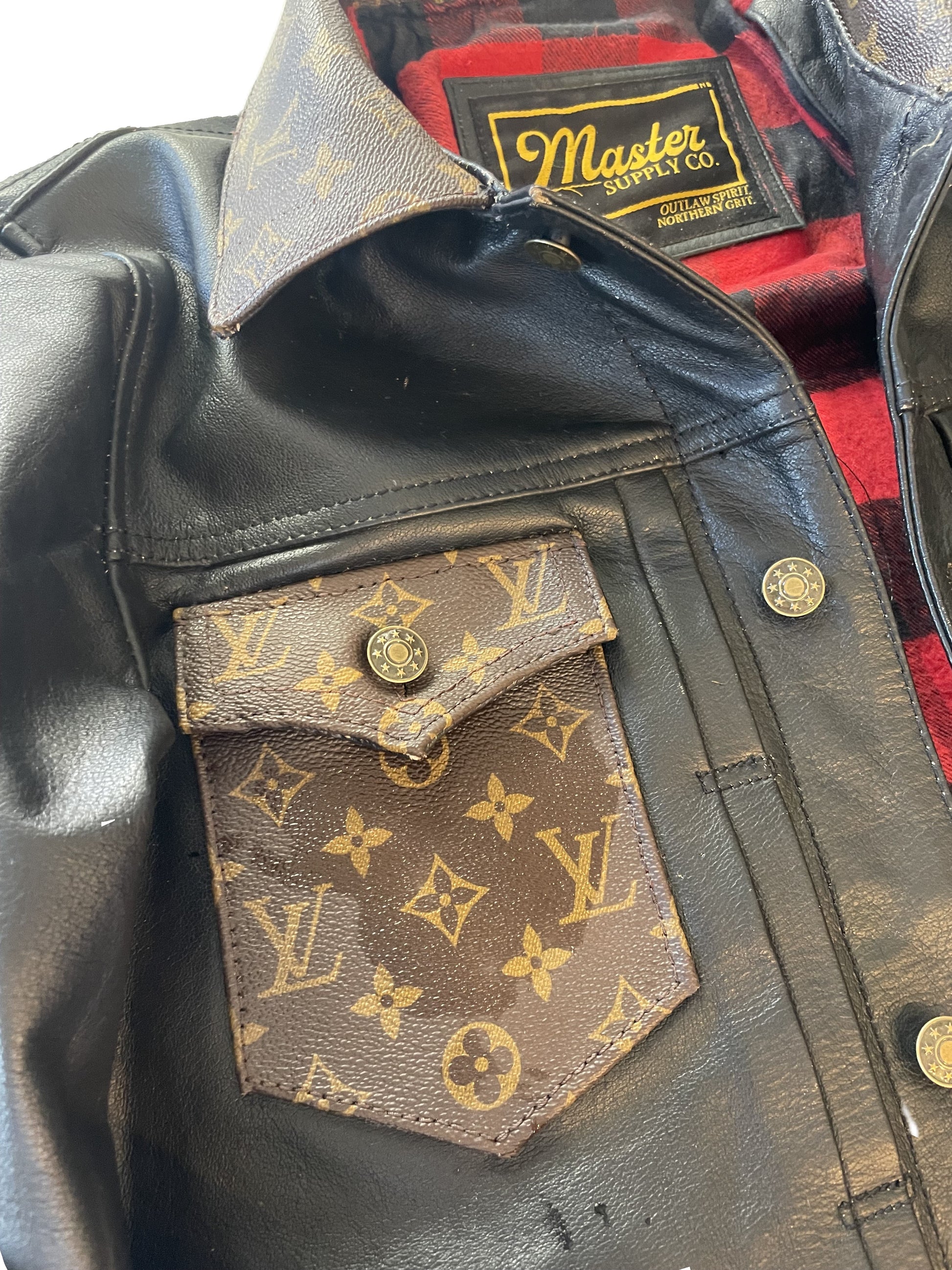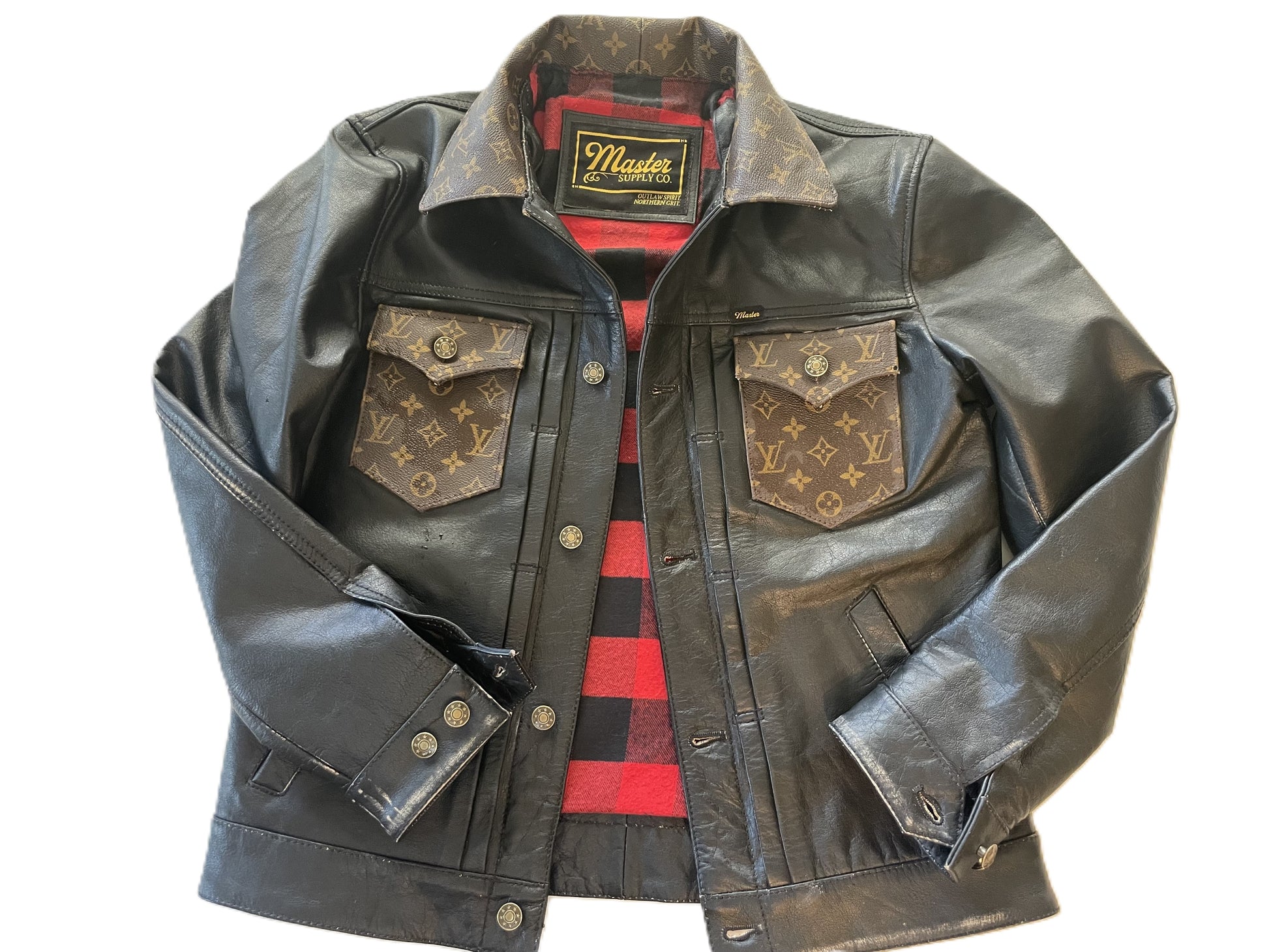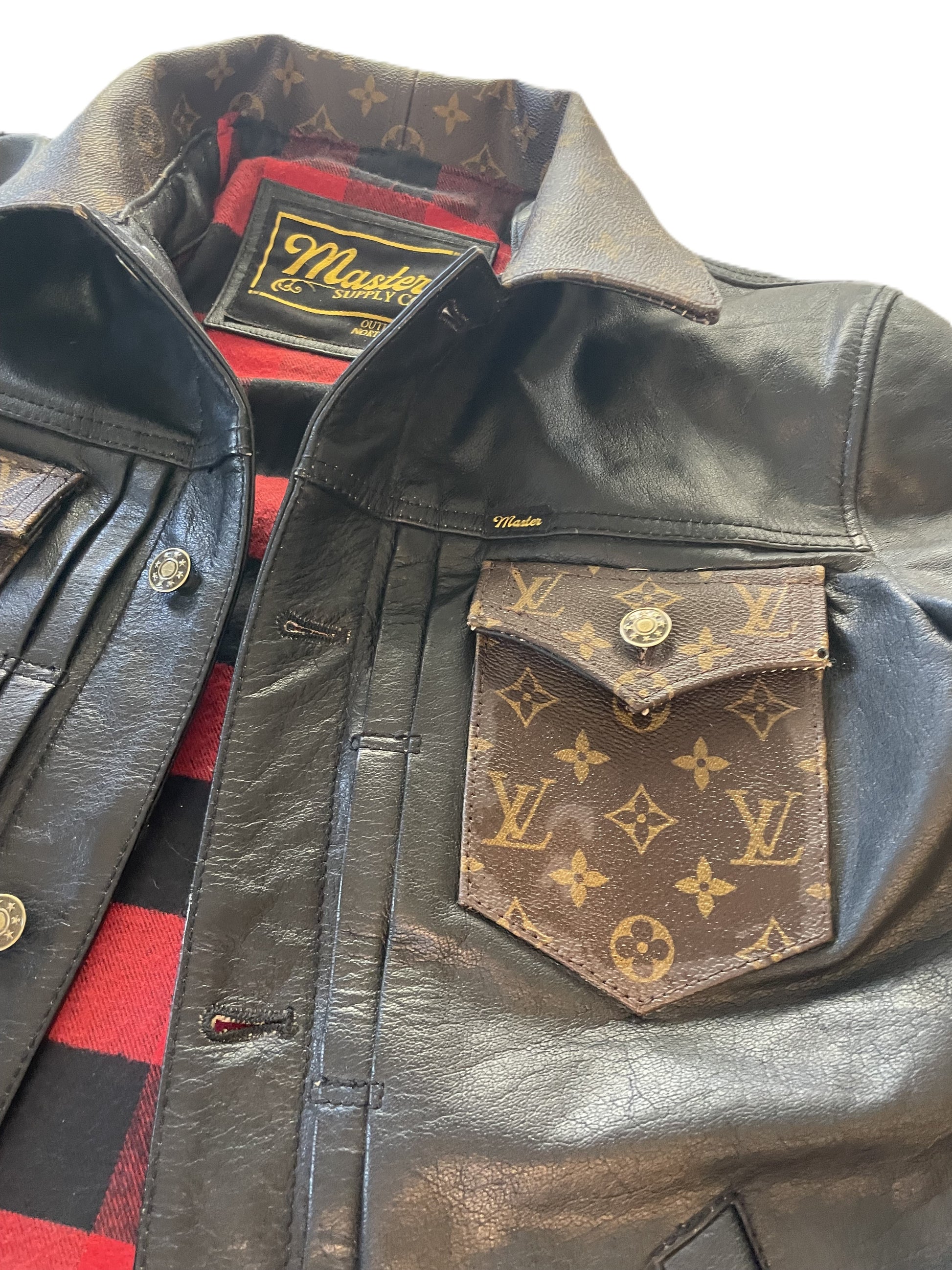 This Master Supply Co. leather trucker jacket was custom detailed with authentic Louis Vuitton monogram canvas on the back panel, collar, and both front pockets. The outer shell is black leather with western-style flap pockets and snap closures, while the interior is fully lined in red-and-black buffalo check. A one-off statement piece blending rugged construction with iconic luxury.