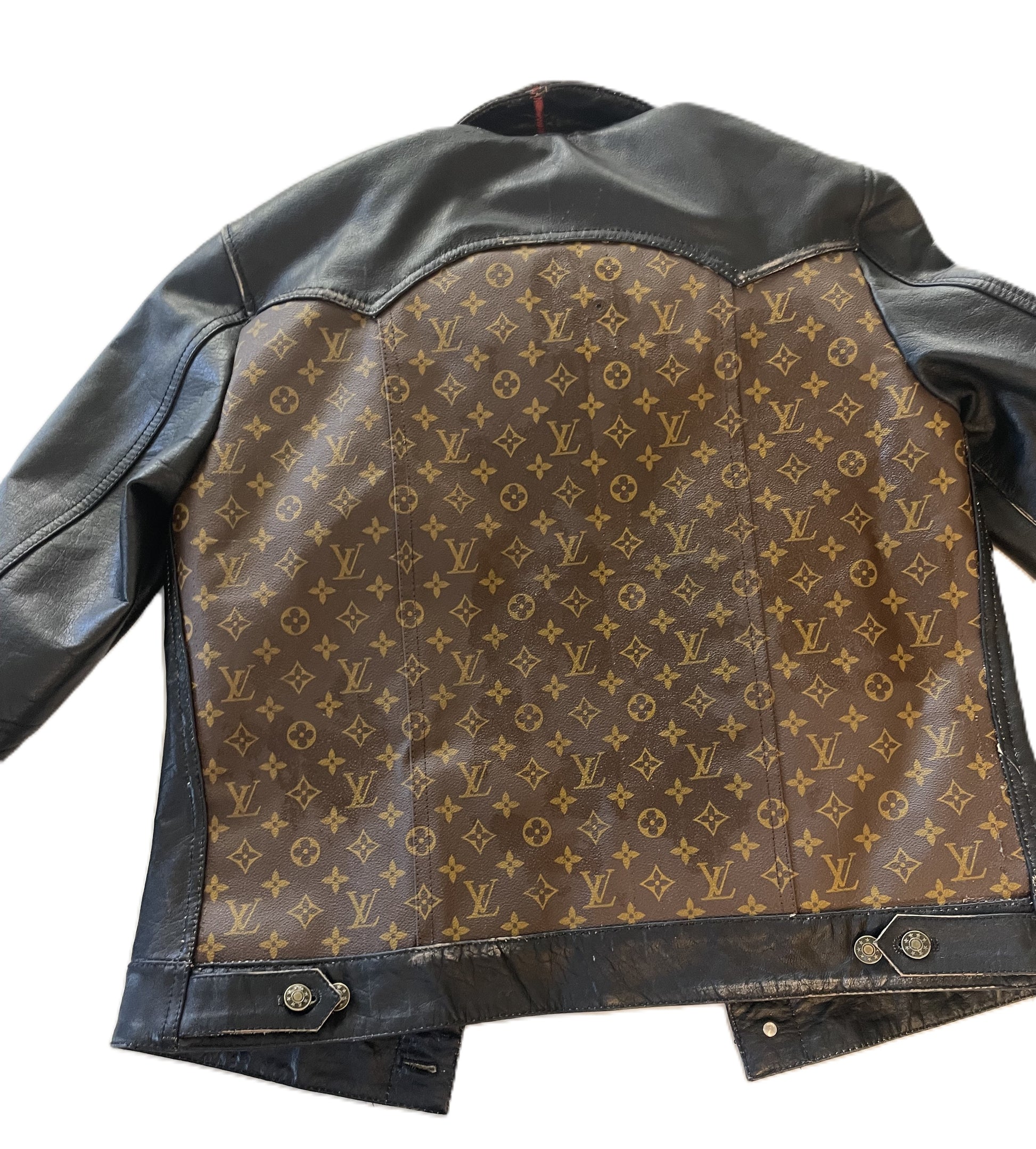 This jacket's original back, collar, and front pockets were removed and replaced with authentic vintage LV Canvas
