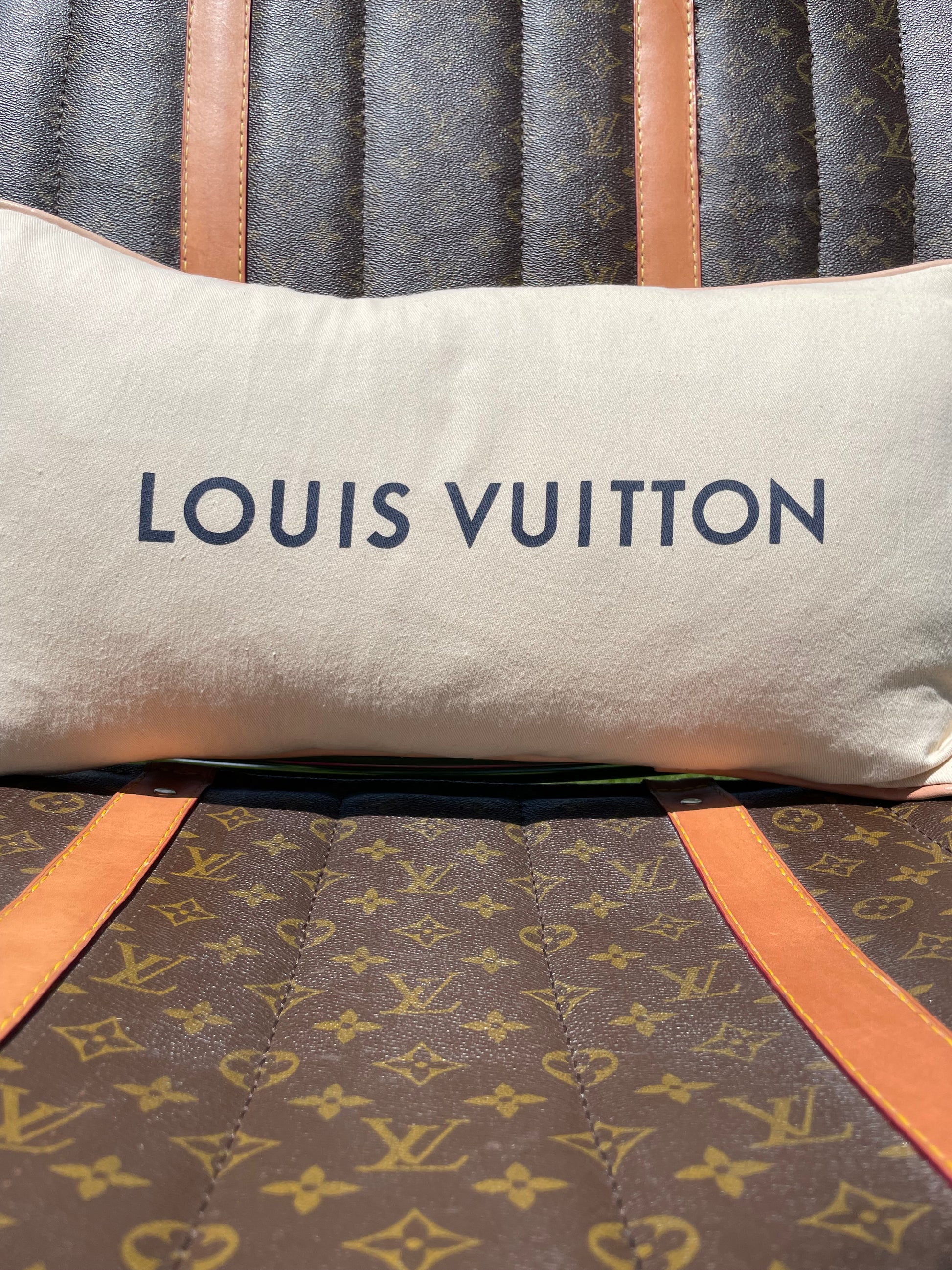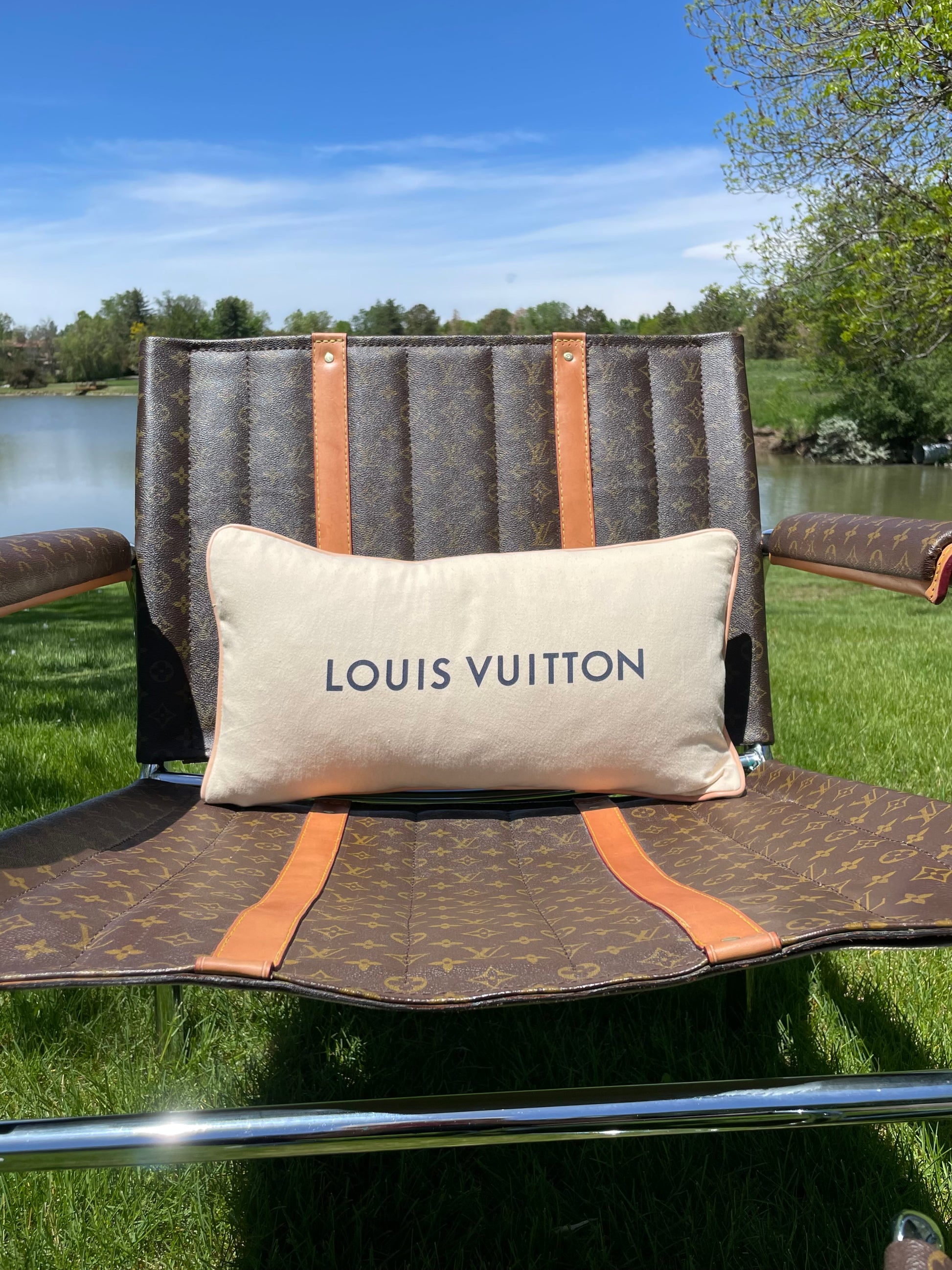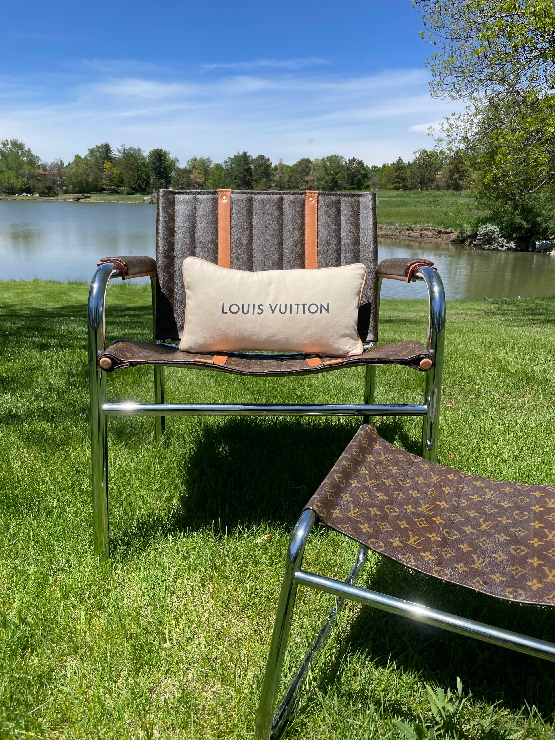 This custom armchair and footstool set features a 1980s chrome frame, reimagined with authentic LV monogram canvas and Vachetta leather straps while the custom pillow is made from an original LV dust bag and finished with Vachetta piping. A one-of-a-kind piece that blends vintage structure with iconic materials.