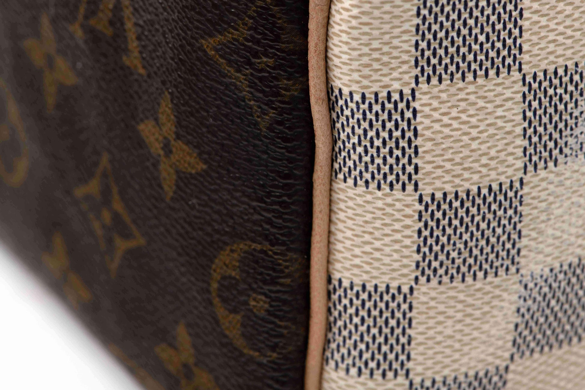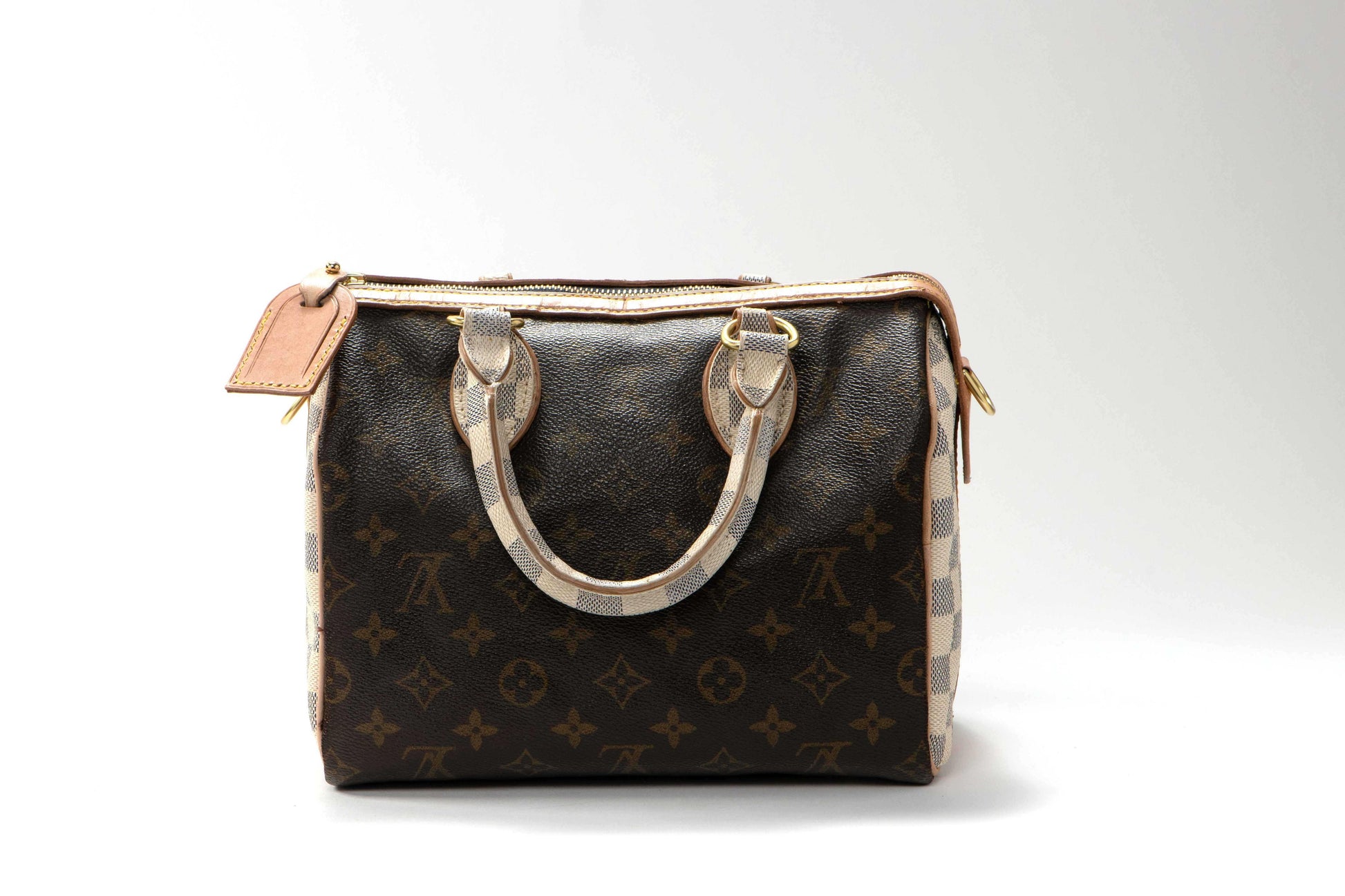 A masterfully crafted reimagined handbag showcasing the perfect harmony between classic monogram and elegant damier azur canvas. This sophisticated piece features rich brown monogram canvas beautifully contrasted with crisp white and blue, creating a timeless yet contemporary aesthetic. The premium vachetta leather handles, accents and crossbody strap offers both luxury and versatility.