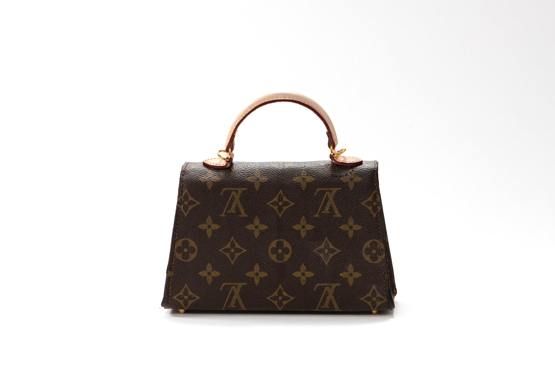 This stunning top handle mini bag is handcrafted from authentic vintage LV monogram canvas with natural vachetta leather and gold-tone hardware. An elevated expression of understated luxury.