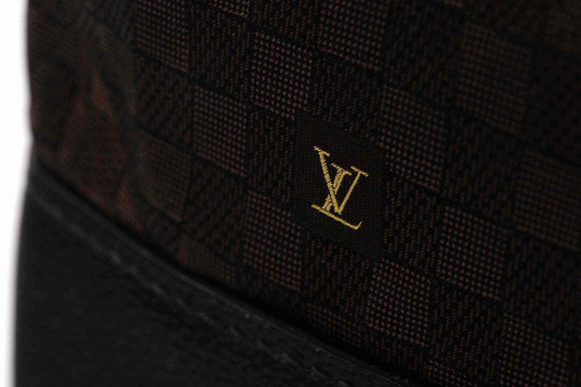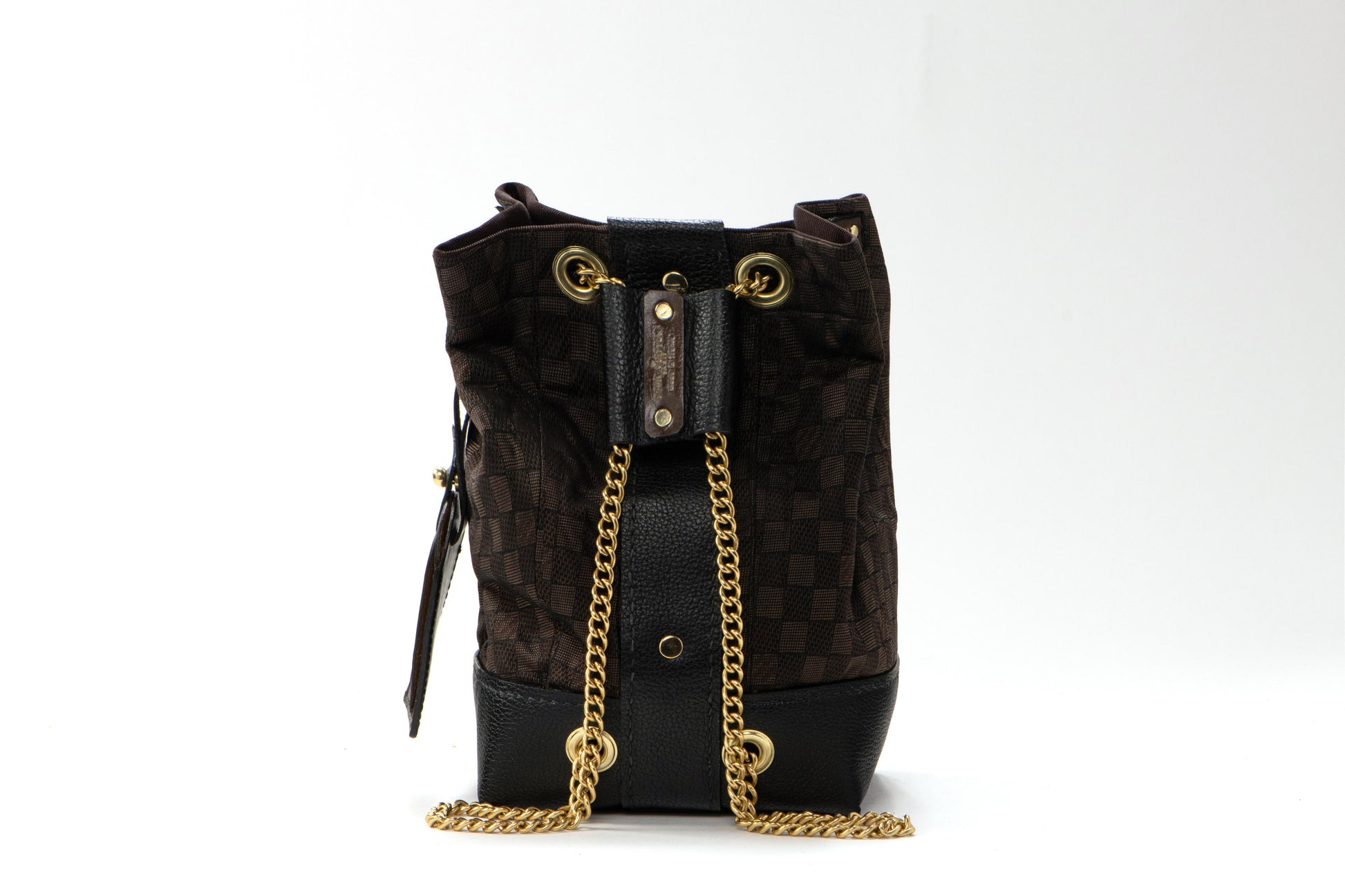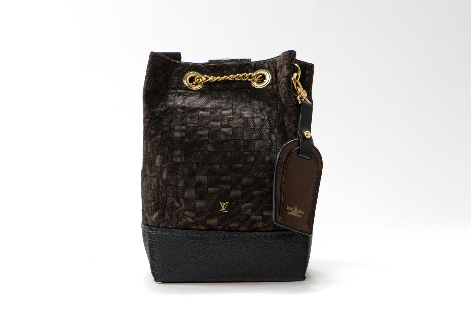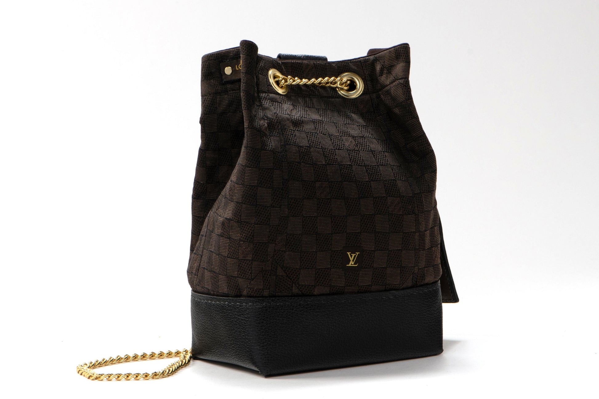 Handcrafted from an authentic LV silk necktie featuring a rich brown and black damier pattern with elegant gold monogram detailing. The black leather and stunning brass hardware add elements of true sophistication. This luxurious creation showcases the perfect balance of classic heritage patterns and contemporary refinement, representing the finest in artisan craftsmanship and timeless design.