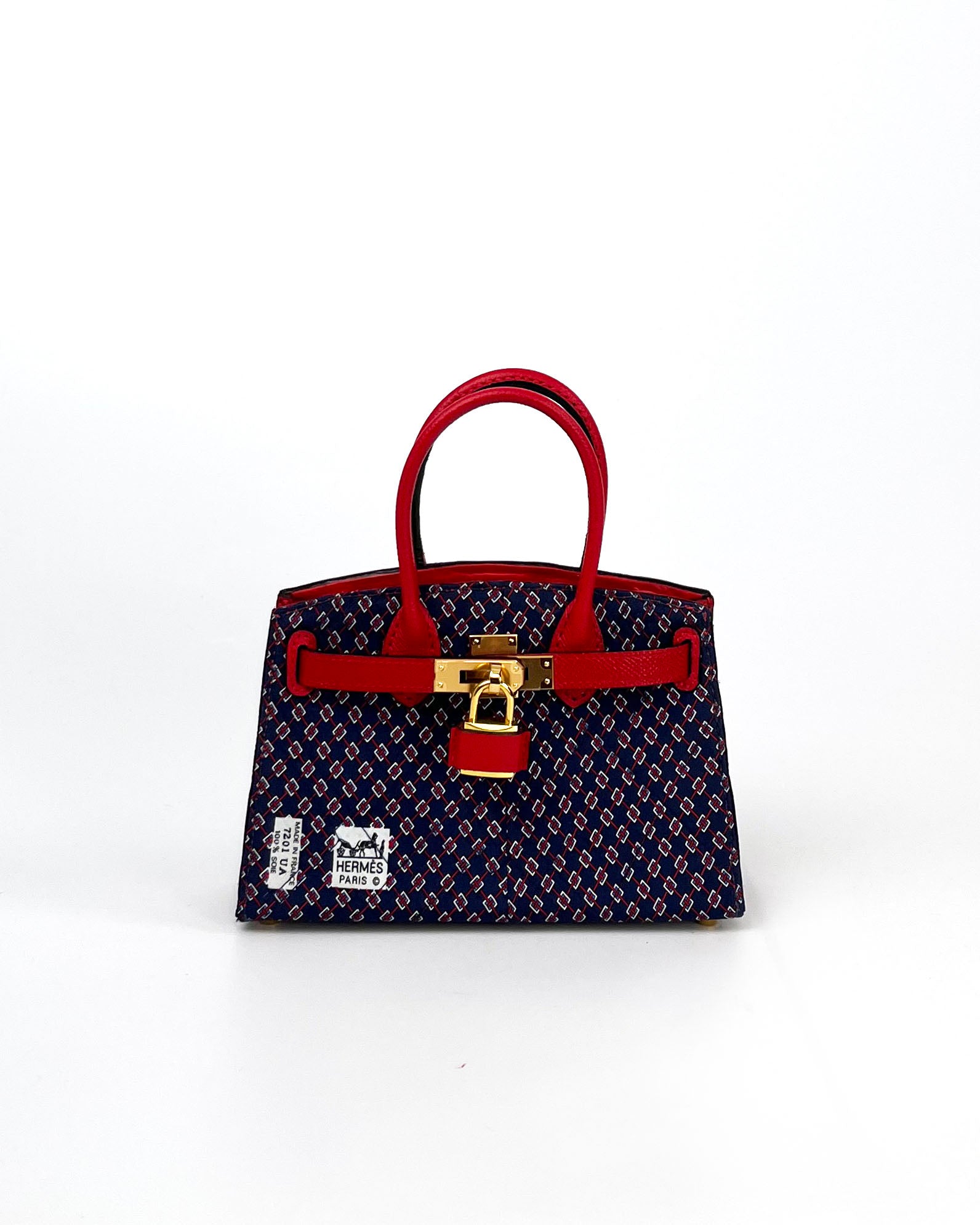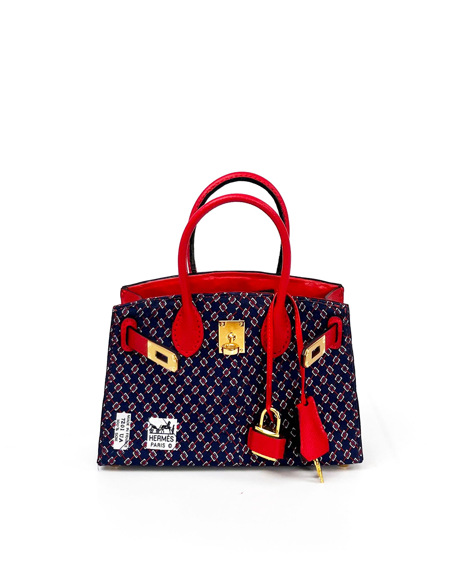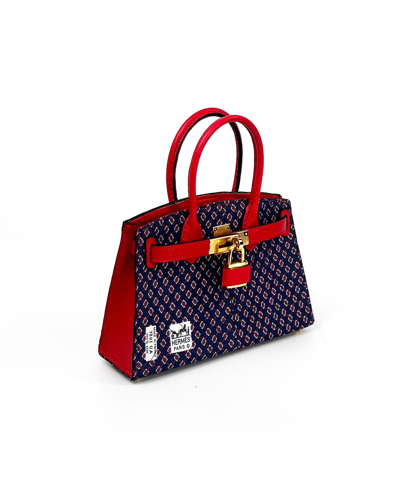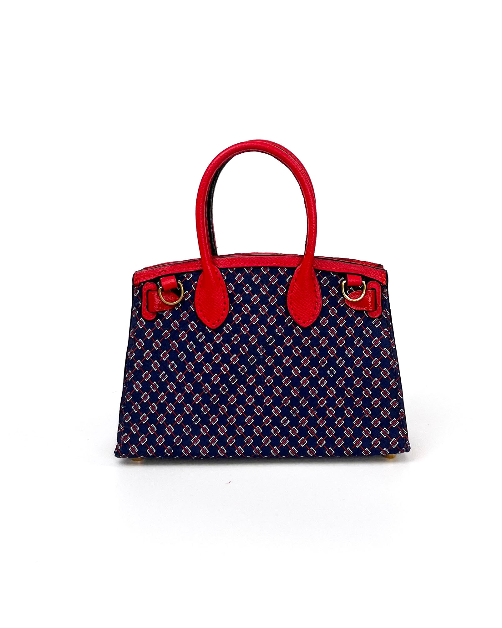 A "mini" iconic luxury accessory handcrafted from an authentic vintage silk Hermès necktie with a rich navy and red pattern. Perfect for the connoisseur who appreciates both luxury craftsmanship and bold artistic expression in wearable form.