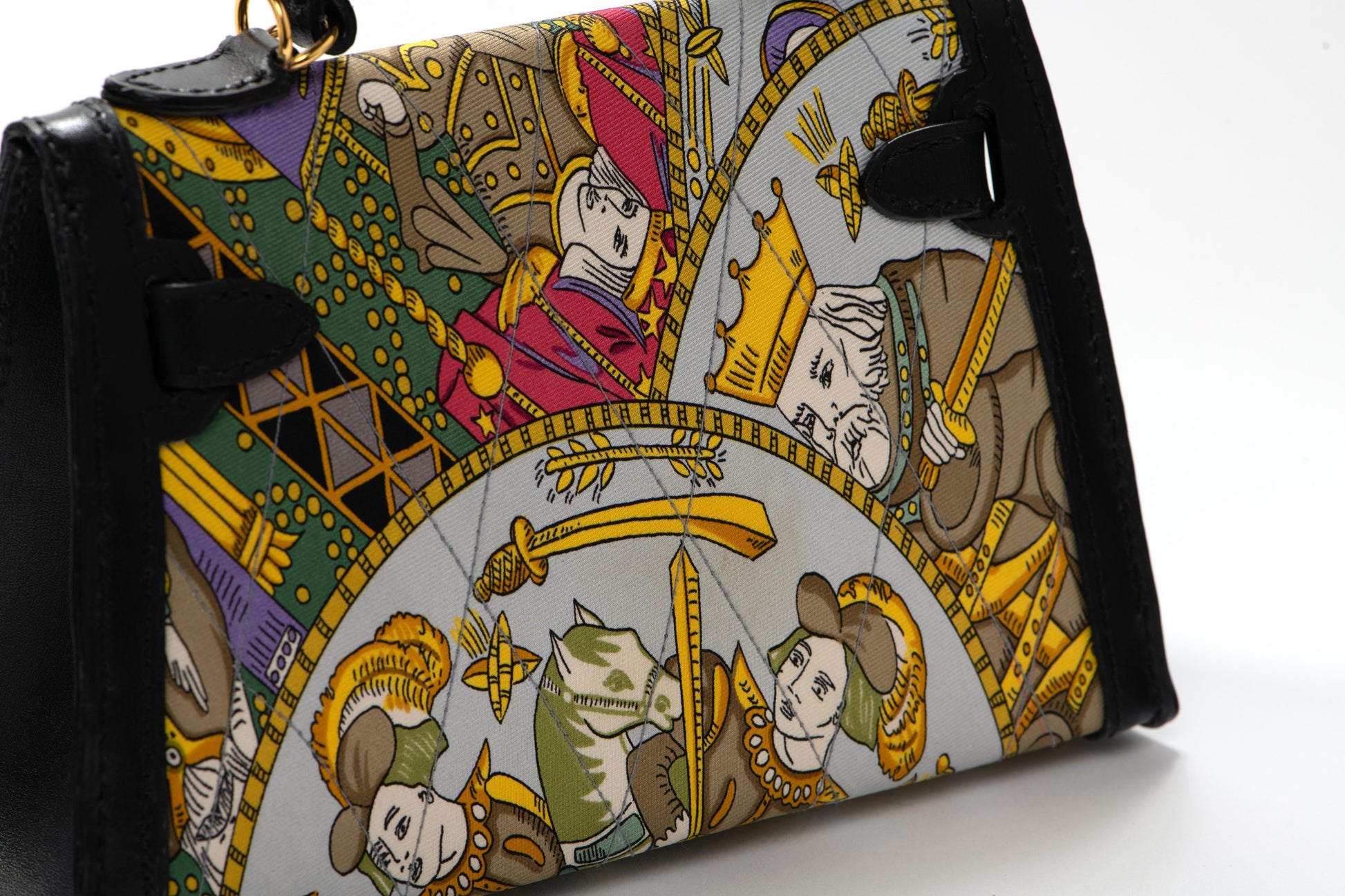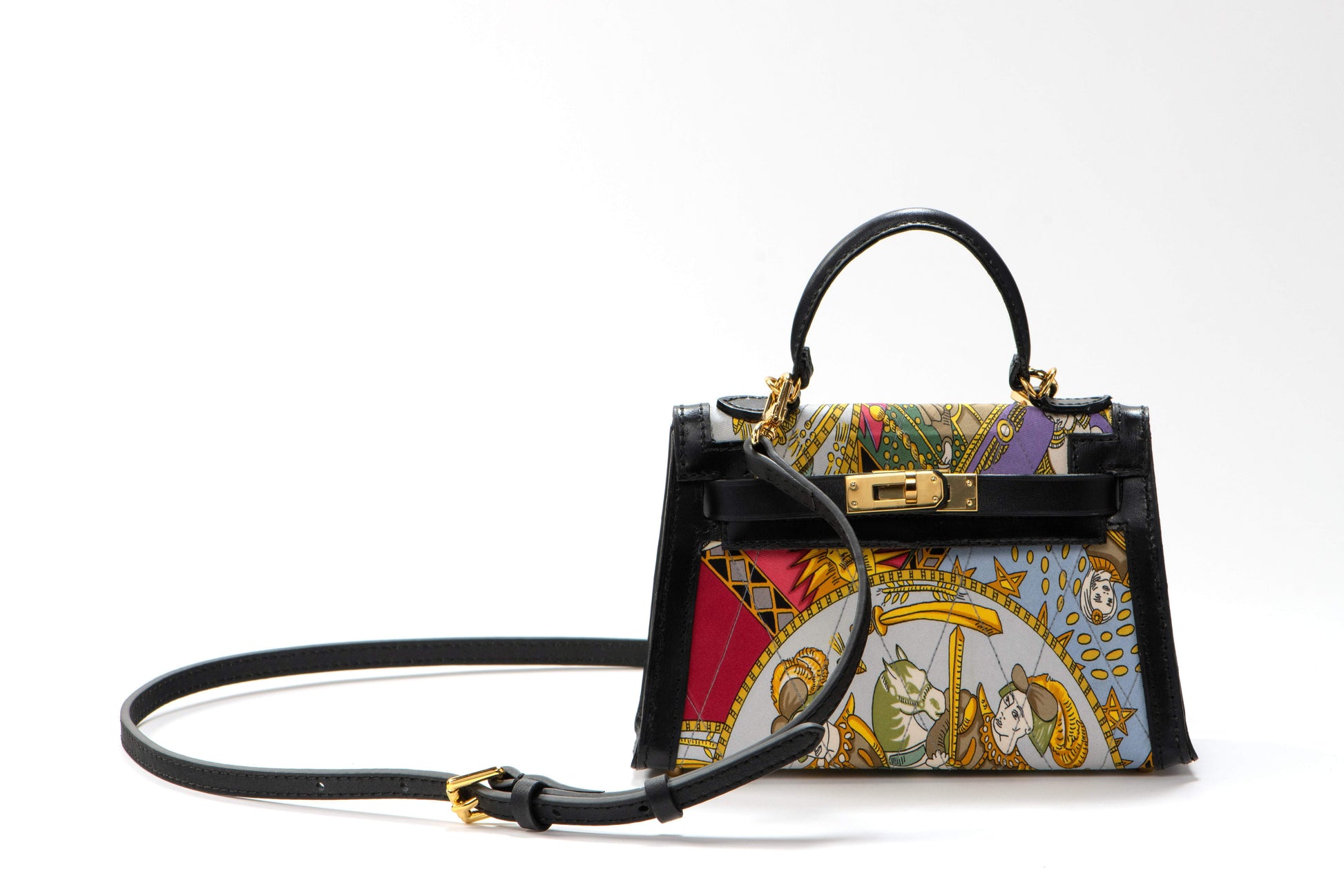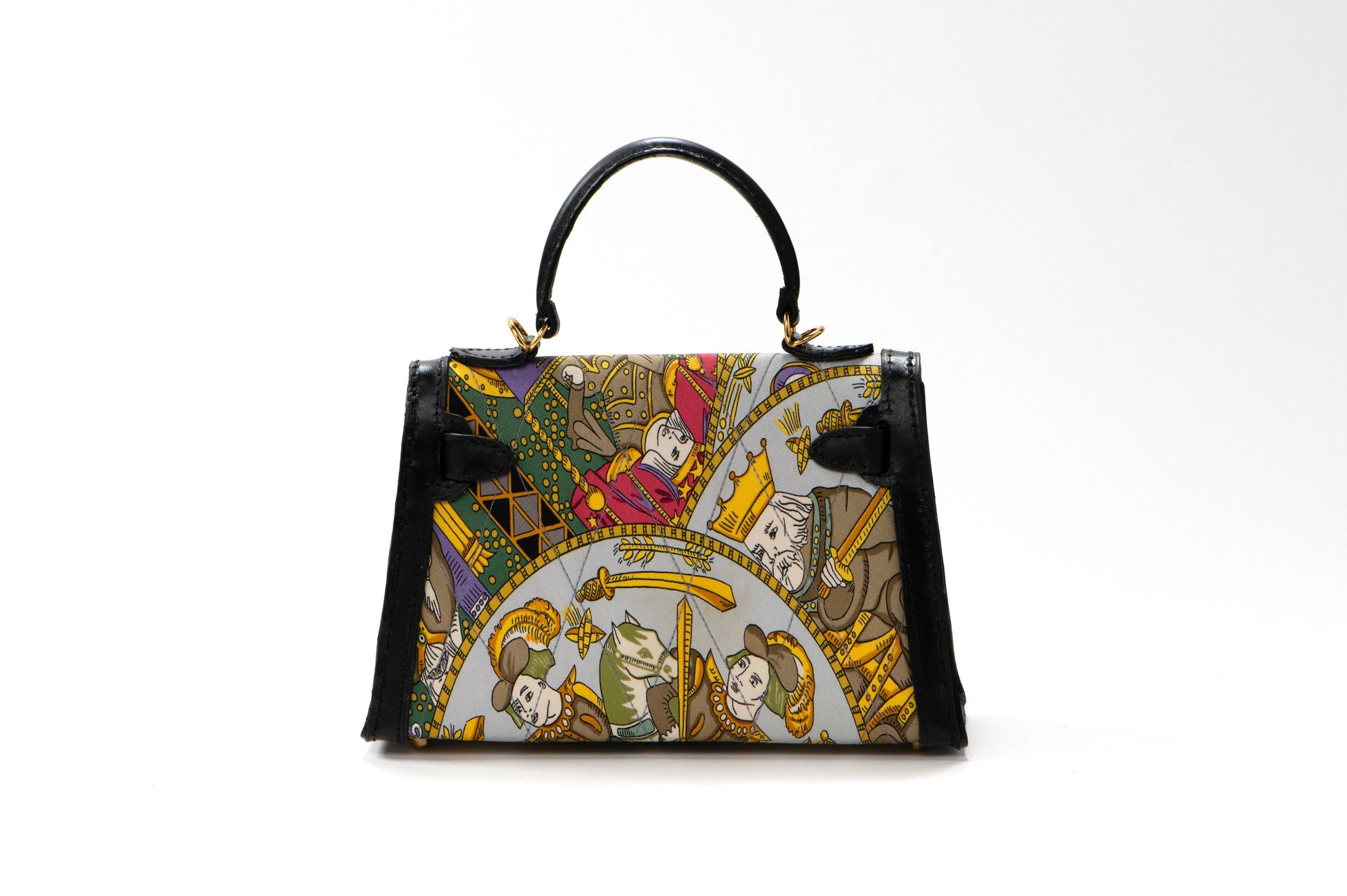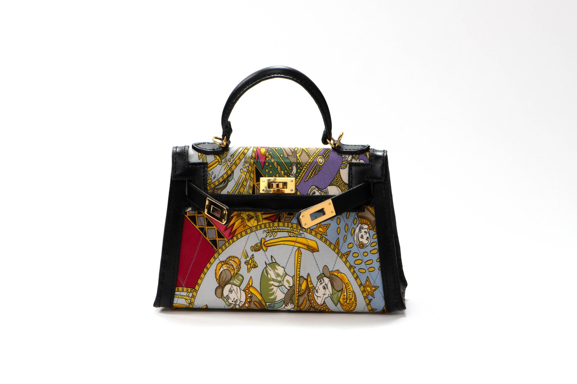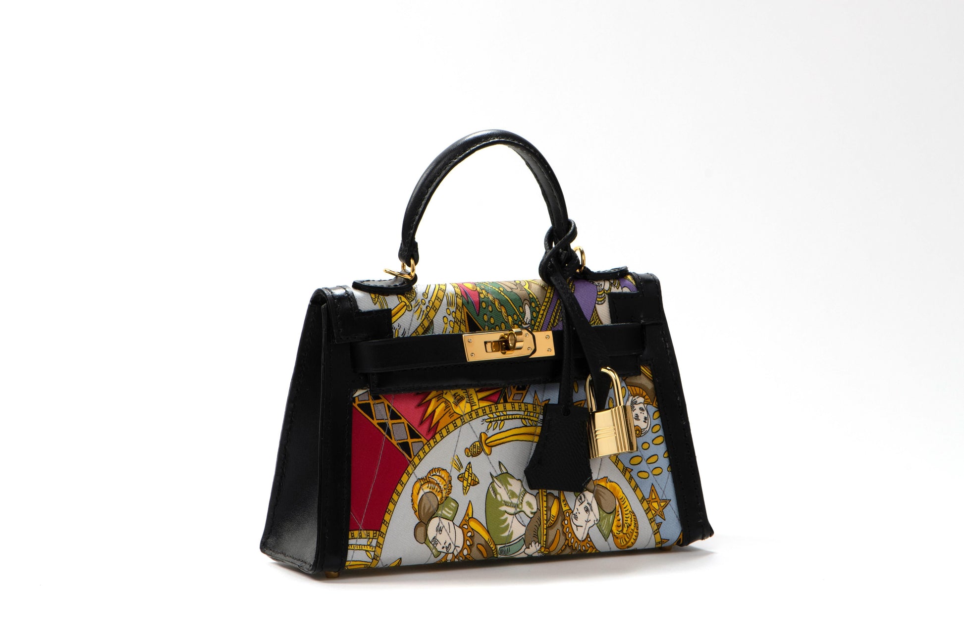 A statement in artistry and heritage, this one-of-a-kind handbag is handcrafted from a vintage Hermès silk tie, framed in smooth black box leather, and finished with gold-tone hardware. Iconic equestrian motifs in rich jewel tones bring character and storytelling to every angle.