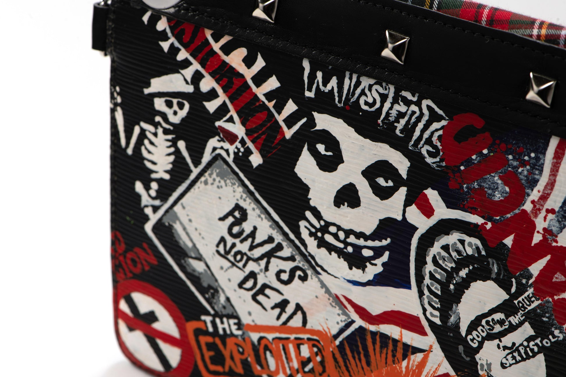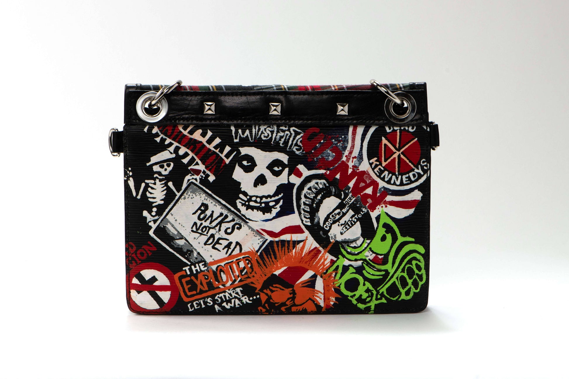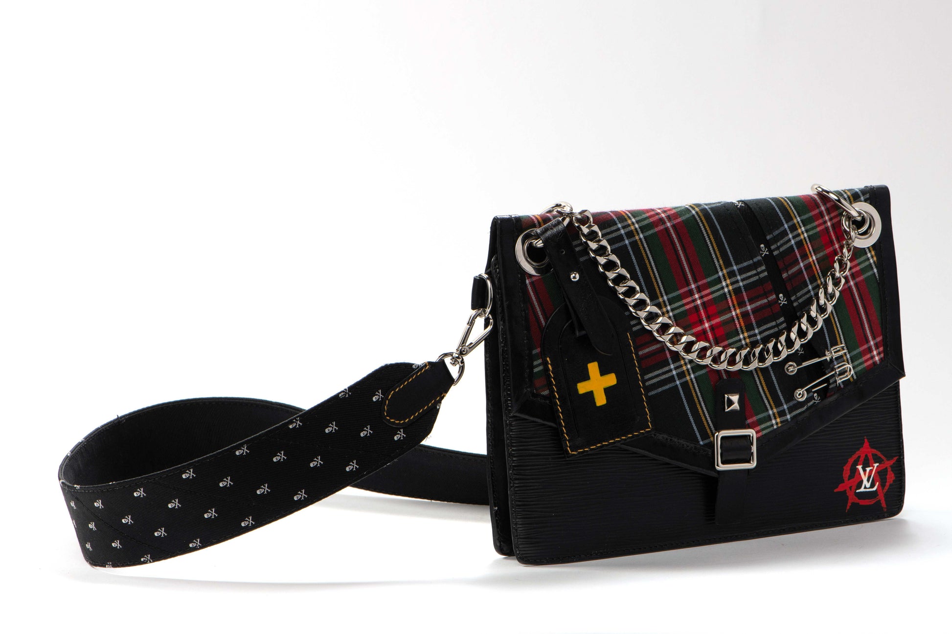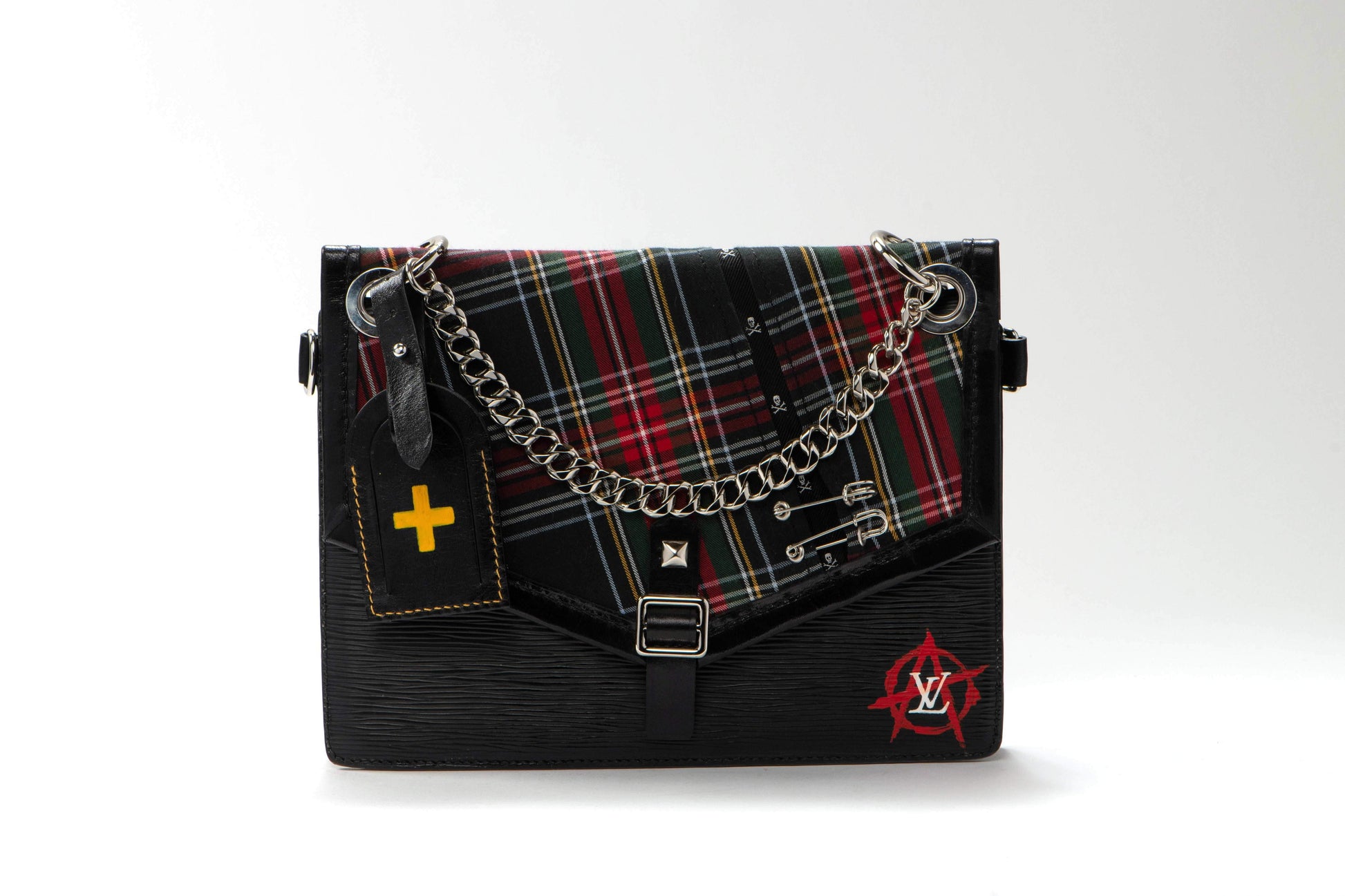A bold and rebellious reimagined handbag featuring edgy punk rock aesthetics with red tartan plaid accents and striking black leather. This extraordinary piece showcases artistic graffiti-inspired detailing on the reverse, complete with skull imagery, band references, and rebellious motifs. The design includes dramatic chain hardware, metal studs, and a distinctive yellow cross charm, creating the perfect fusion of luxury craftsmanship with underground culture expression.