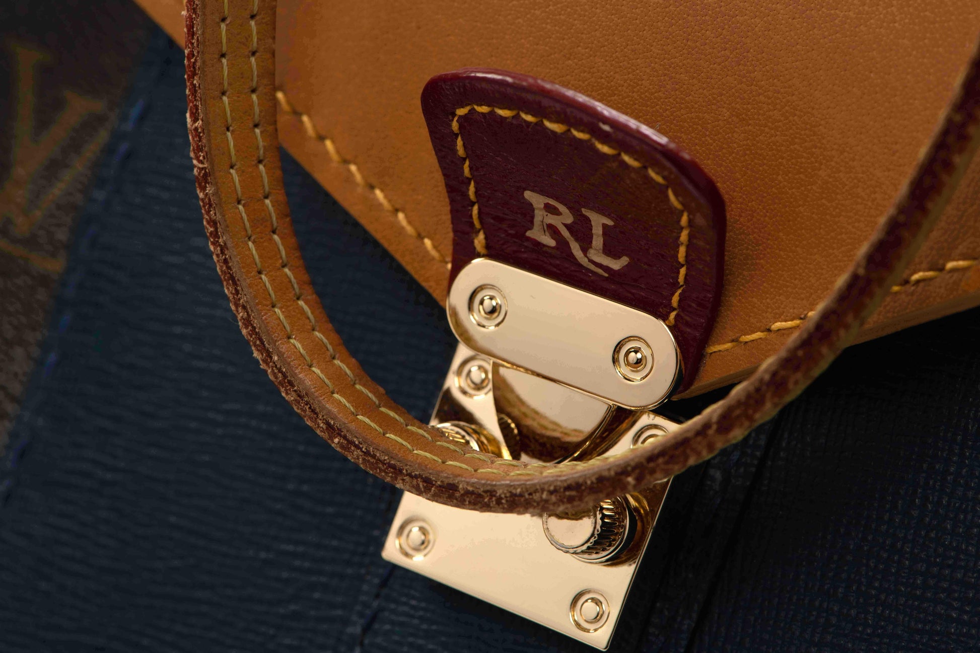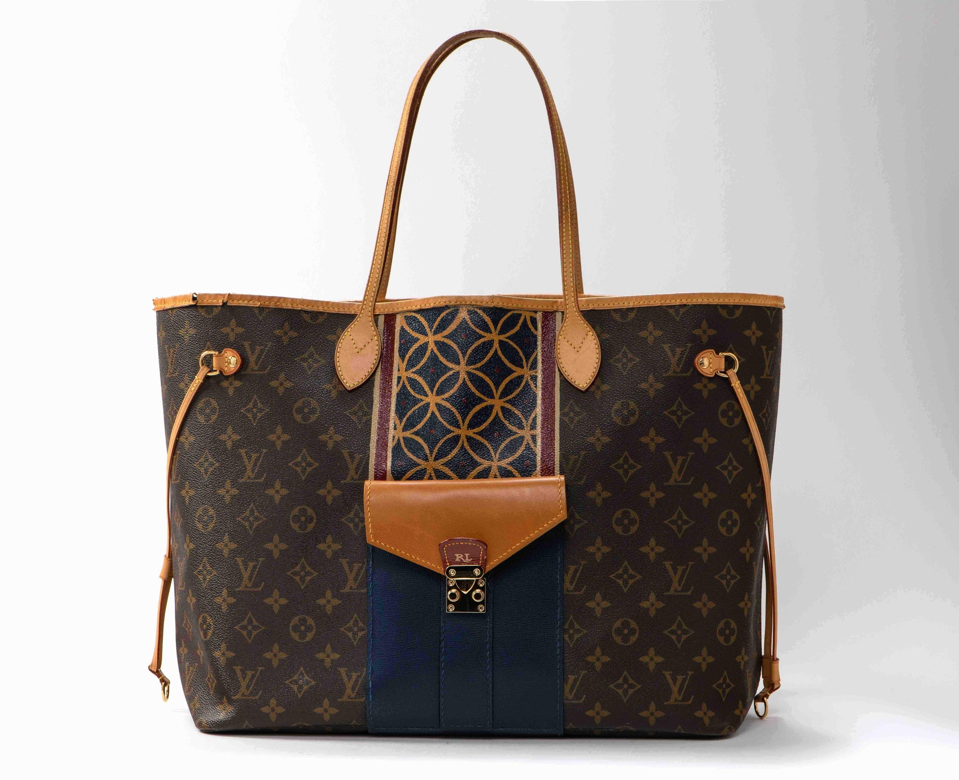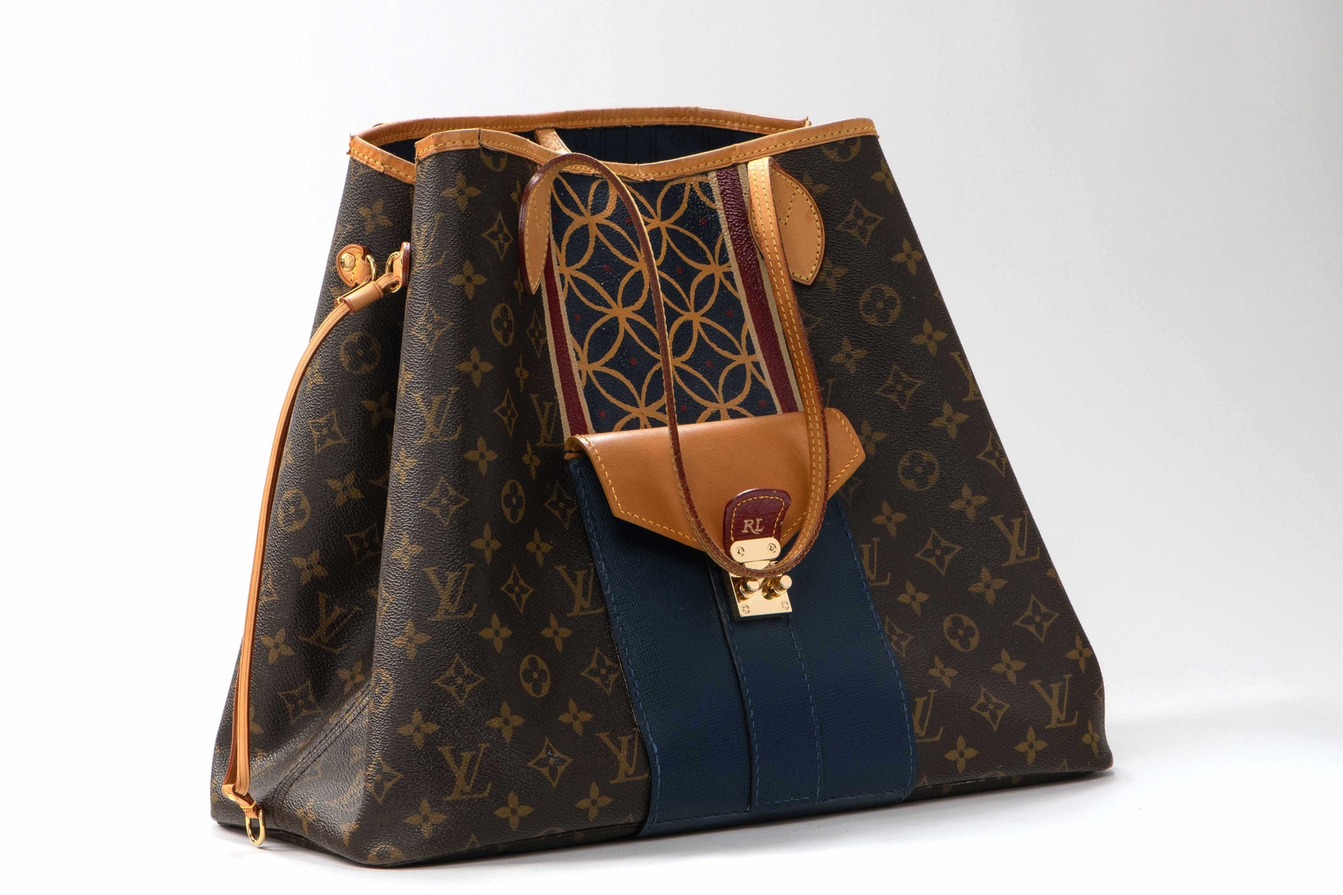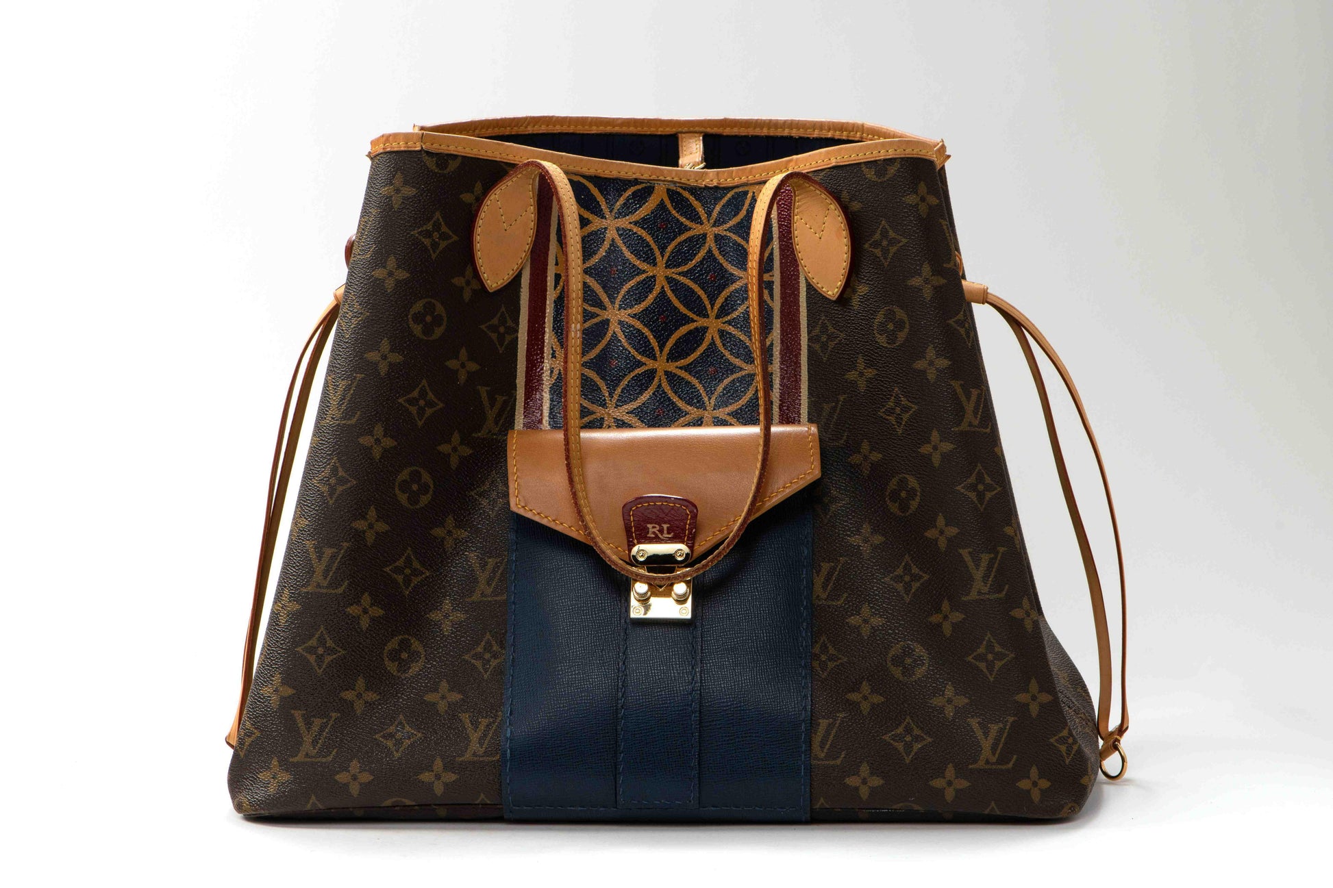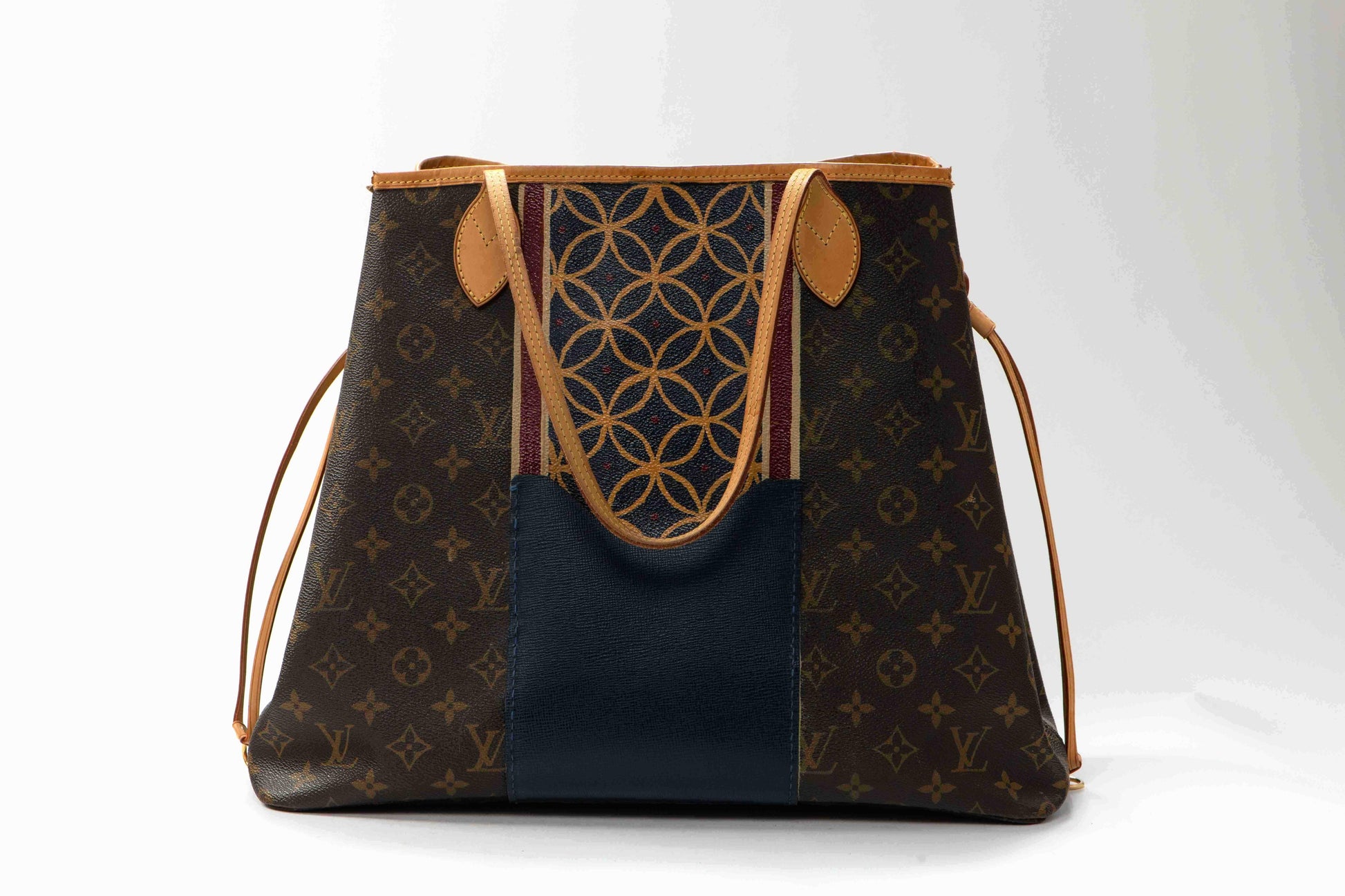 An exquisite reimagined LV neverfull featuring classic monogram canvas beautifully contrasted with a sophisticated navy blue center panel and elegant geometric pattern detailing. This luxurious piece showcases rich cognac leather trim, premium gold hardware, and meticulous craftsmanship. The design offers both tote and drawstring functionality, making it perfect for the modern woman who appreciates timeless elegance with contemporary functionality.