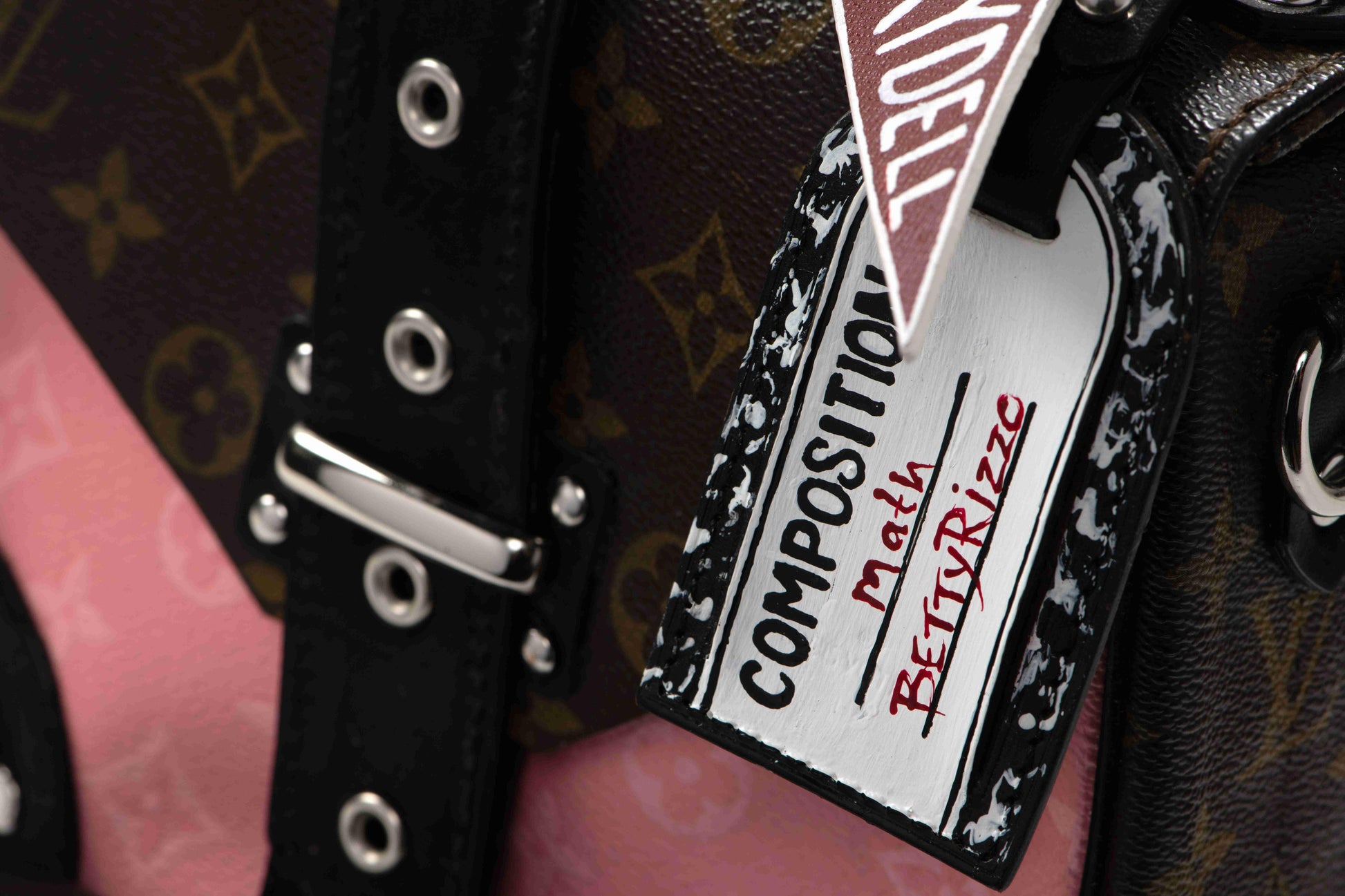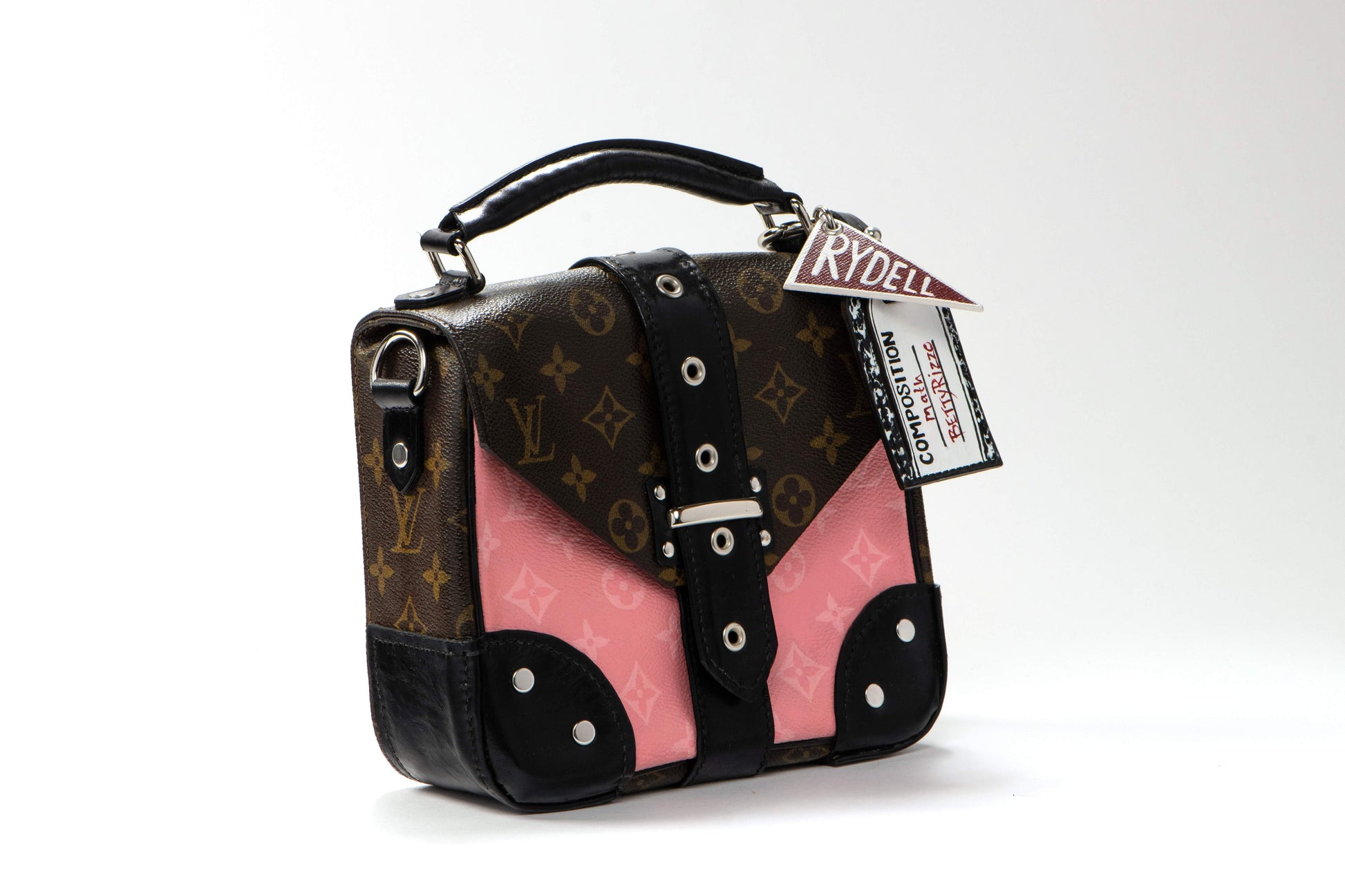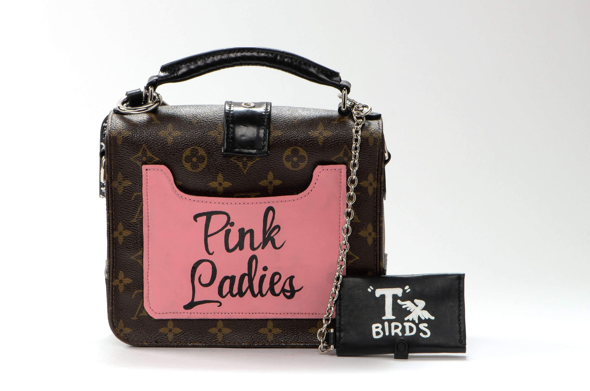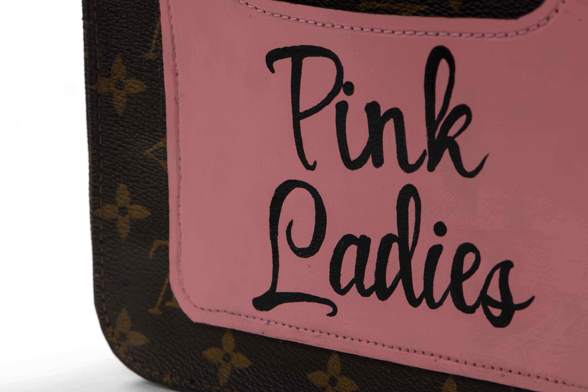 A playful and nostalgic reimagined handbag featuring classic monogram canvas with a bold pink leather panel inscribed with "pink ladies" in elegant script. This charming piece pays homage to vintage americana with its retro aesthetic, complemented by edgy black leather trim and silver hardware. Perfect for the modern woman who appreciates both luxury craftsmanship and pop culture.