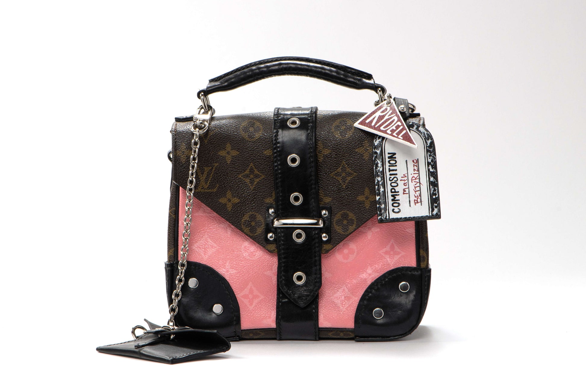 The original bag used to create this piece was an authentic LV "cartouchiere". Serial number 883 sl made in france march 1983. The top handle and new silver tone hardware were added and the design was modified to reflect more modern style and functionality. The original vachetta leather was dyed and finished black. Hand painted to embody all that is "pink ladies".