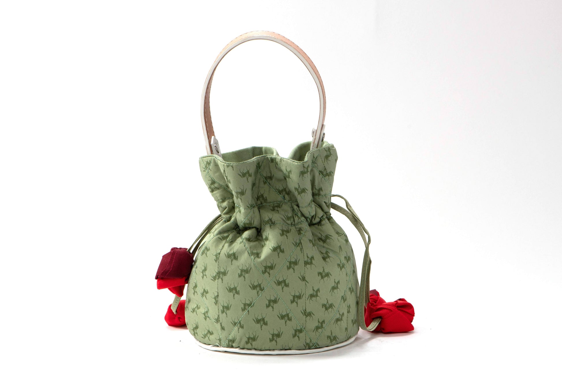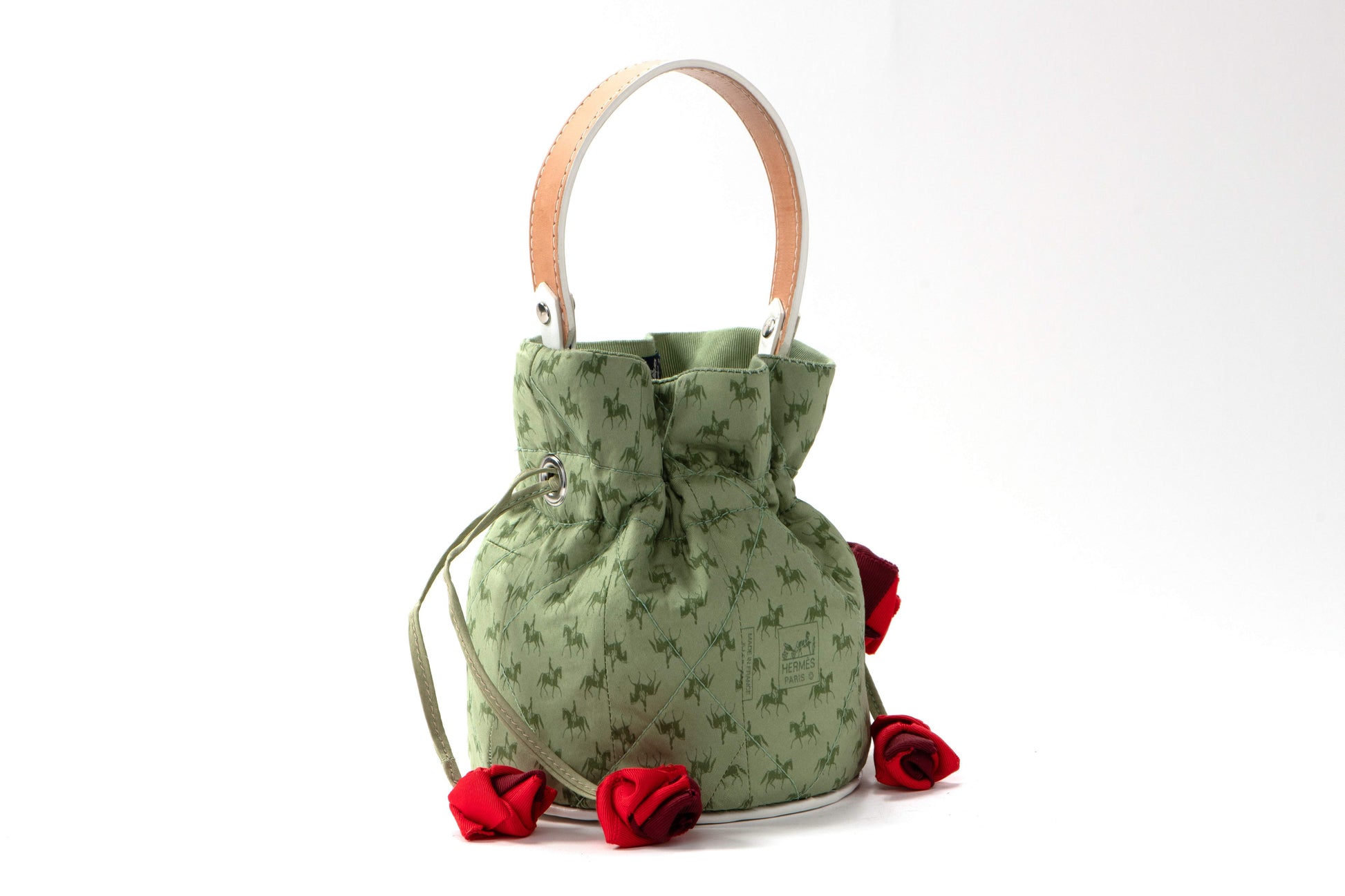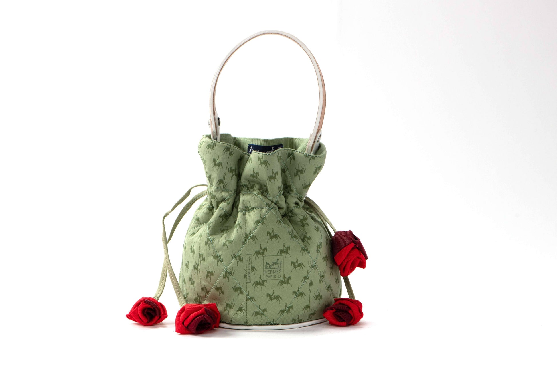 An elegant bag handcrafted from a vintage silk Hermès necktie featuring the iconic Hermès horse and rider pattern. This refined piece showcases exquisite craftsmanship with beautiful red rose detailing. The soft green palette combined with luxury quilting creates a timeless and sophisticated statement piece perfect for the discerning fashion enthusiast.