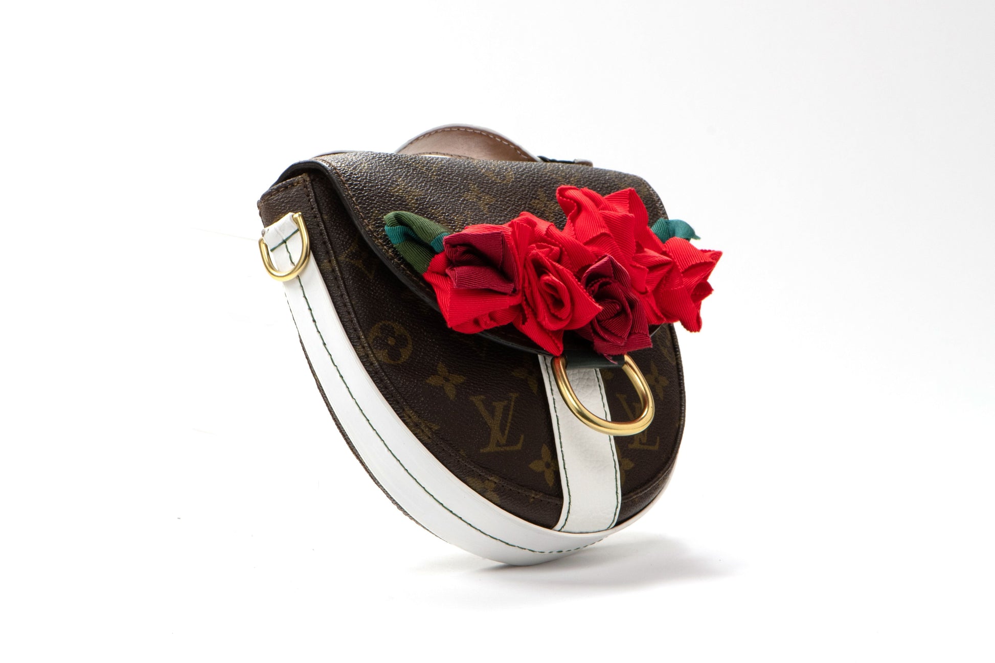 A romantic reimagined piece with an equestrian feel featuring exquisite handcrafted red petersham roses as stunning decorative elements. This charming accessory showcases meticulous attention to detail with beautifully crafted floral embellishments that give a nod to "the winner's circle" and add artisanal sophistication to the classic luxury silhouette. It can be carried as a clutch or as a shoulder or crossbody using the adjustable strap.