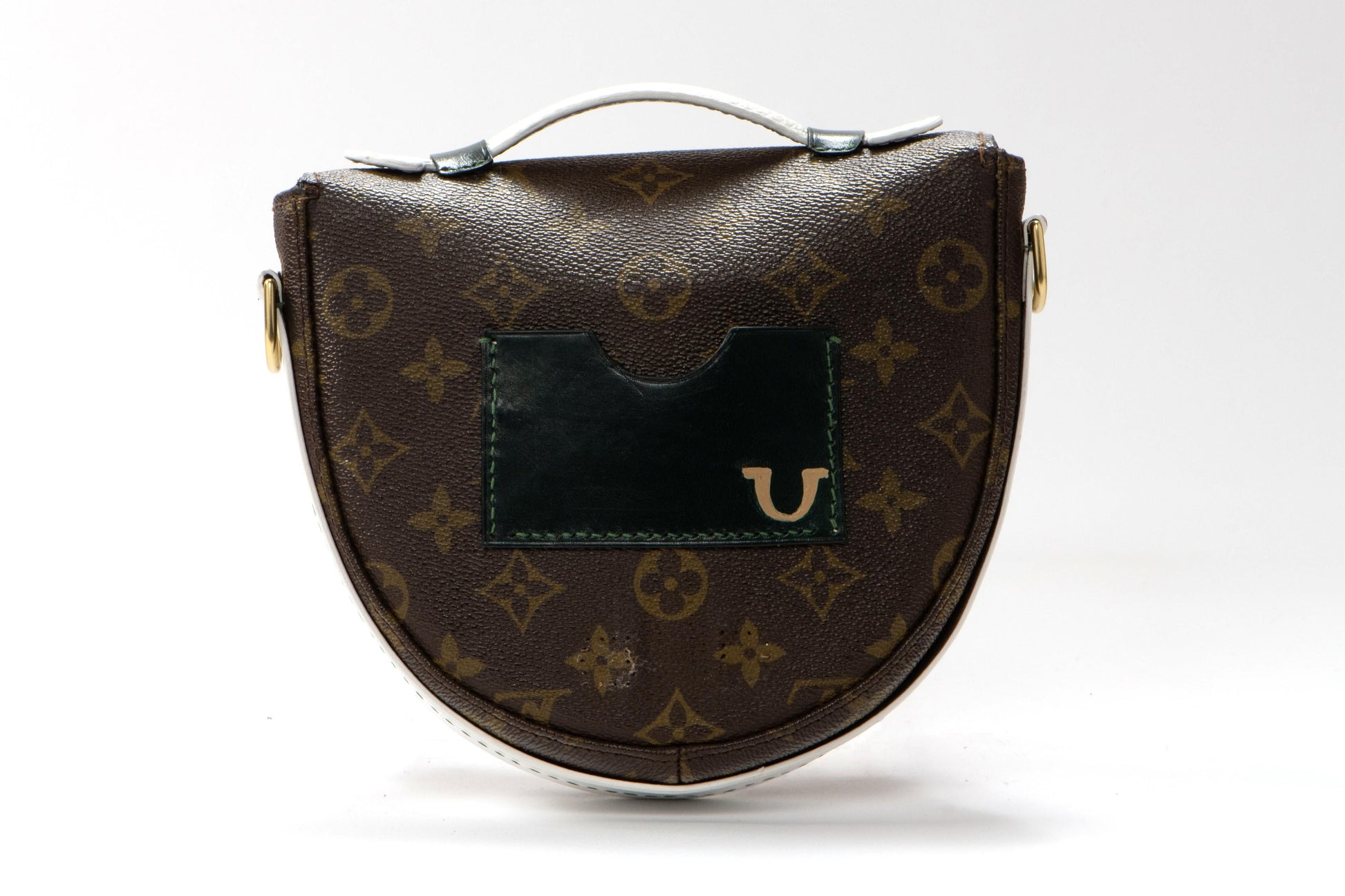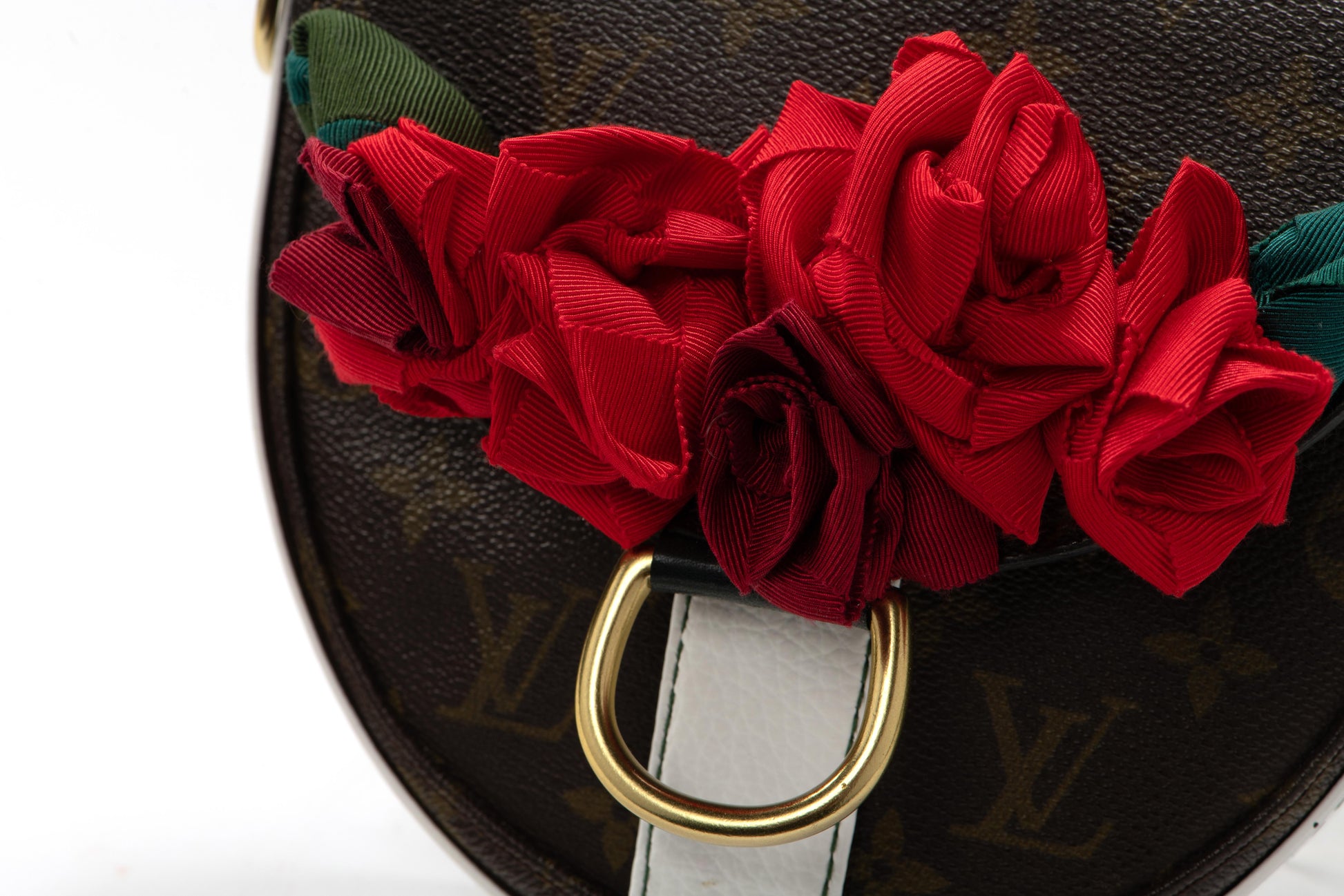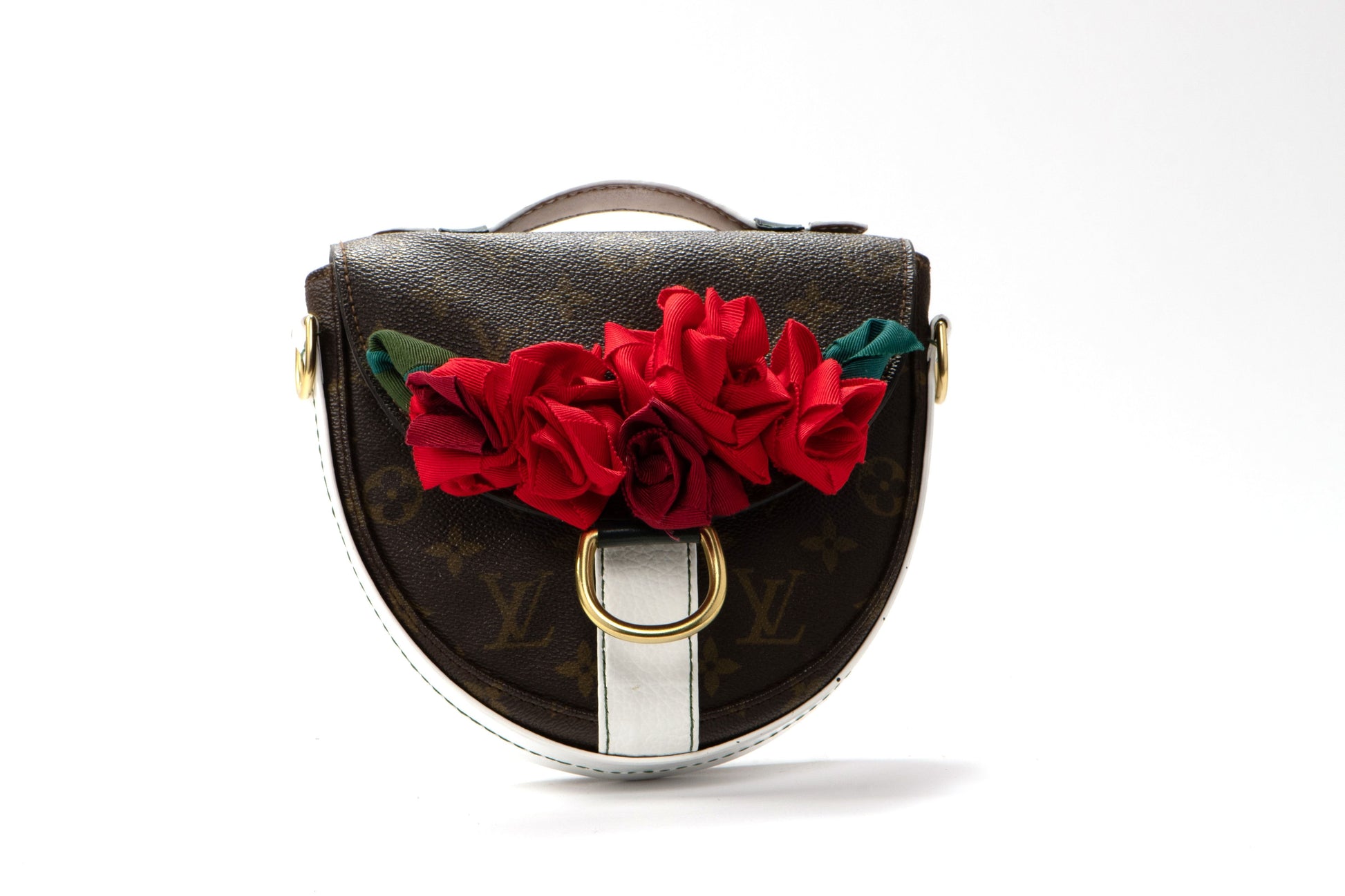 The original bag used to create this piece was an authentic LV "Chantilly" from the late 1980s. A white leather top handle was added and new white leather details replace the original leather. In addition to the handcrafted petersham roses it has new brass hardware and an added back pocket.