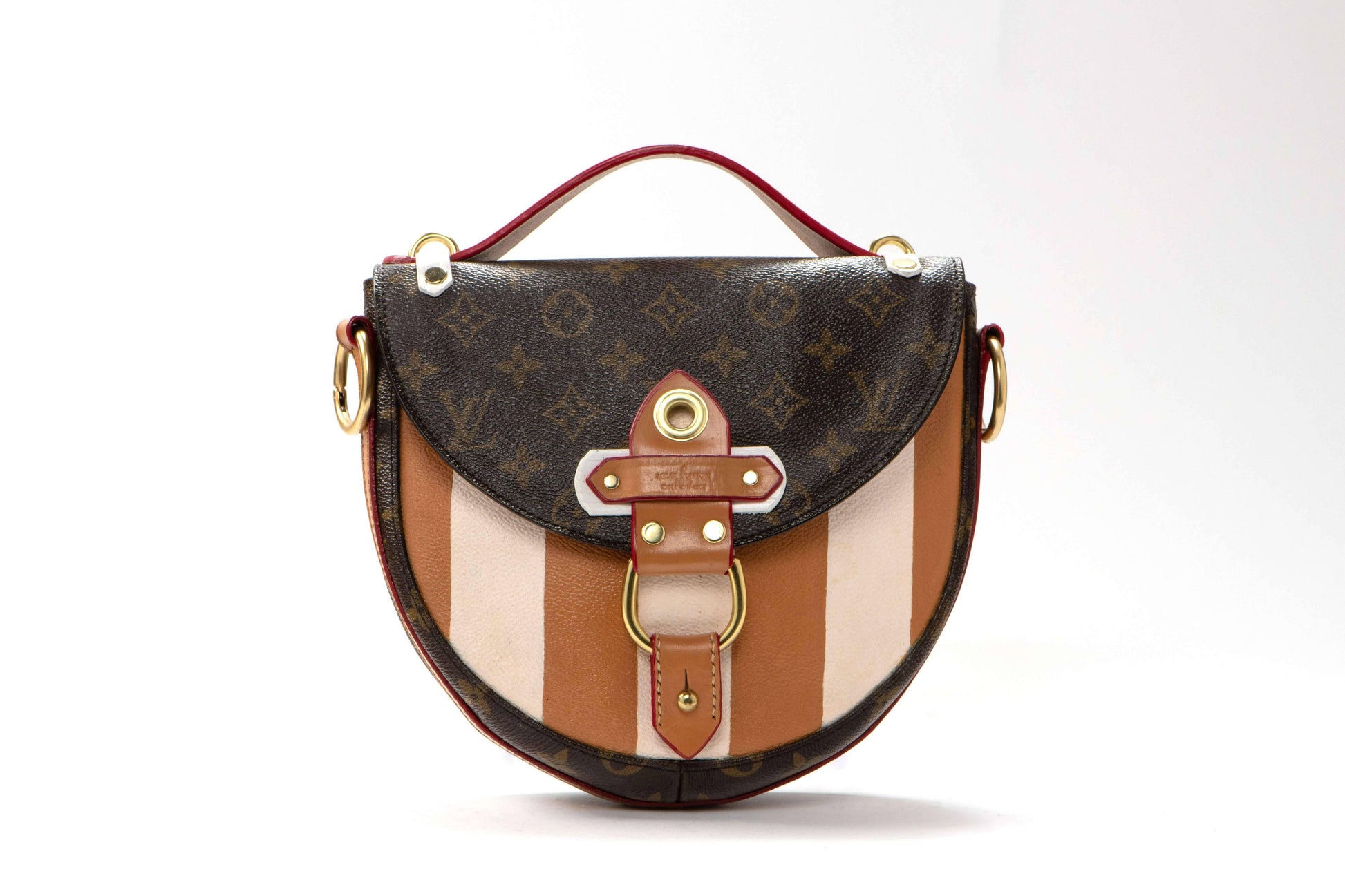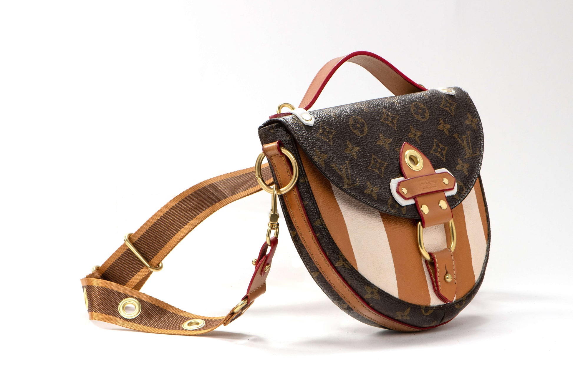 A bold reimagining of classic LV, this one-of-a-kind silhouette features hand painted stripes in warm tones of saddle and cream, set against iconic monogram canvas. Upgraded with new brass hardware, a structured top handle, and an adjustable crossbody strap, this piece effortlessly blends sport, structure, and luxury. A true standout for collectors drawn to form, function, and fearless design.