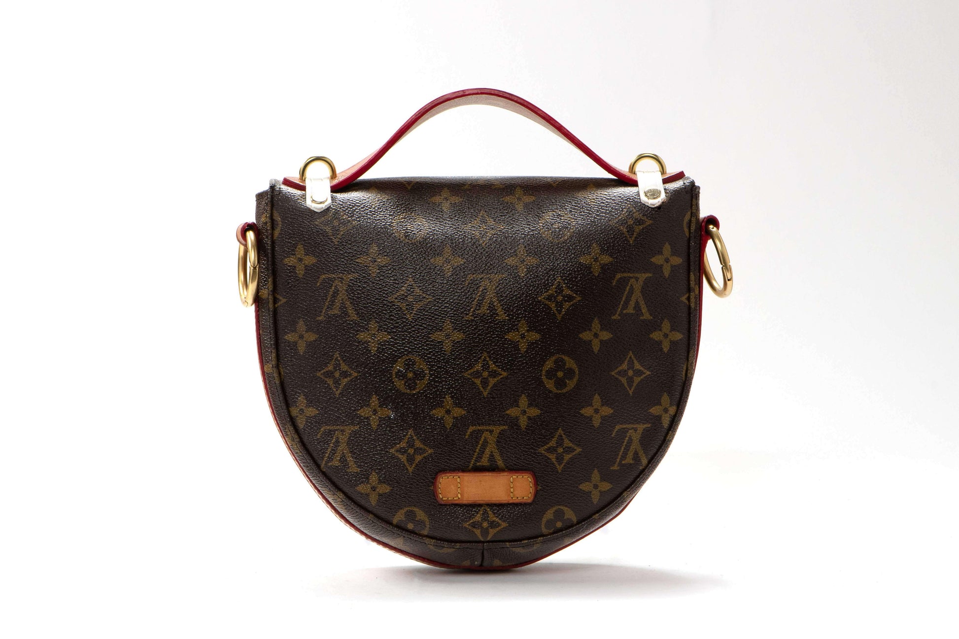The original bag used to create this piece was an authentic, vintage LV "chantilly" from the mid 1980s. Top handle, hand painting, new hardware and 1.5" adjustable crossbody strap were added.
