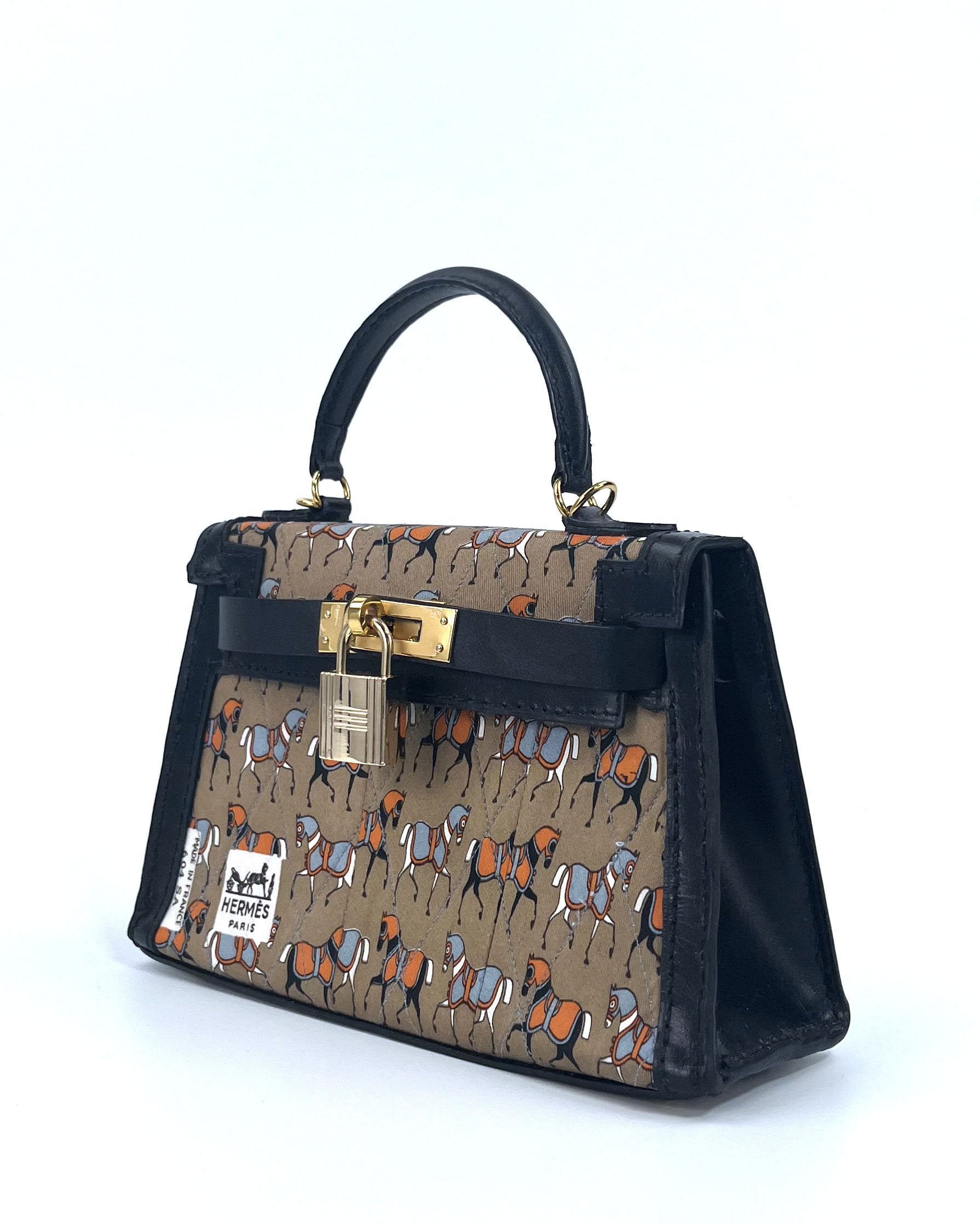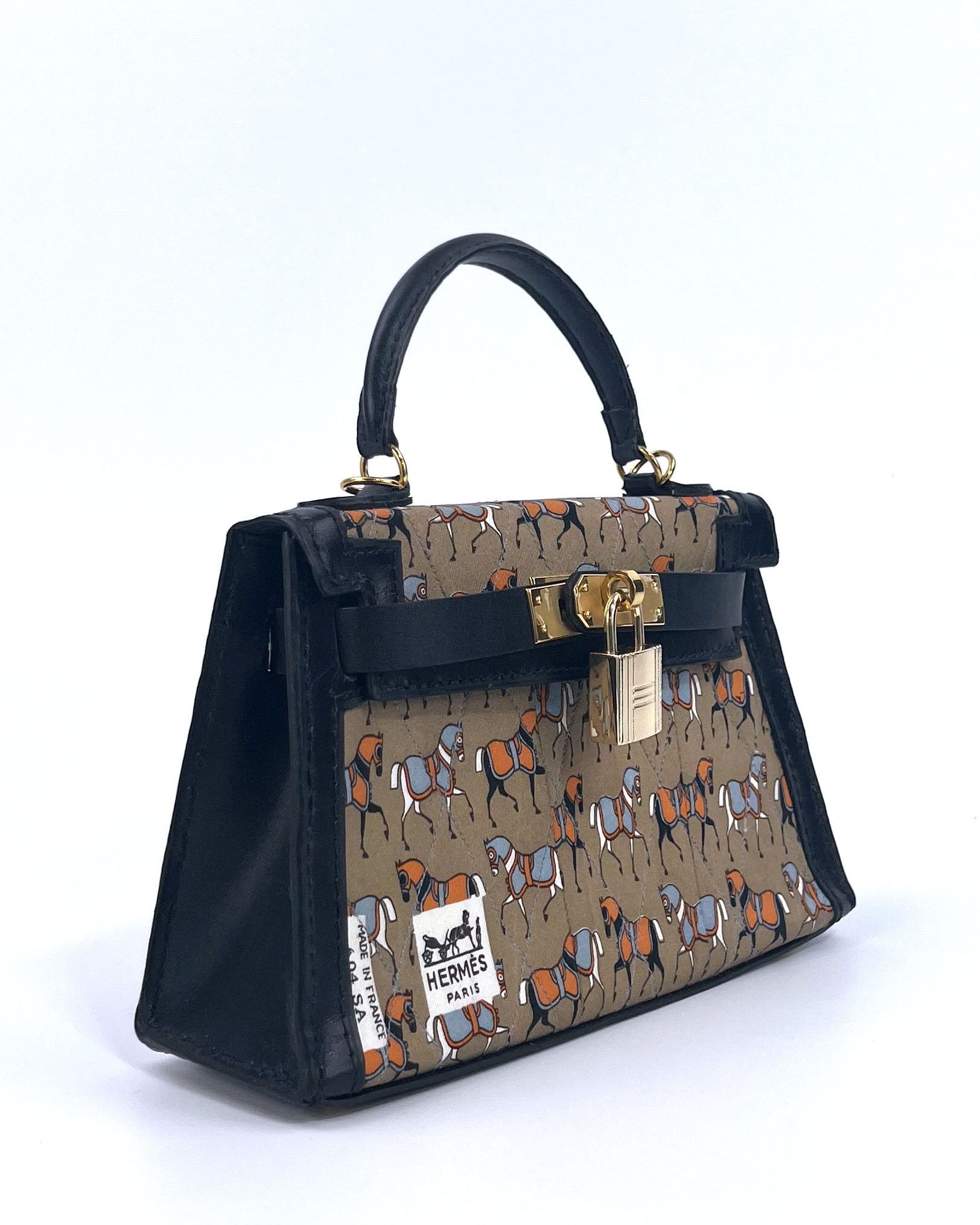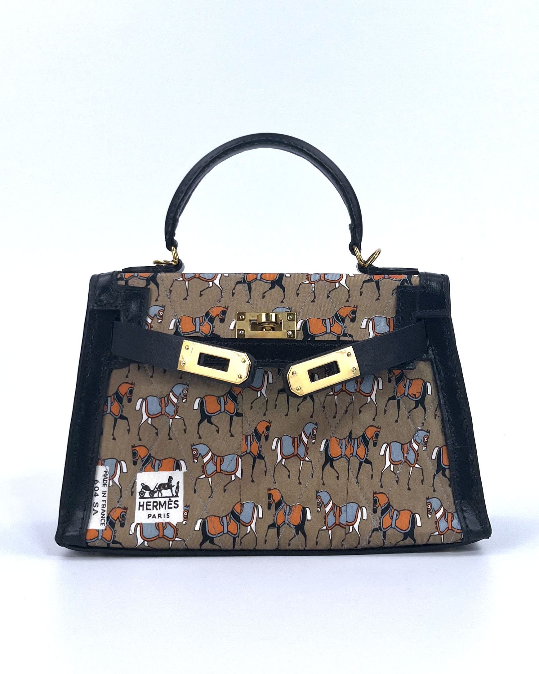 A refined one-of-a-kind creation, this handbag is handcrafted from a vintage Hermès silk tie featuring elegant equestrian motifs in warm tones of chestnut and orange. The silk is paired with sleek black epsom leather and finished with premium gold-tone hardware, creating a striking balance of texture and sophistication. A modern statement piece with timeless Hermès heritage.