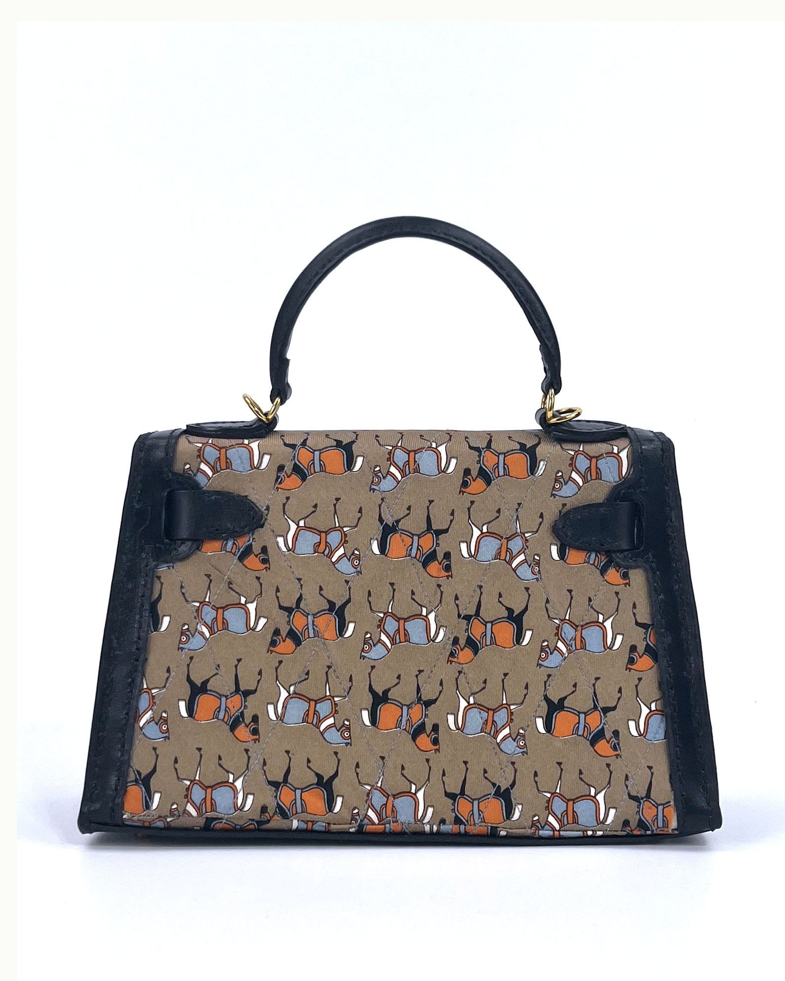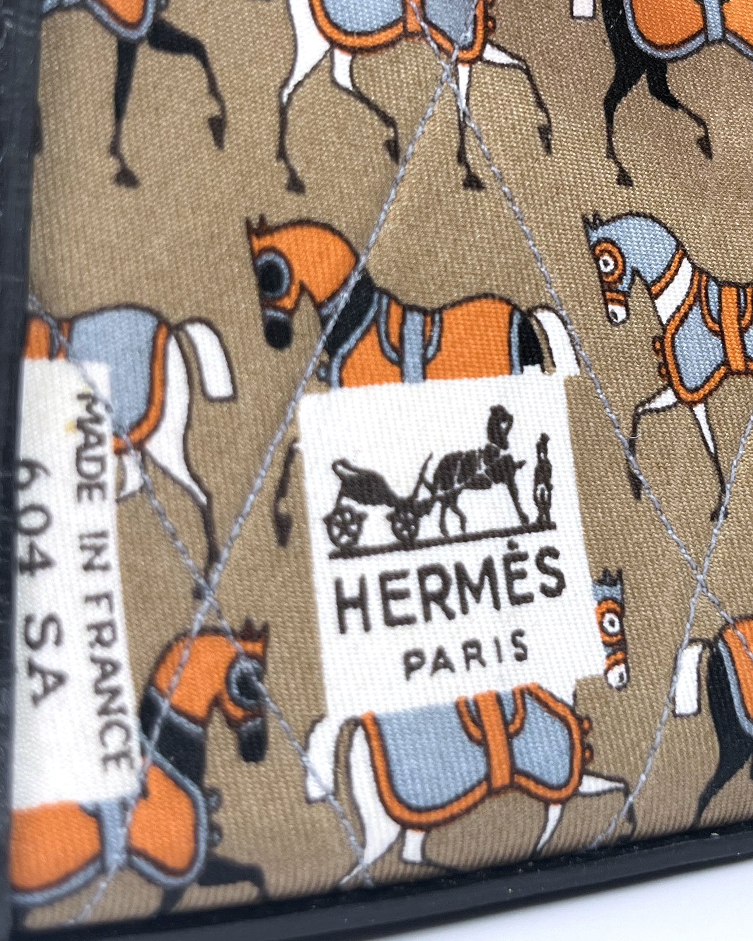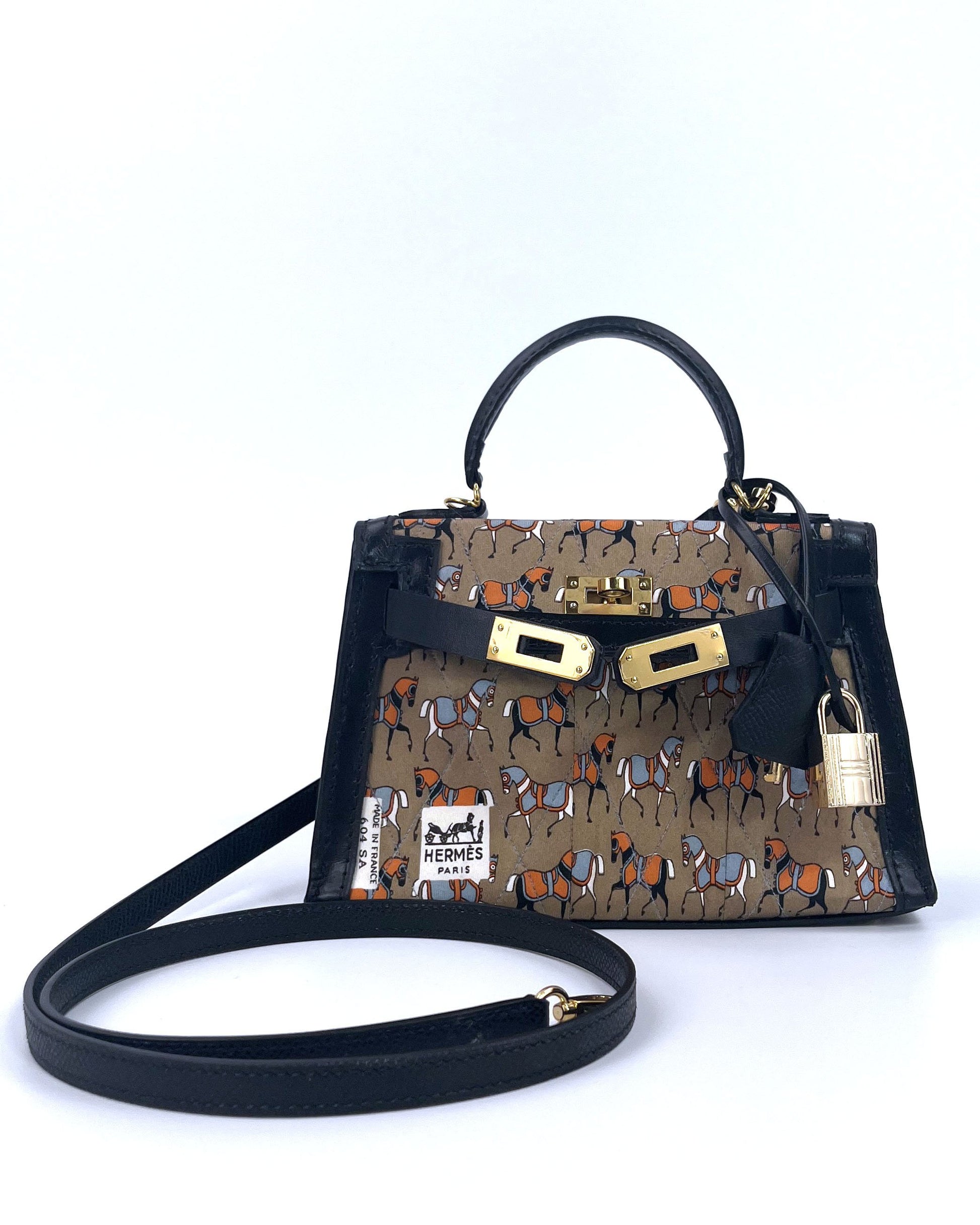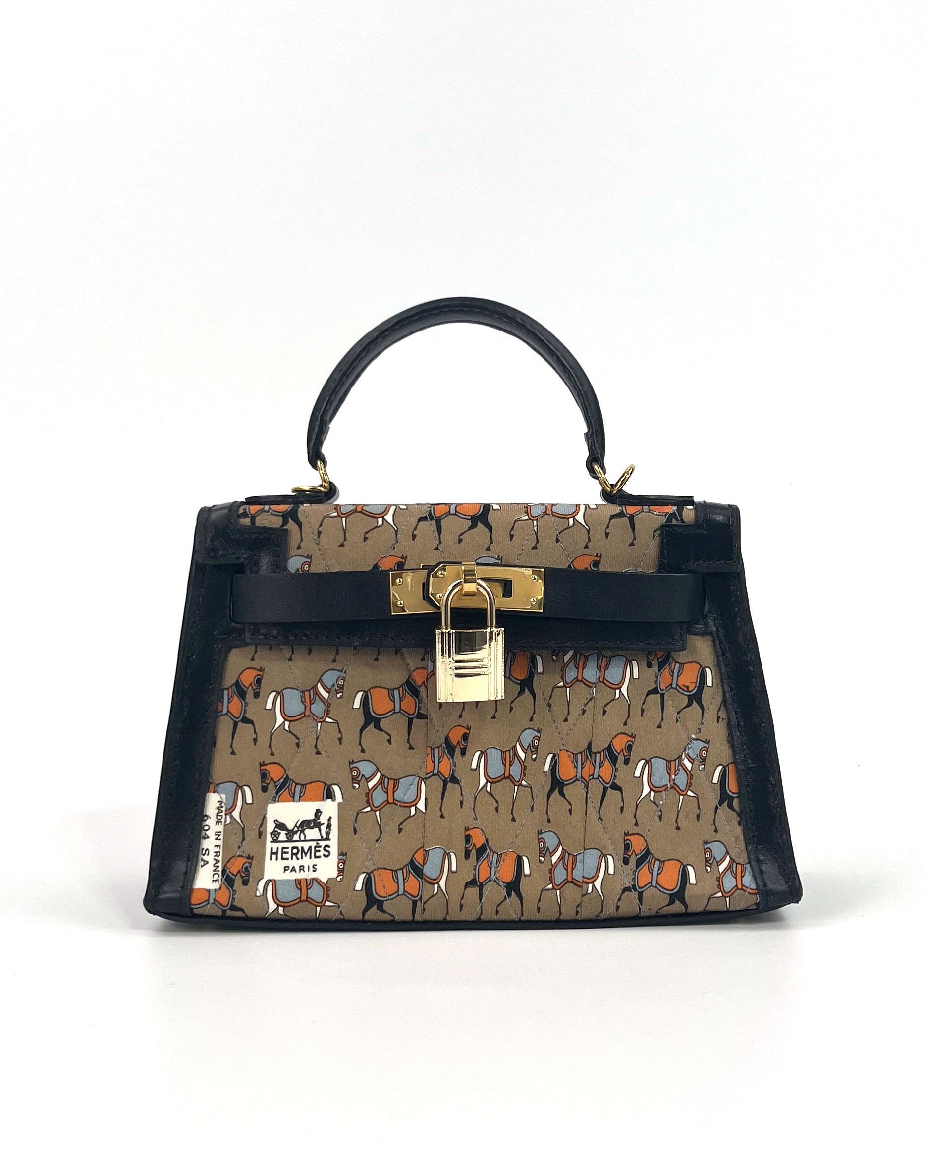 A refined one-of-a-kind creation, this handbag is handcrafted from a vintage Hermès silk tie featuring elegant equestrian motifs in warm tones of chestnut and orange. The silk is paired with sleek black epsom leather and finished with premium gold-tone hardware, creating a striking balance of texture and sophistication. A modern statement piece with timeless Hermès heritage.