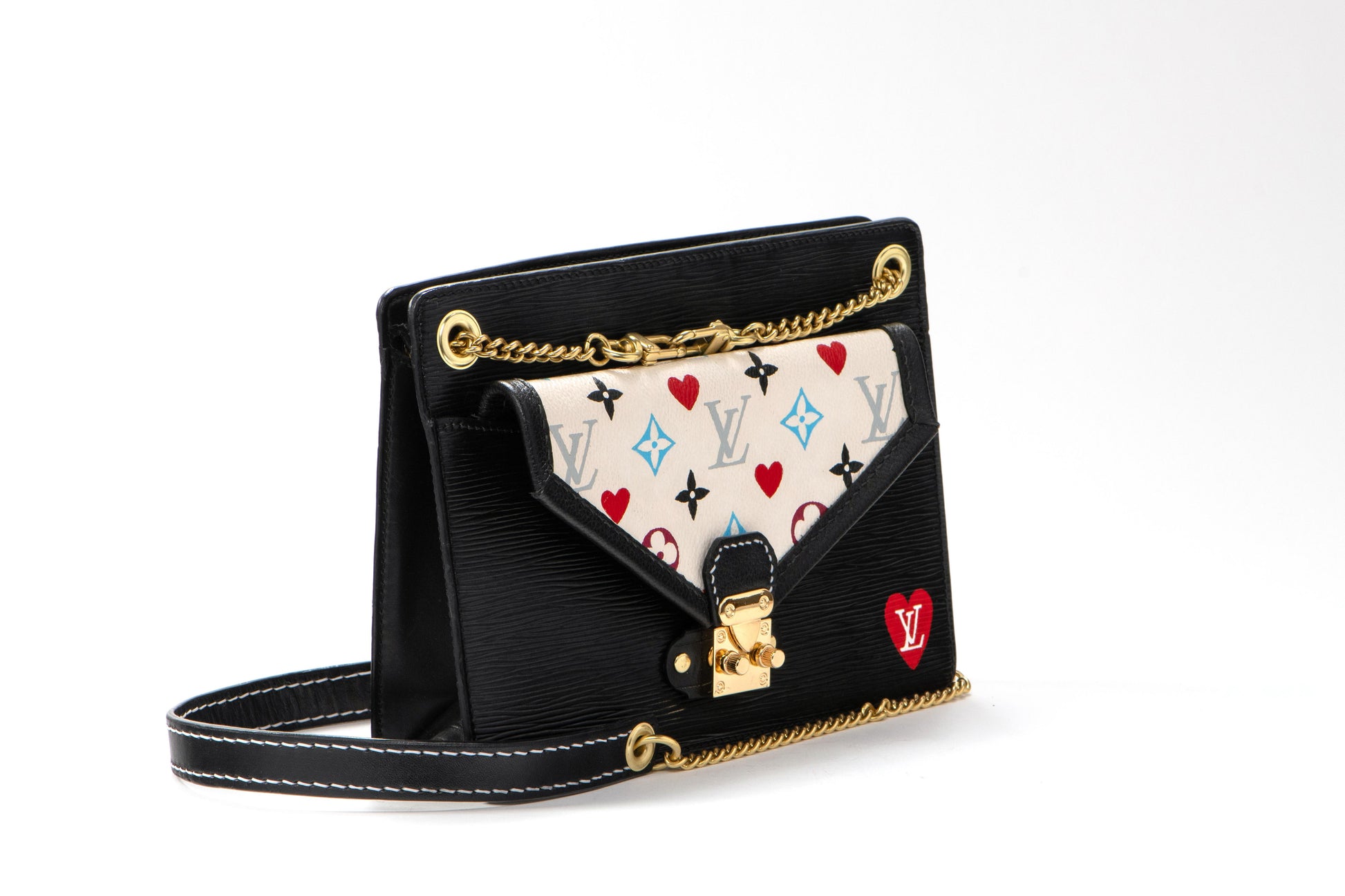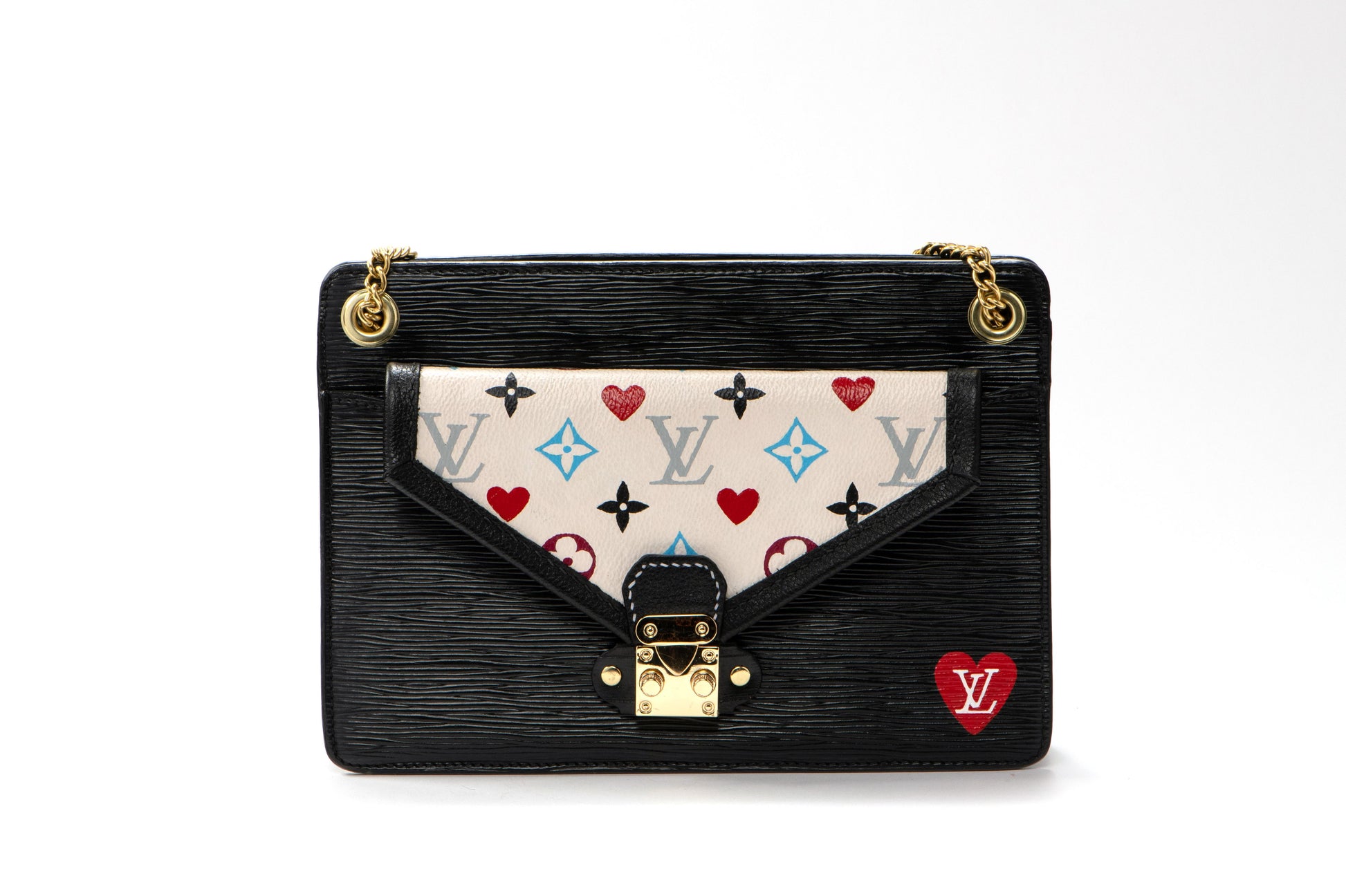 A romantic reimagined handbag featuring white multicolor canvas adorned with playing card motifs in vibrant red and blue. This extraordinary piece combines luxury craftsmanship with playful artistry, featuring original black epi leather, brass chain convertible crossbody strap, and charming padlock details. The perfect fusion of sophistication and creative expression that makes this a true collector piece.