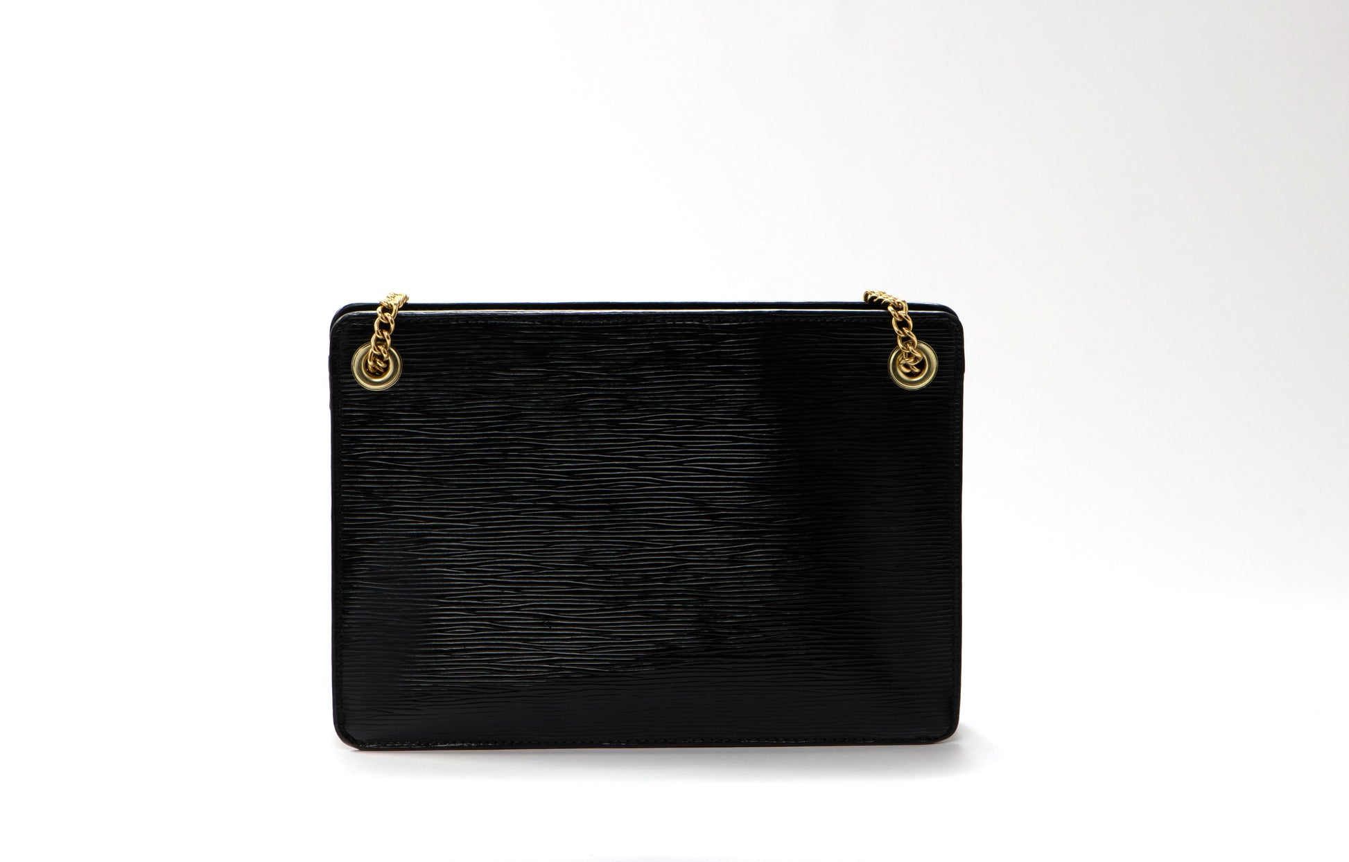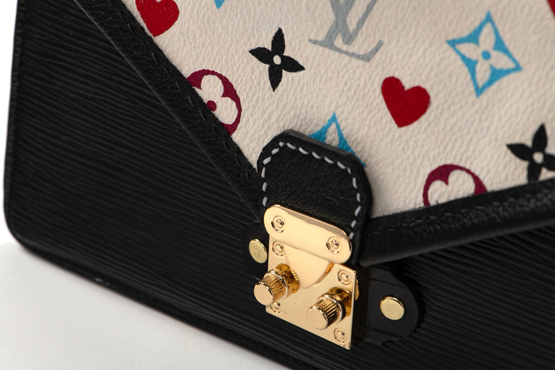 The original bag used to create this piece was an authentic LV epi leather "pochette homme" from the late 1980s. The flap closure is made from authentic LV monogram, repainted to reflect the theme of the bag.