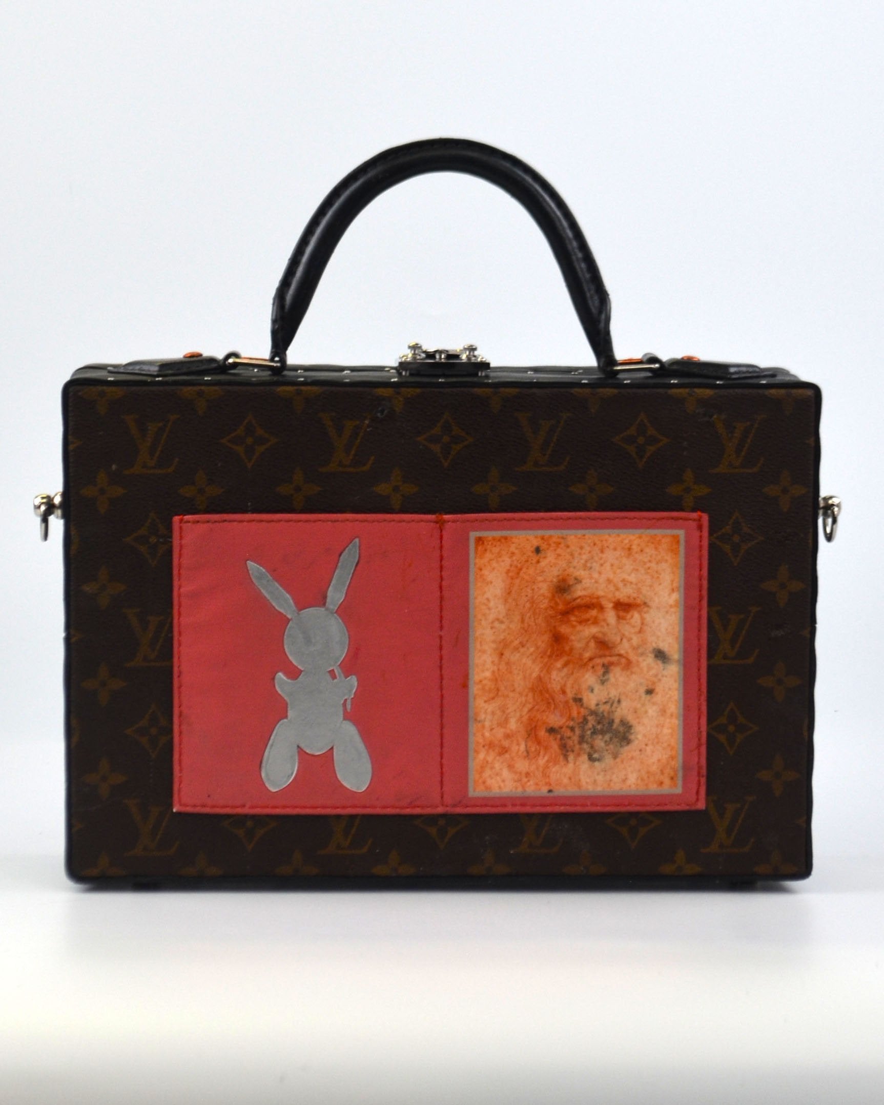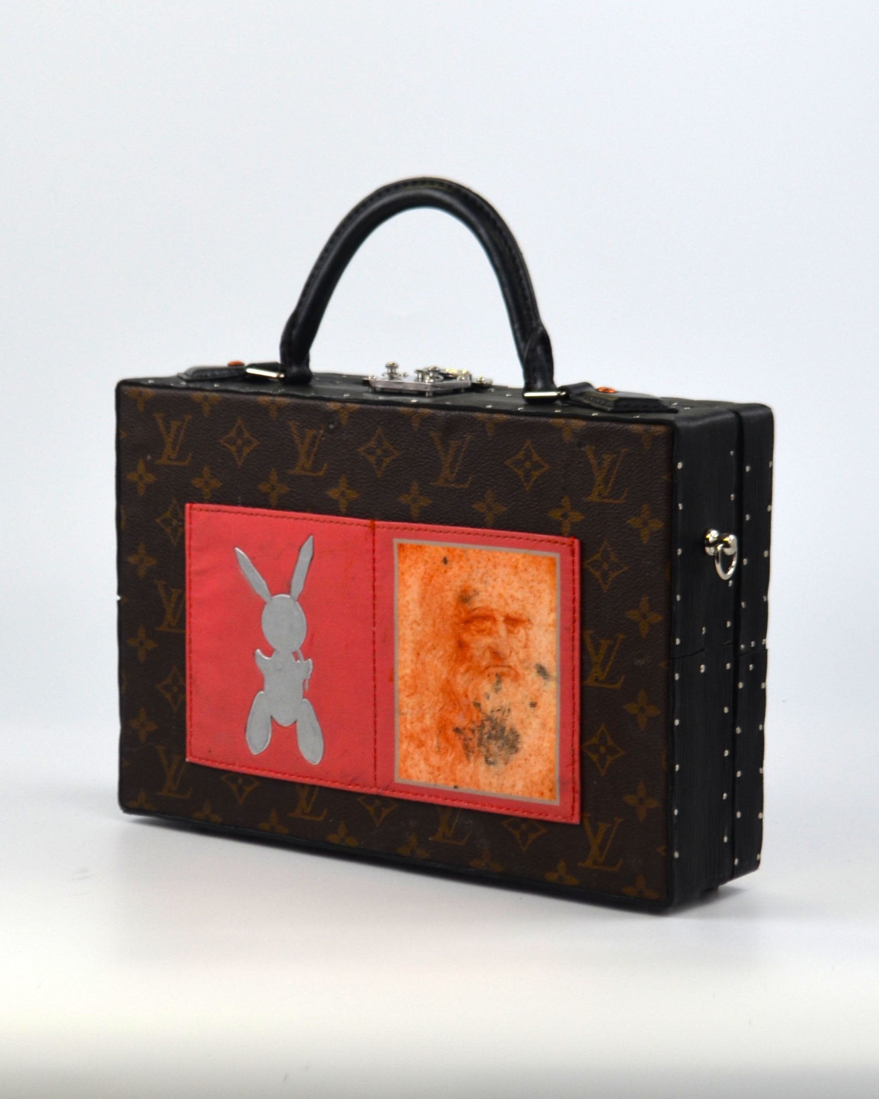 A rare, one-of-a-kind trunk-style handbag crafted from authentic LV canvas from the iconic jeff koons collaboration. Featuring the unmistakable gaze of da vinci’s mona lisa, overlaid with metallic LV motifs and bold signature accents, this piece blends artistic reverence with luxury street-style edge. Structured with studded sides, black epi leather trim, and gleaming silver hardware, it’s a collector’s masterpiece where fashion meets fine art.