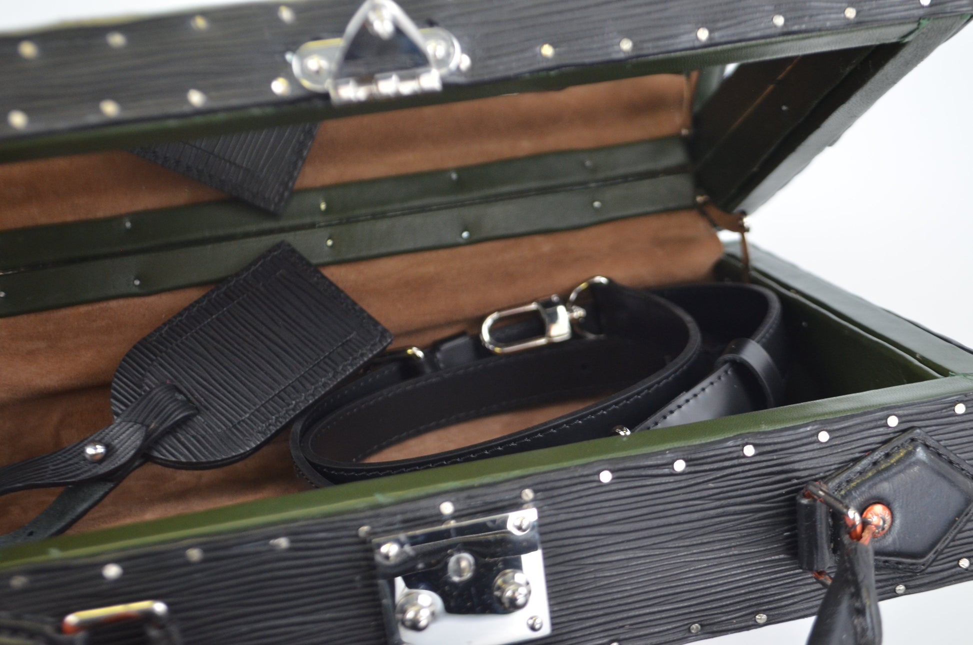 This piece was handcrafted using authentic LV speedy 25 monogram canvas from the Jeff Koons X LV collaboration. The original interior pocket featuring the jeff koons stamp is displayed on the back of the piece. The interior is lined with dark green lambskin, taupe suede and mirror feature.